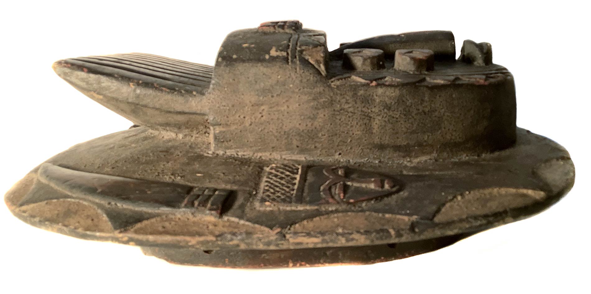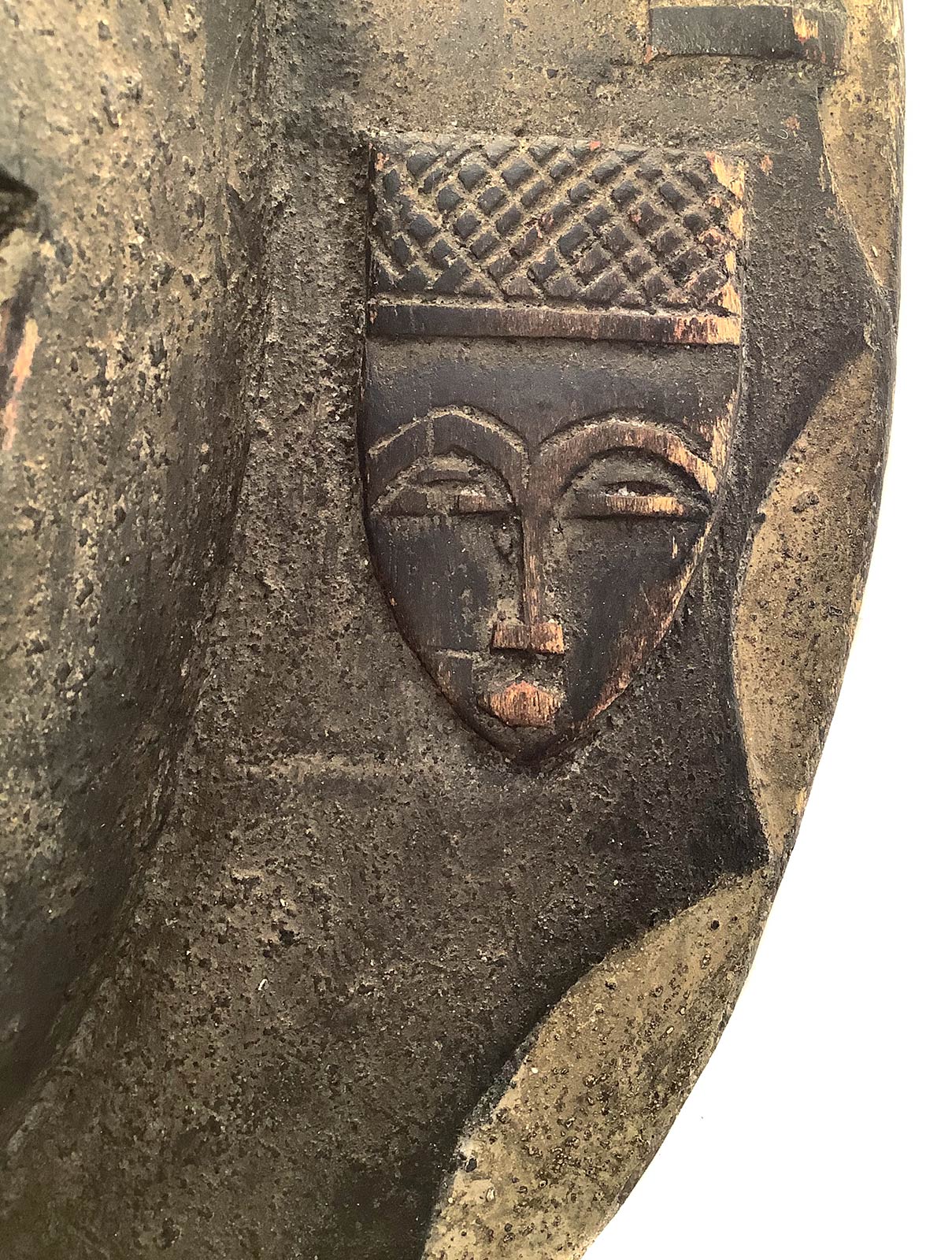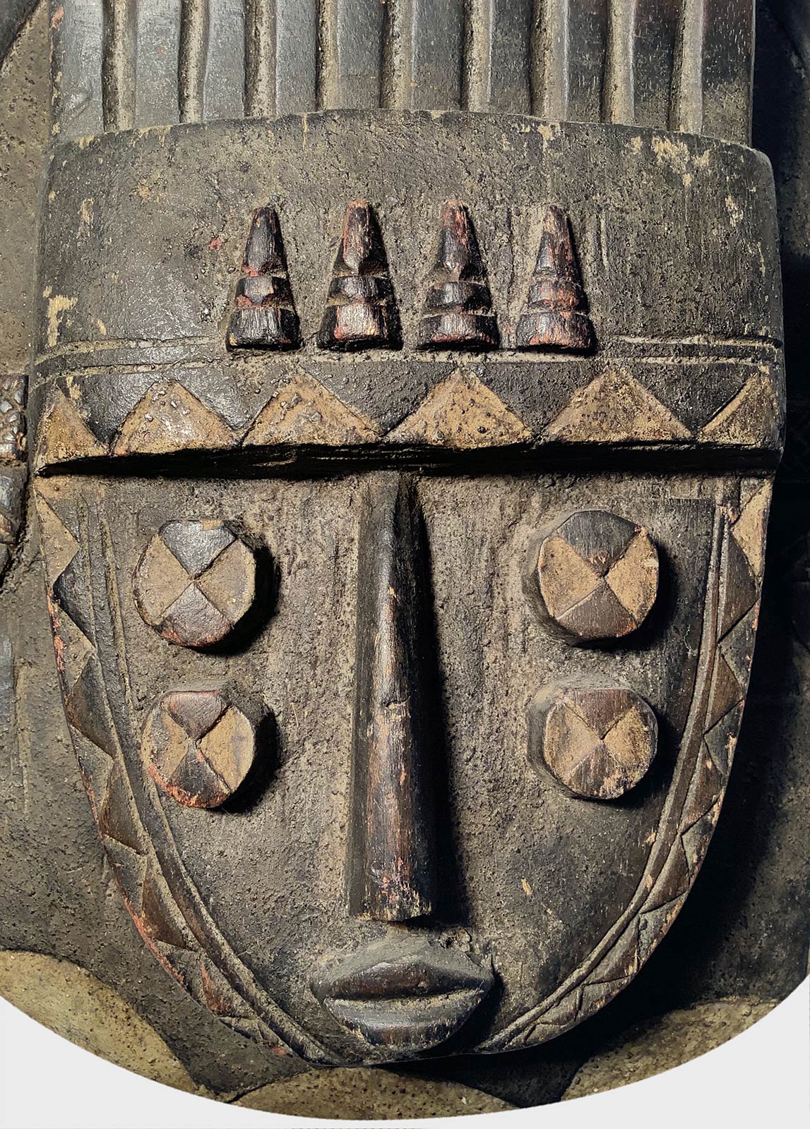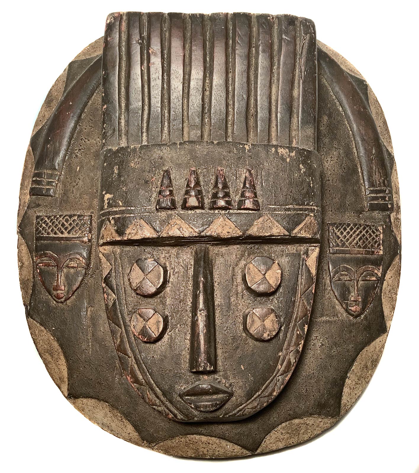 Maschera africana. XX secolo, in legno scuro e parti laccate. Cm 39x33