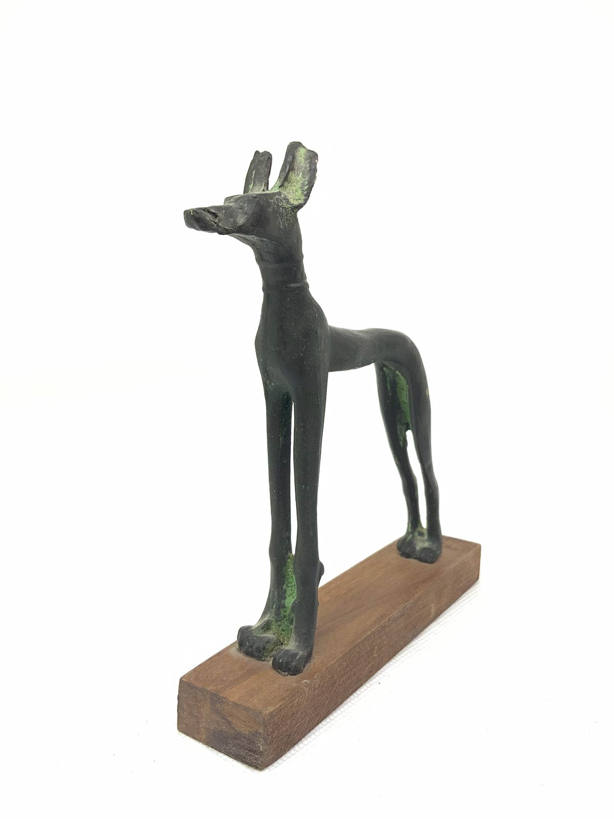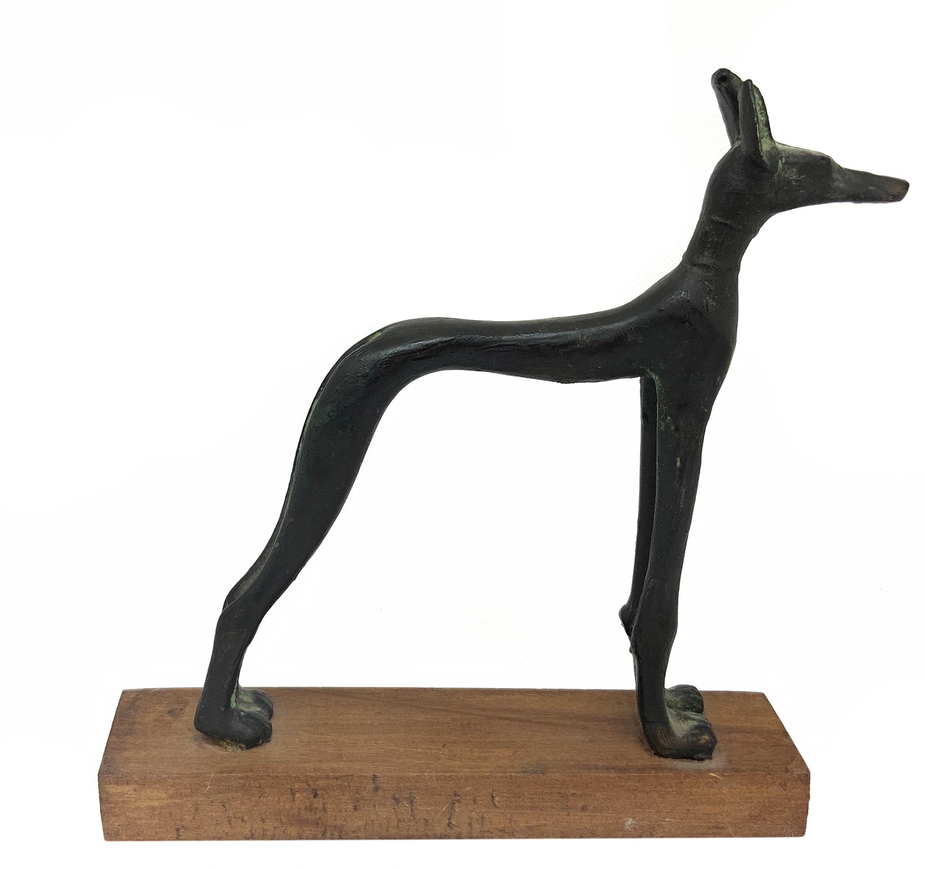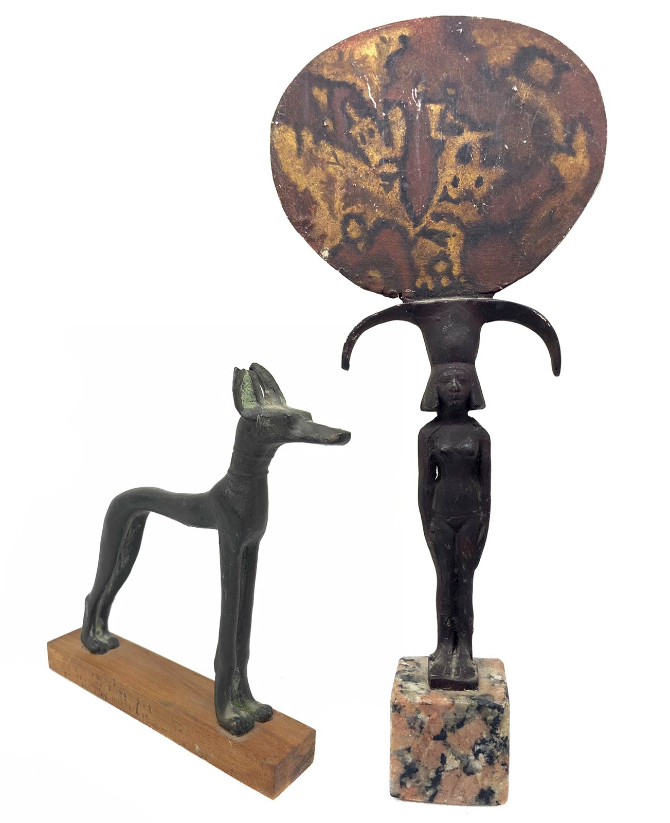 Specchio in ferro e statuetta in ferro raffigurante cane. Cm 28 e cm 15. Egitto, anni ’50.