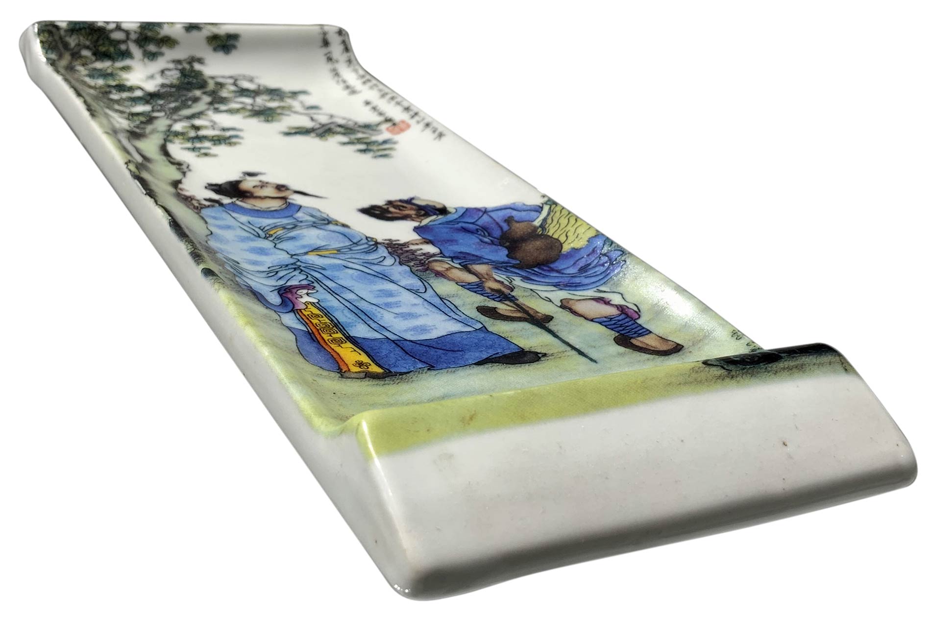 Quattro portainchiostro in porcellana decorati con figure della tradizione tao. Cina, XX secolo. Cm 22,50 x 8 x 3