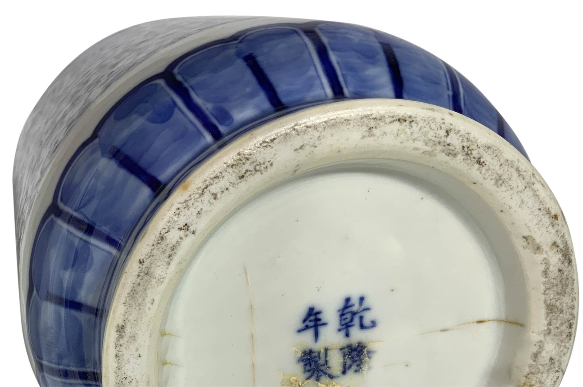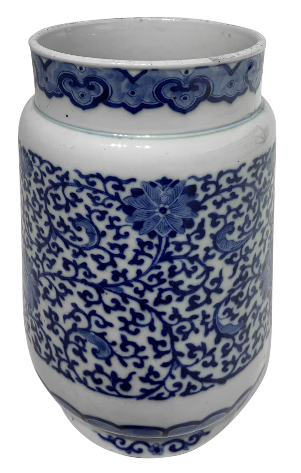 Vaso cinese con decori blu, inizi XIX Secolo. H cm 23, base 10,5 x 12. Filato