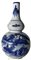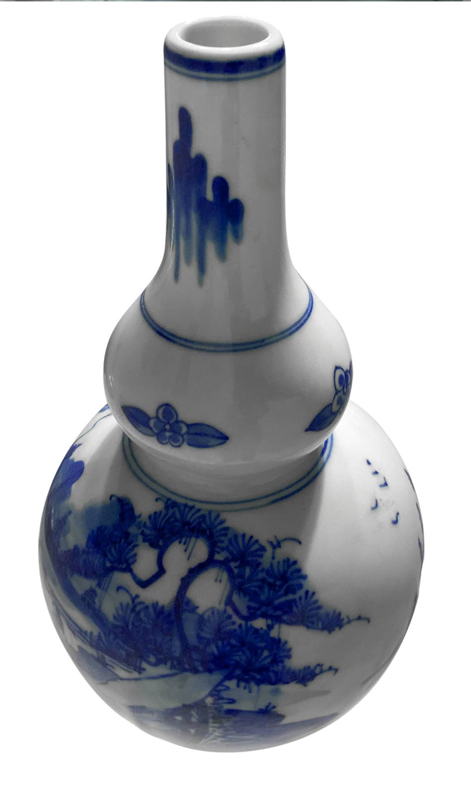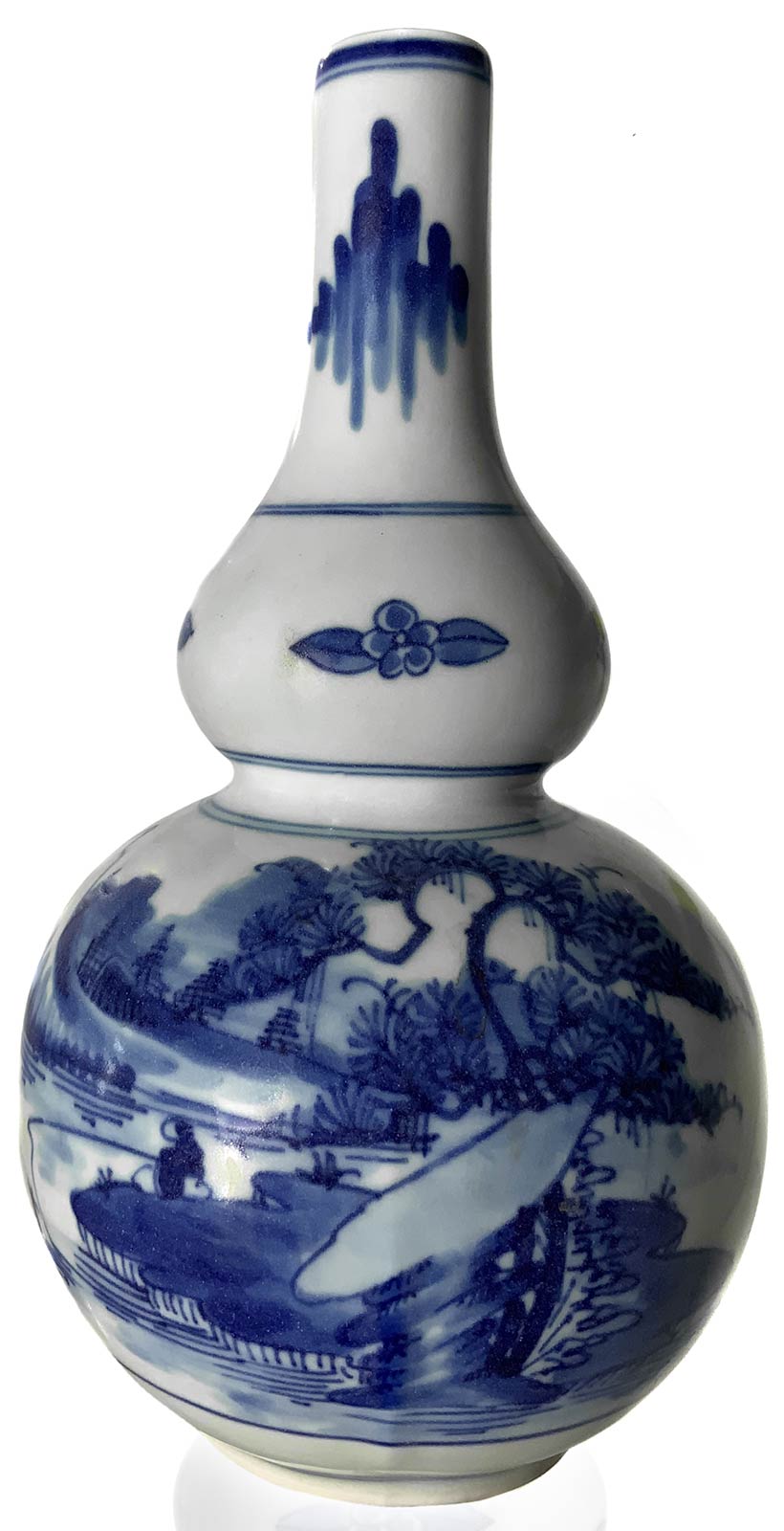 Vaso cinese in porcellana a doppia zucca e decorazione di paesaggio fluviale nei colori del blue/bianco, con marchio di “lunga vita” alla base. Cina, XX secolo. Cm 21 x 11.