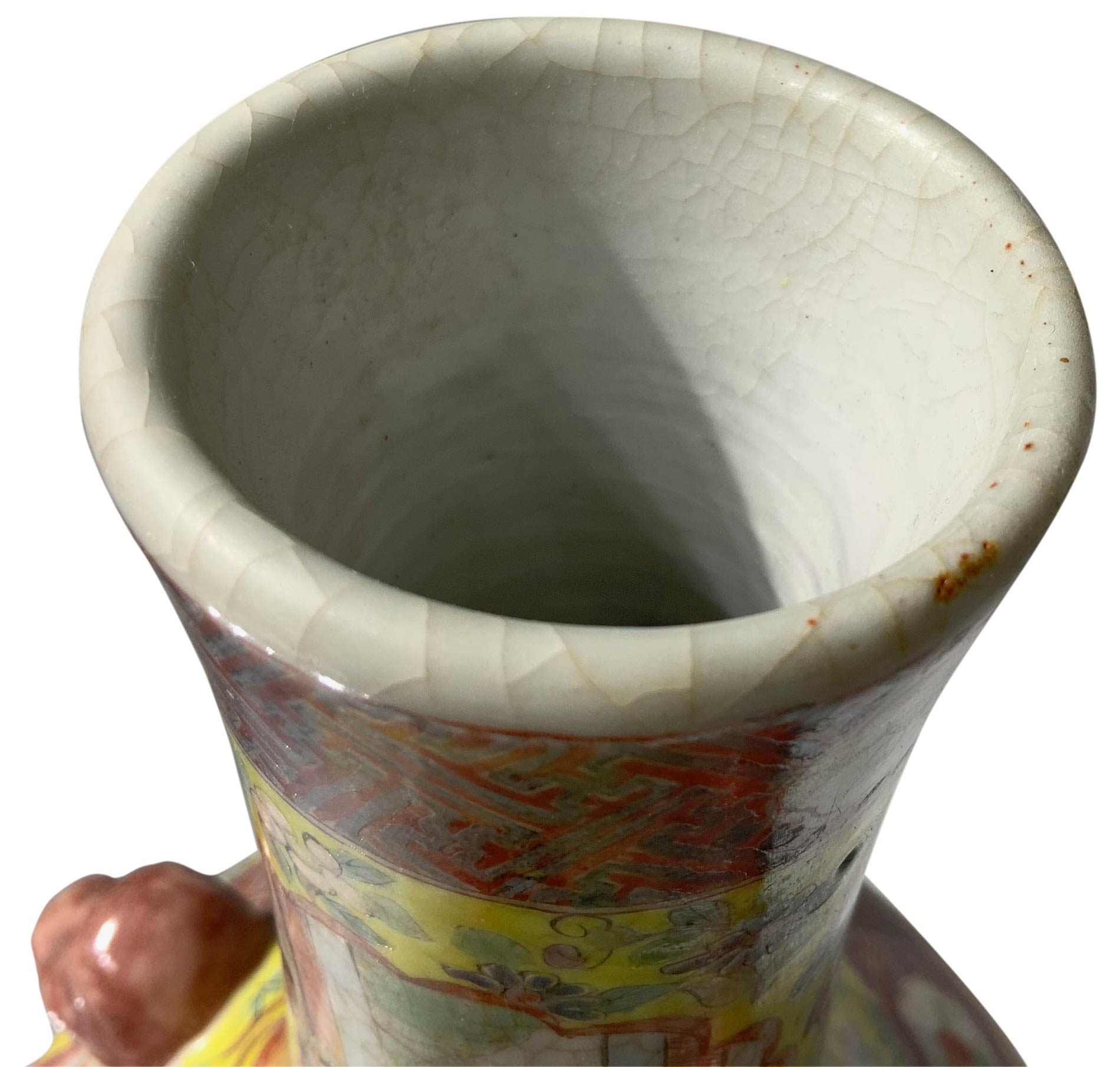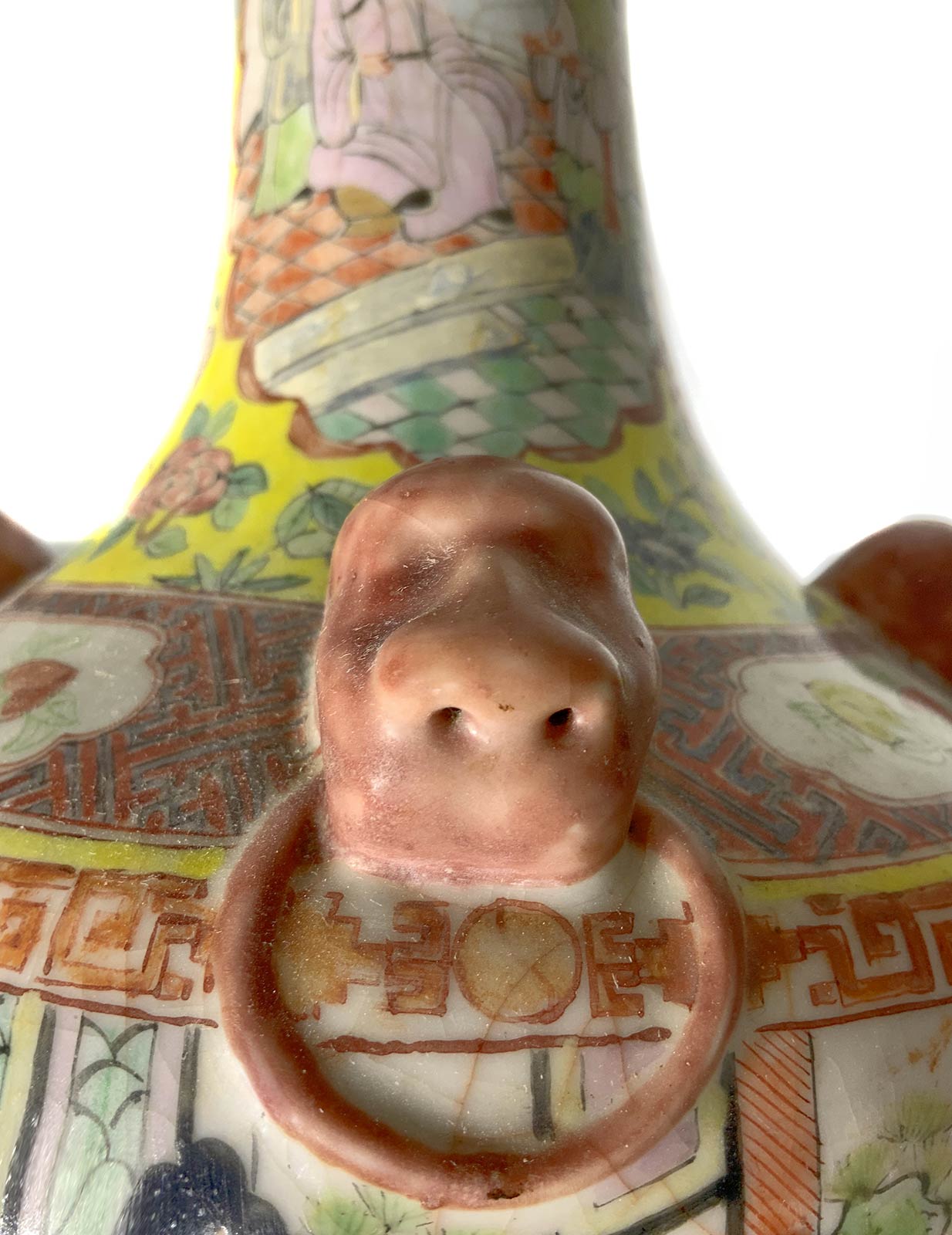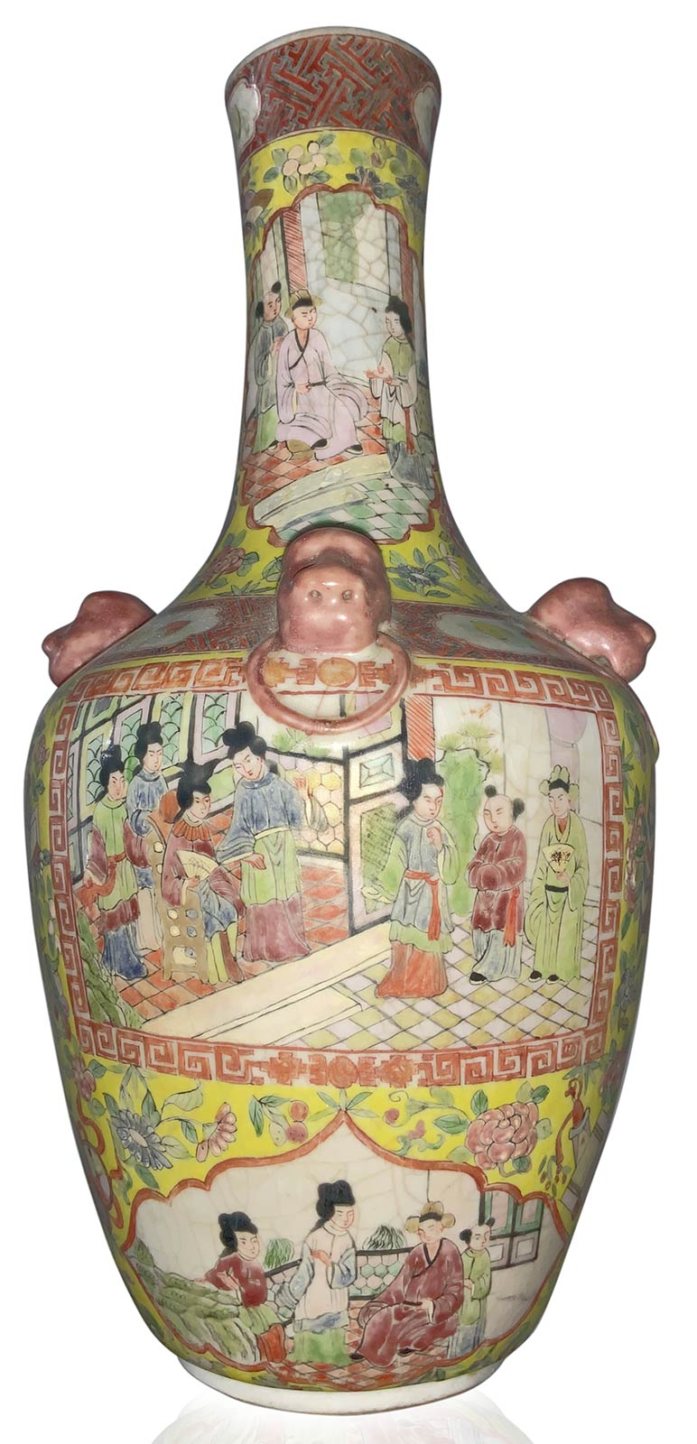 Vaso cinese in porcellana nello stile cantonese, con ricche decorazioni di scene di vita di corte, fiori e teste di leoni a rilievo. Cina, XIX,XX secolo. Marchio alla base. Cm 36x17. Peso kg 2,4.