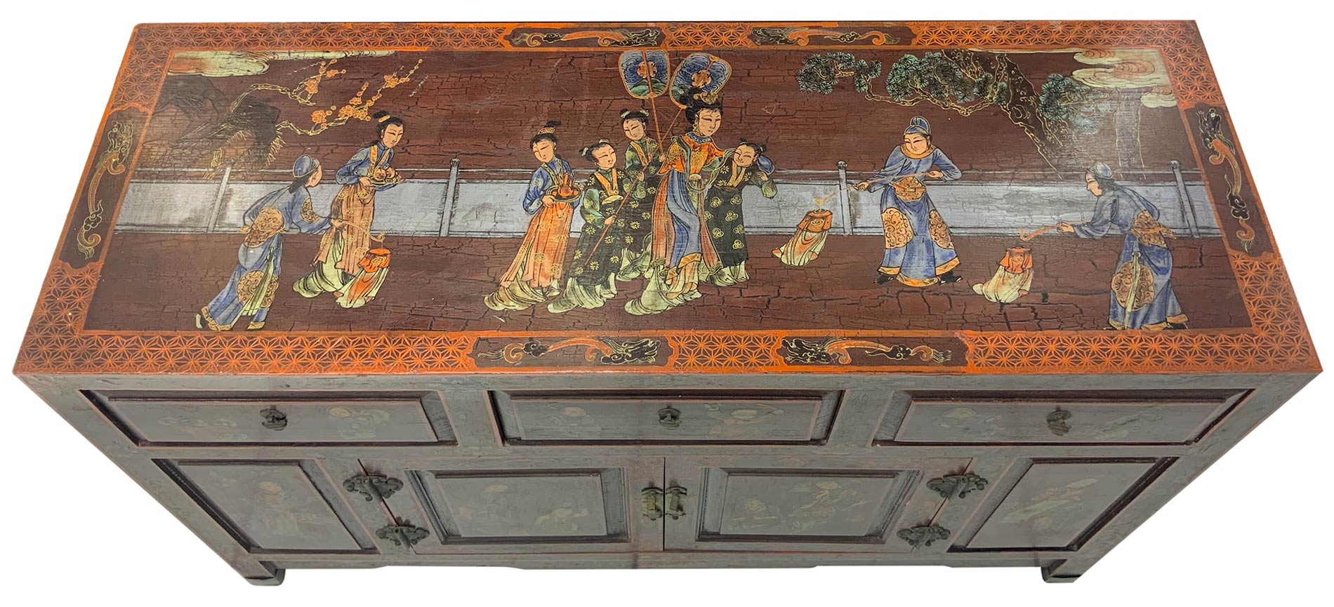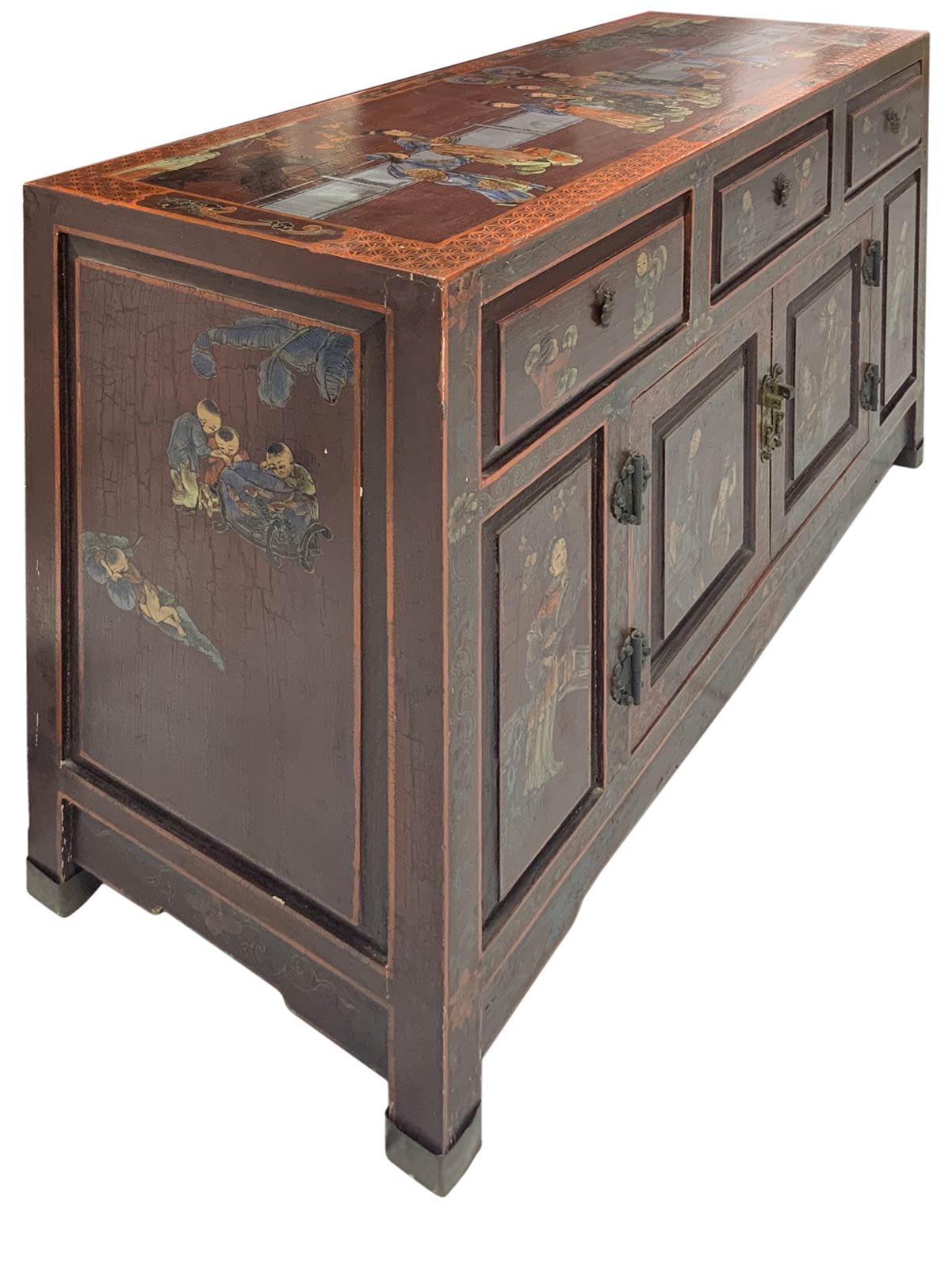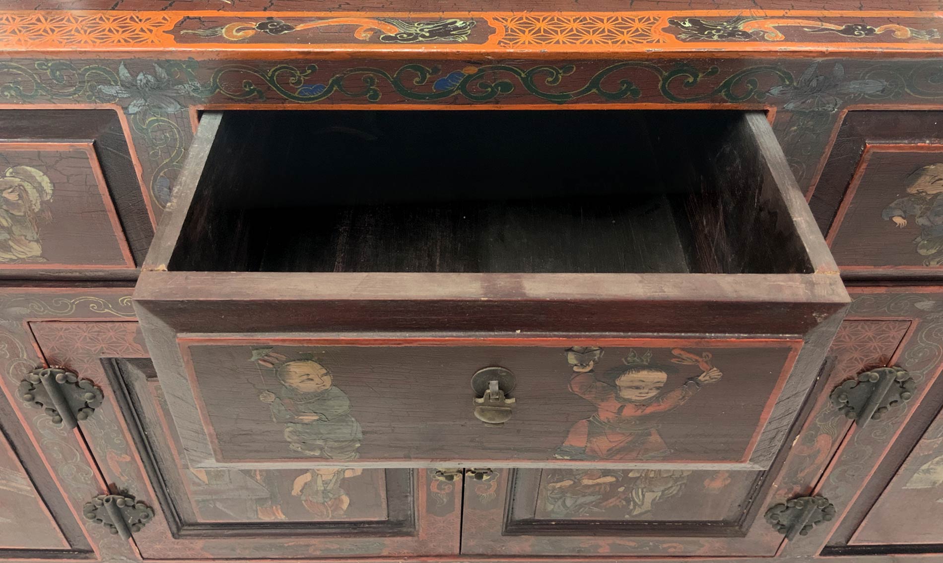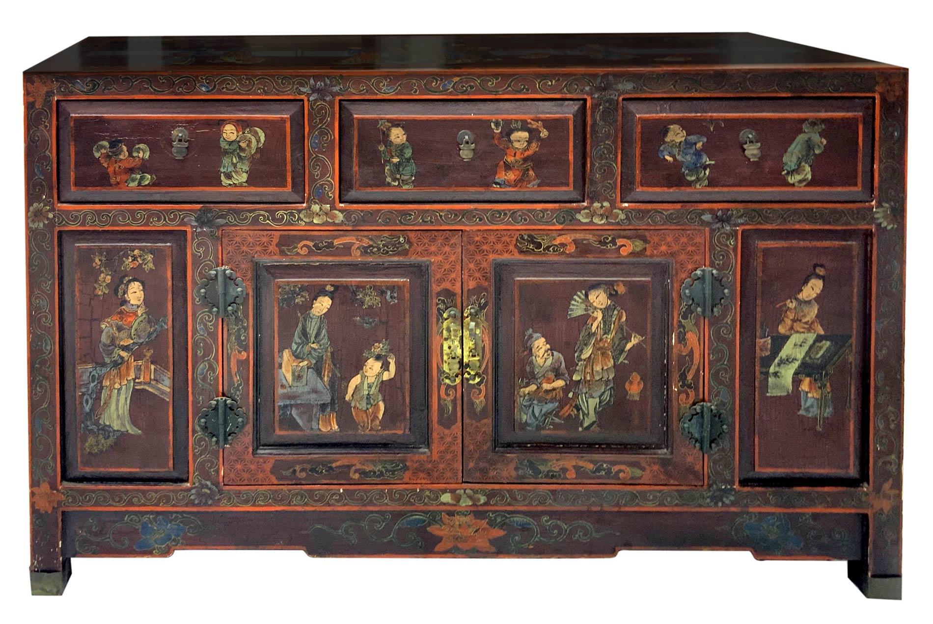Mobile cinese in legno laccato con scene di genere, Cina, anni ’60. Dipinto a mano. H Cm 76, Cm 122x43