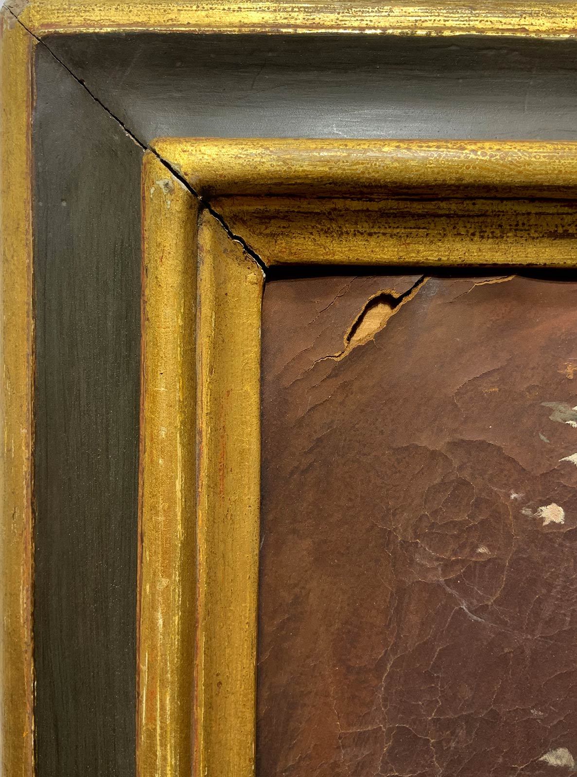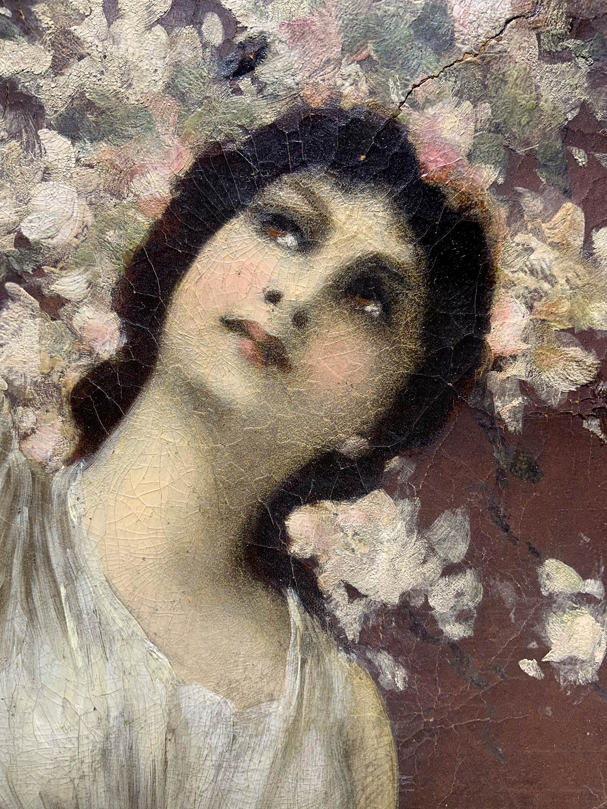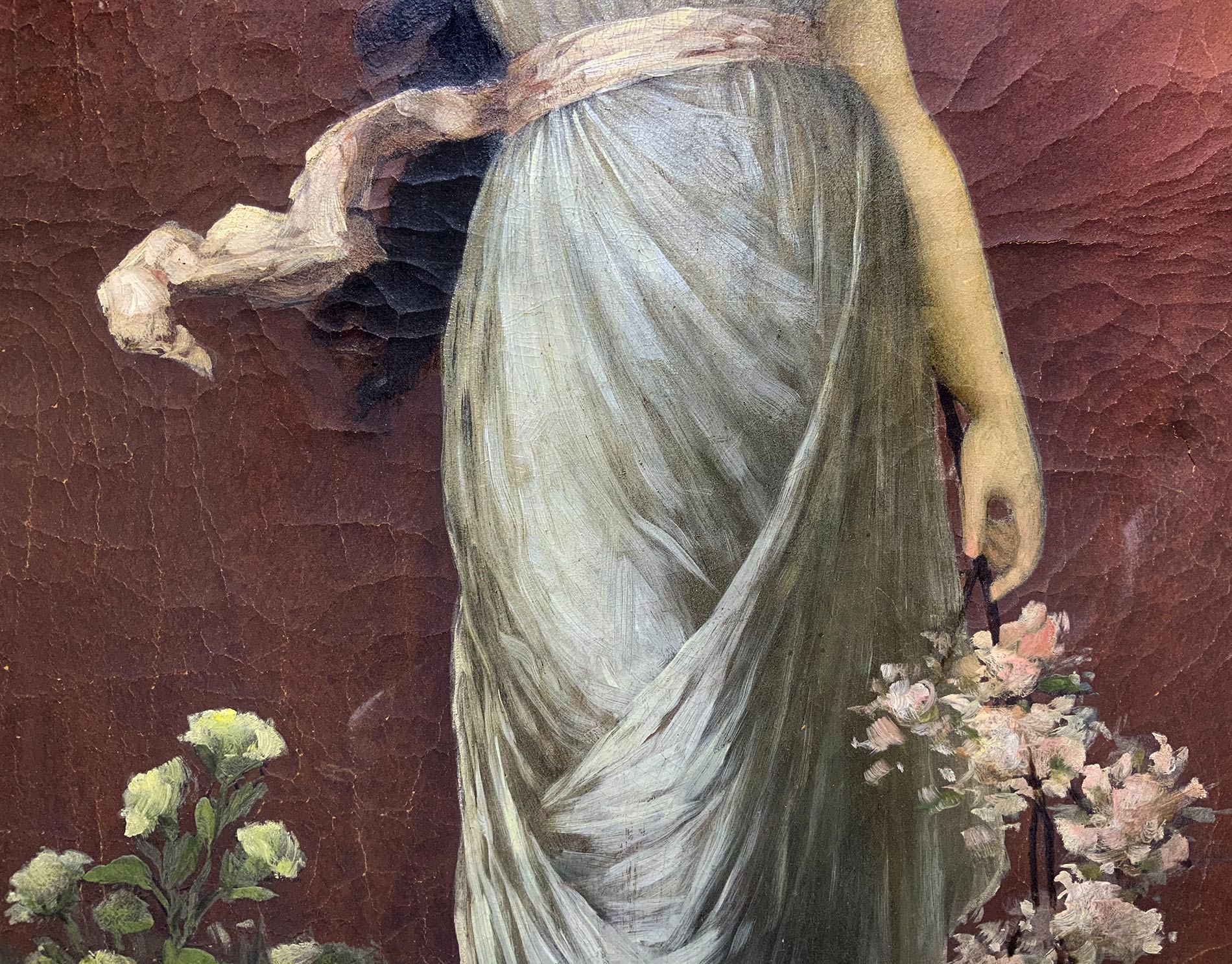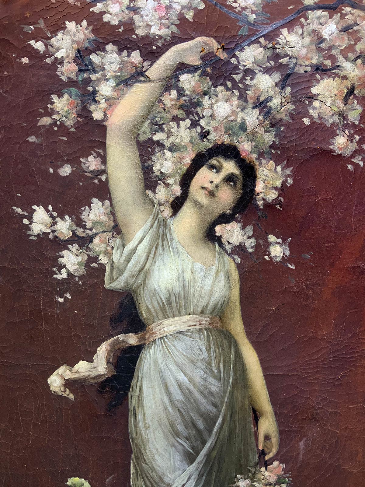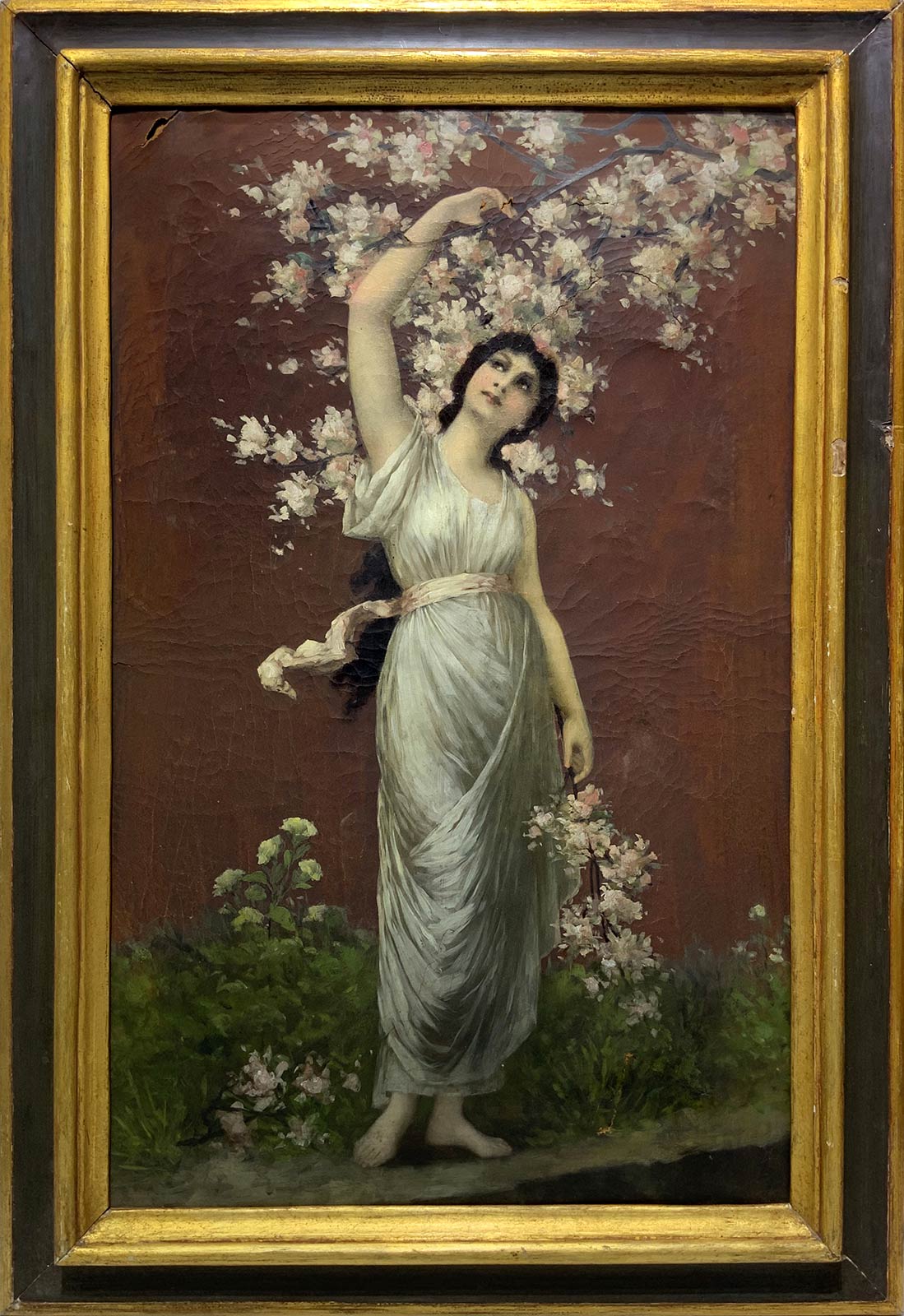 Dipinto ad olio su pelle di daino raffigurante allegoria della primavera, fine XIX secolo, Italia. Cm 75x 50. Mancanze