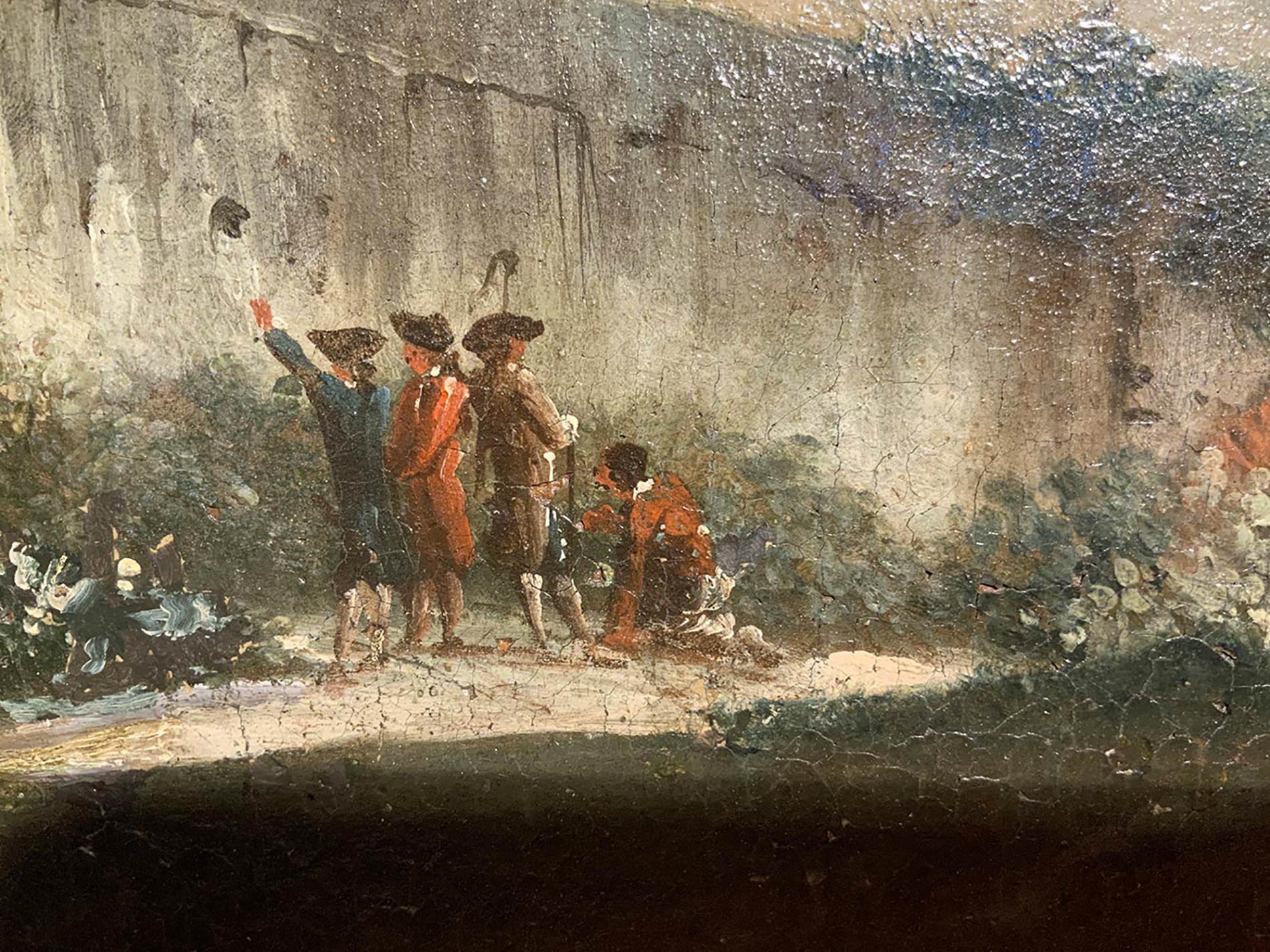 Andrea Locatelli (Roma 1693-1741), Attribuito. Veduta del Tevere a carattere archeologico con personaggi. Da collezione privata. 56x110, olio su tela. "Pittore di paesaggi contribuì a rappresentare la campagna romana, quale espressione di un ideale di vita pastorale, ispirazione di una nuova cultura che si differenzia e si diffonde per tutto il secolo XVIII in risposta al Barocco, ritenuto causa di disordini e cattivo gusto. In sintonia con i principi elaborati nell'ambito accademico dell'Arcadia si ripristina anche pittoricamente un equilibrio tra natura-ragione, intelletto e fantasia immaginifica (ut pictura poesis-Quinto Orazio Flacco). Il dipinto, frutto ed espressione dei tempi che vive il pittore, mostra un taglio prospettico assai raro del Tevere, raffigura un locus amoenus, una natura che è indice di una esistenza pacifica e serena, fuori dal tempo, finalizzata a una quiete stabile e tranquilla. Un fermo immagine di un momento idilliaco fissato nella sua temporalità esistenziale. Pittoricamente la tela assume un registro equilibrato, dove gli spazi misurati sono in perfetta armonia con con il verde paesaggistico in materia densa ma precisa. Tutto questo impianto scenico di memoria dughettiana sicuramente deriva da un ductus comune e consono agli artisti del suo tempo quali Paolo Anesi (Roma 1697.1773) o Paolo Monaldi (Roma 1710-1779). La sua opera è il prodotto di una cultura dai precisi riferimenti letterari e filosofici dei circoli Arcadici a lui contemporanei." STUDIO ASOR