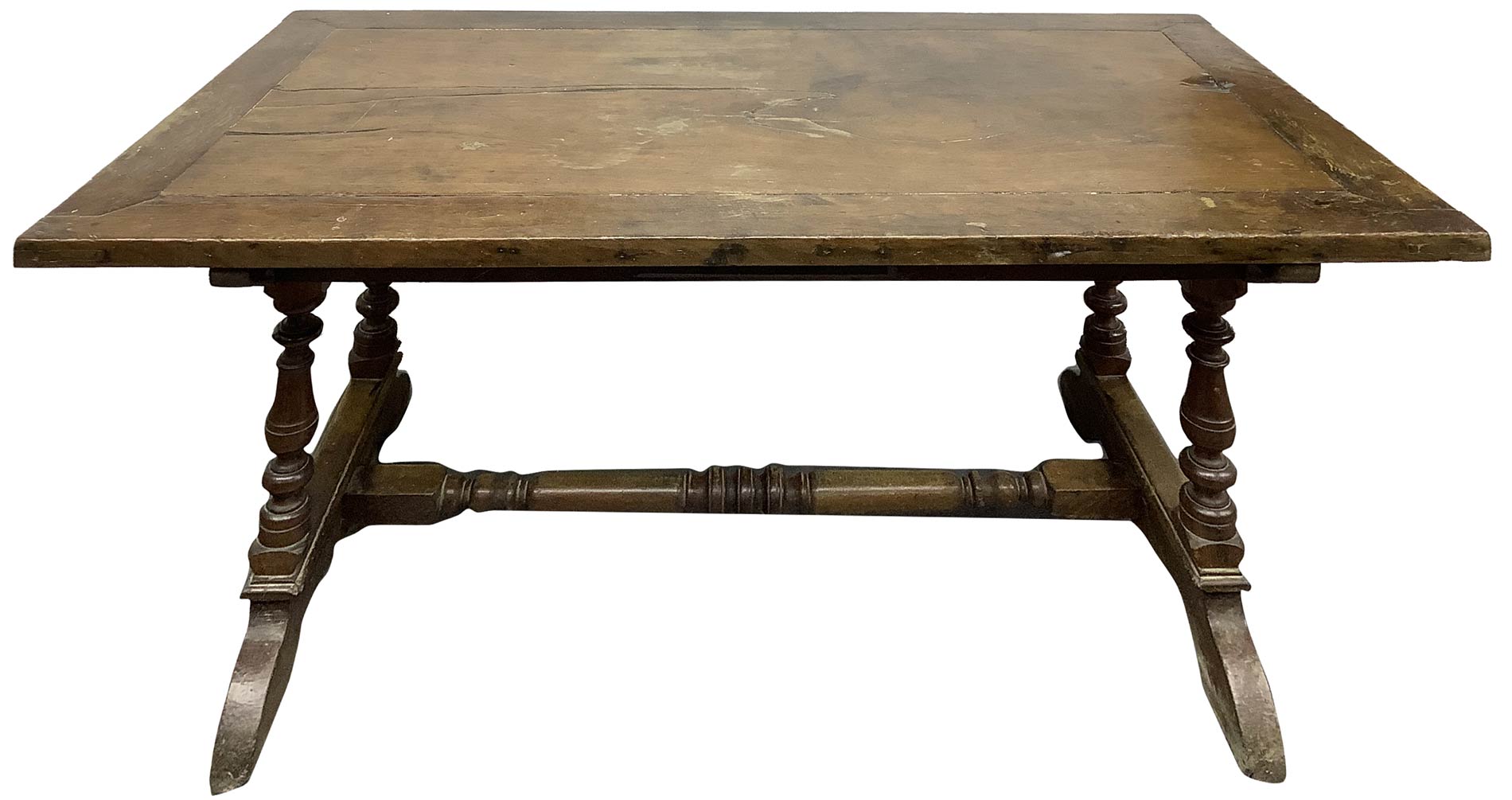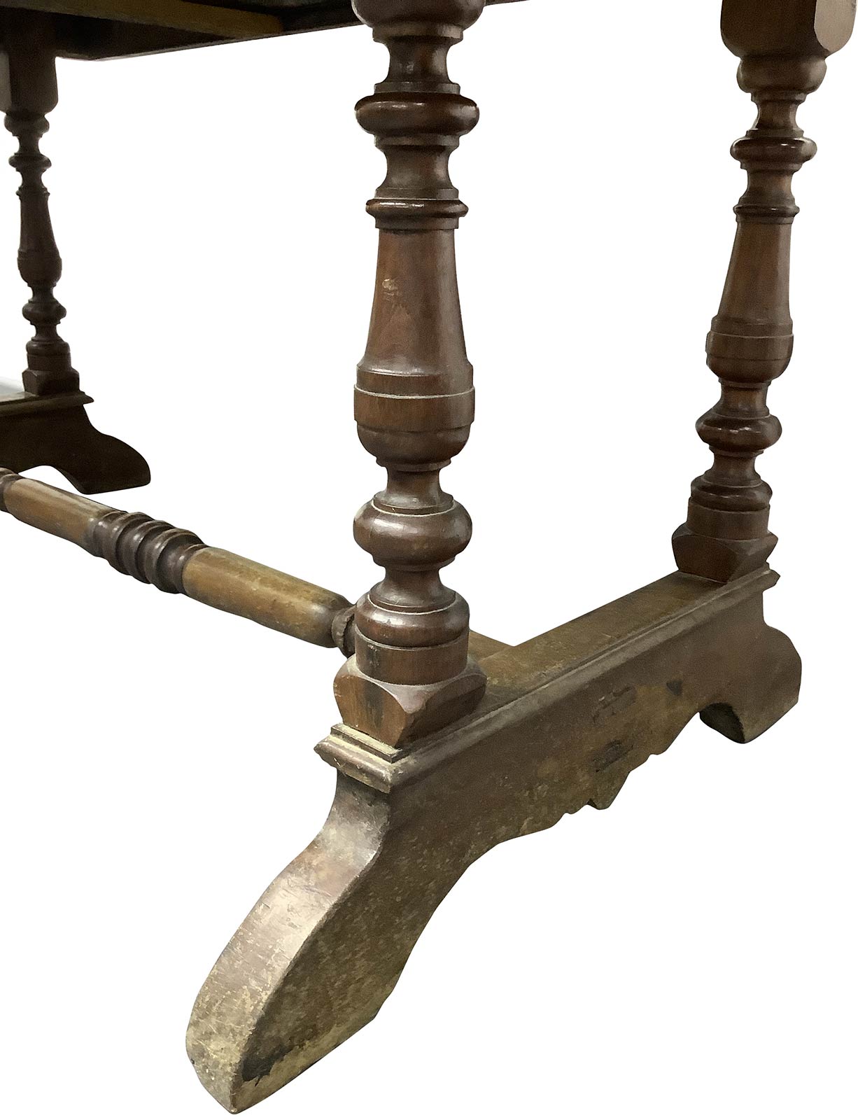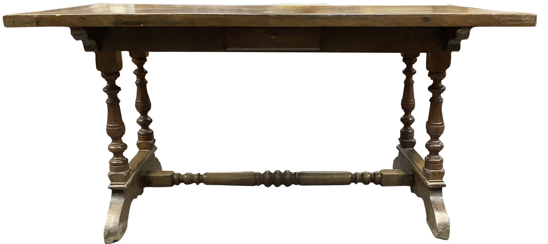 Tavolo fratino in legno di noce, quattro gambe a rocchetta con legaccio centrale. Piccolo cassetto centrale sotto piano. Fine XVII secolo. H Cm 73. Cm148x76