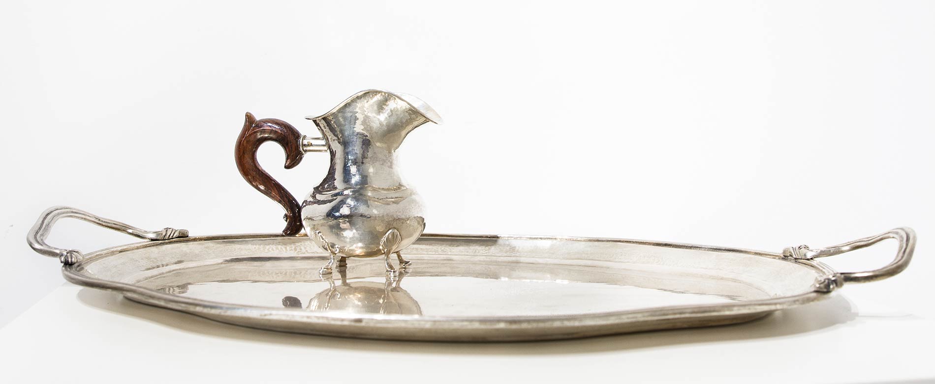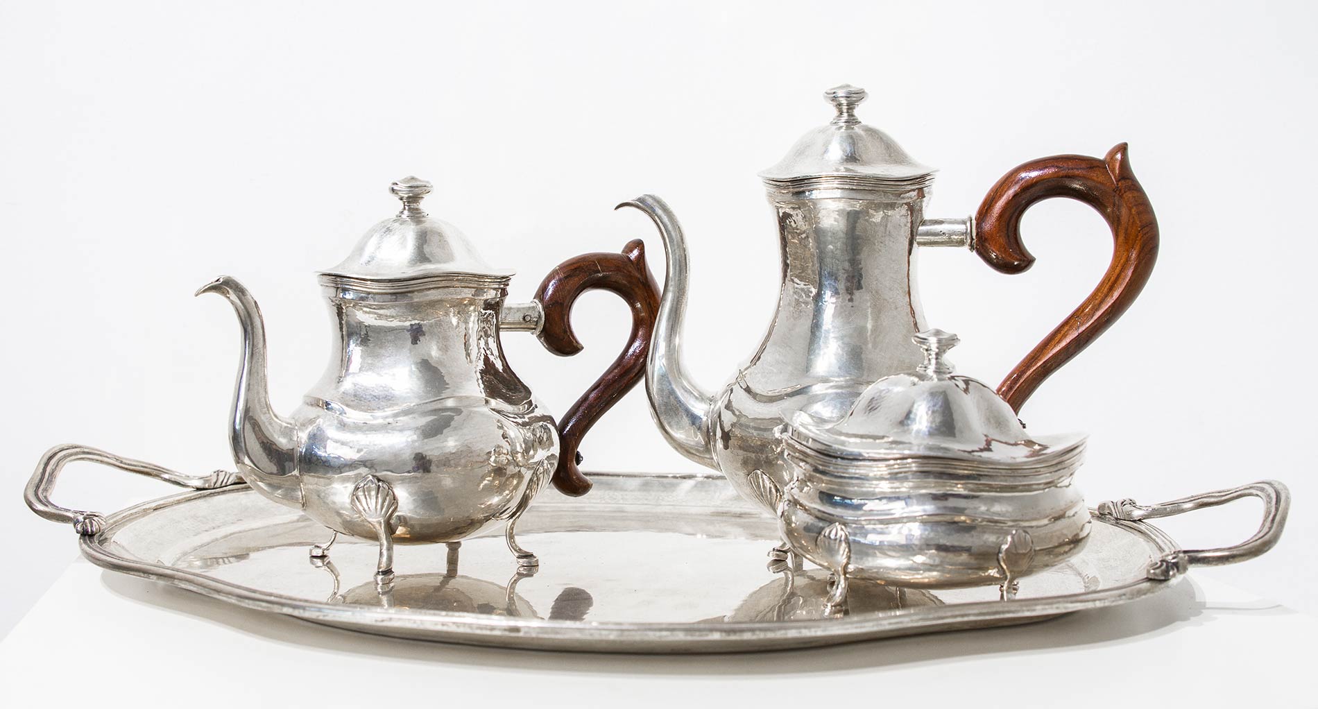 Servizio da the in argento composto da vassoio, caffettiera, teiera, lattiera e zuccheriera, XX secolo. Vassoio Kg 1,944. 4 pezzi peso lordo Kg 2,112.