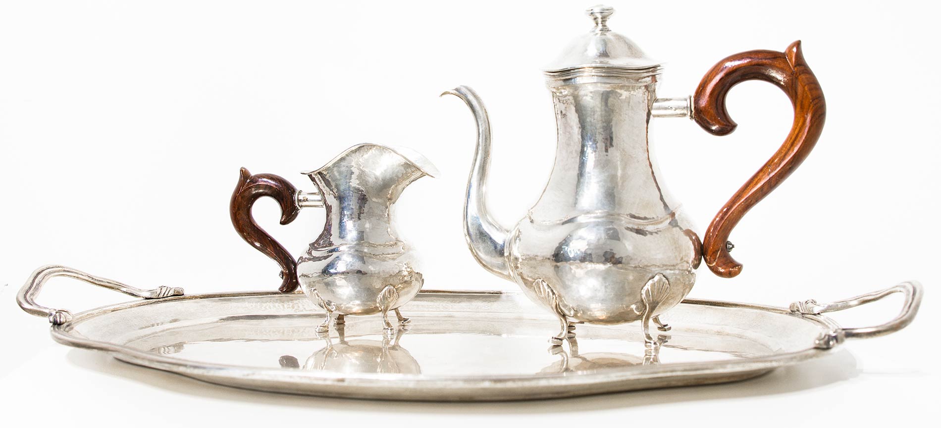 Servizio da the in argento composto da vassoio, caffettiera, teiera, lattiera...