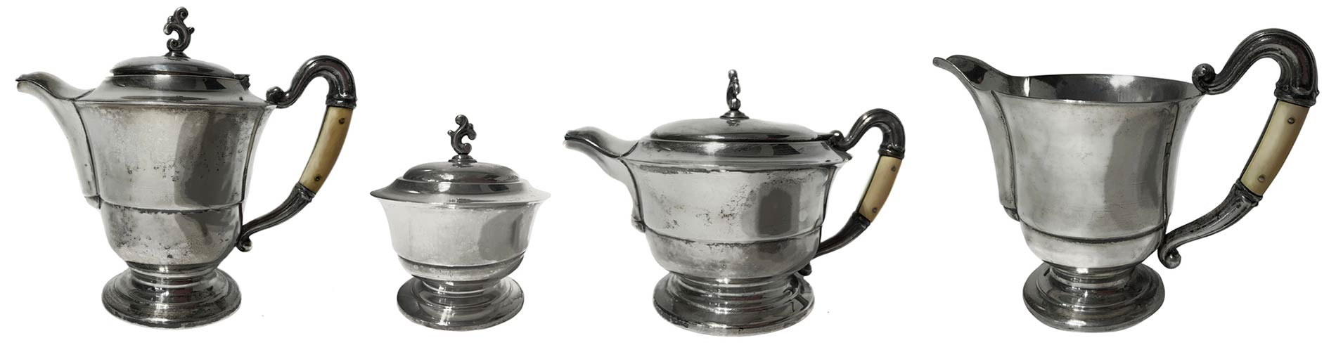 Servizio da te in argento. Composto da: teiera, caffettiera, lattiera e zuccheriera, XX secolo. Peso gr 738.