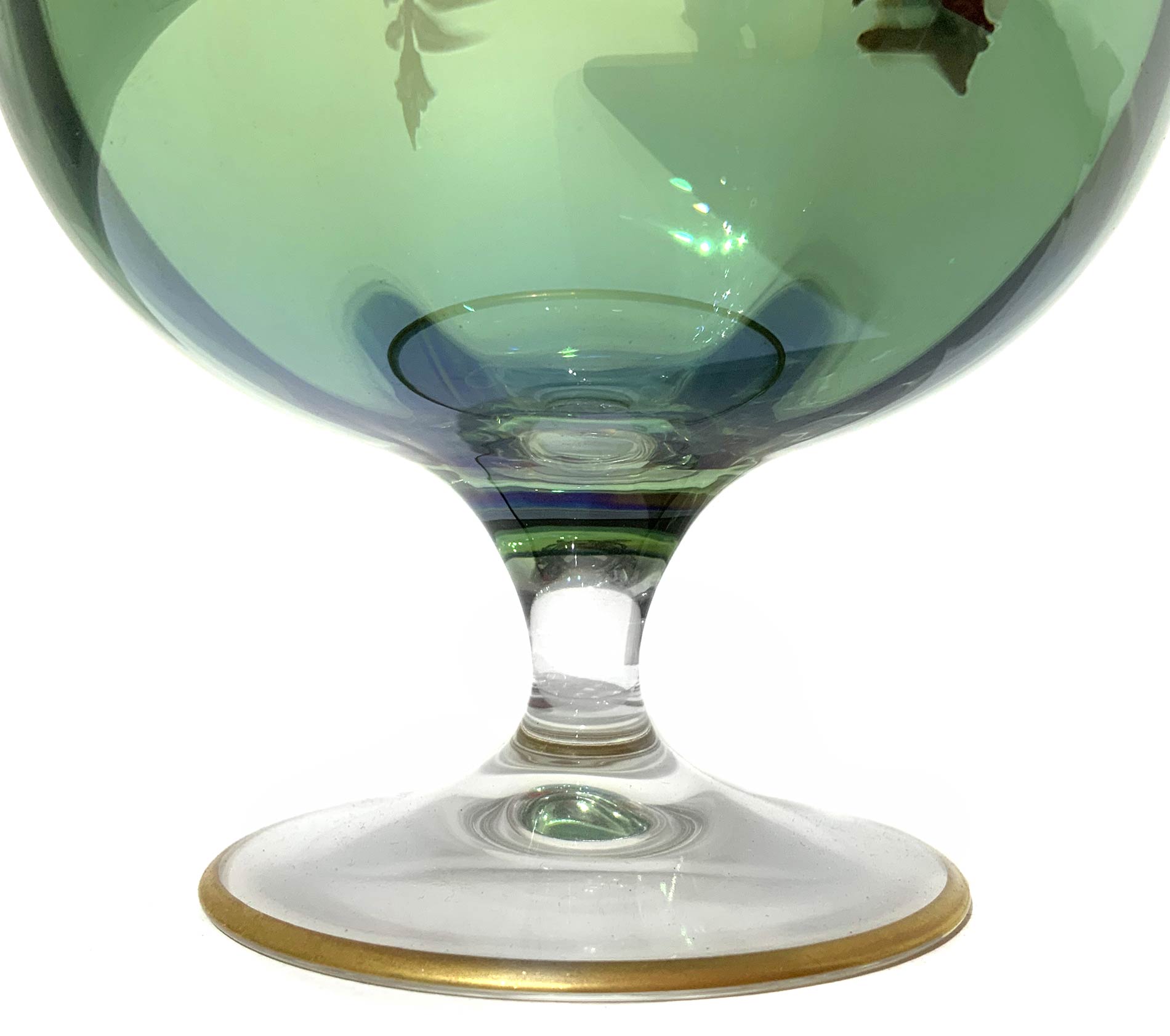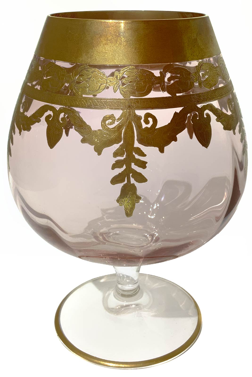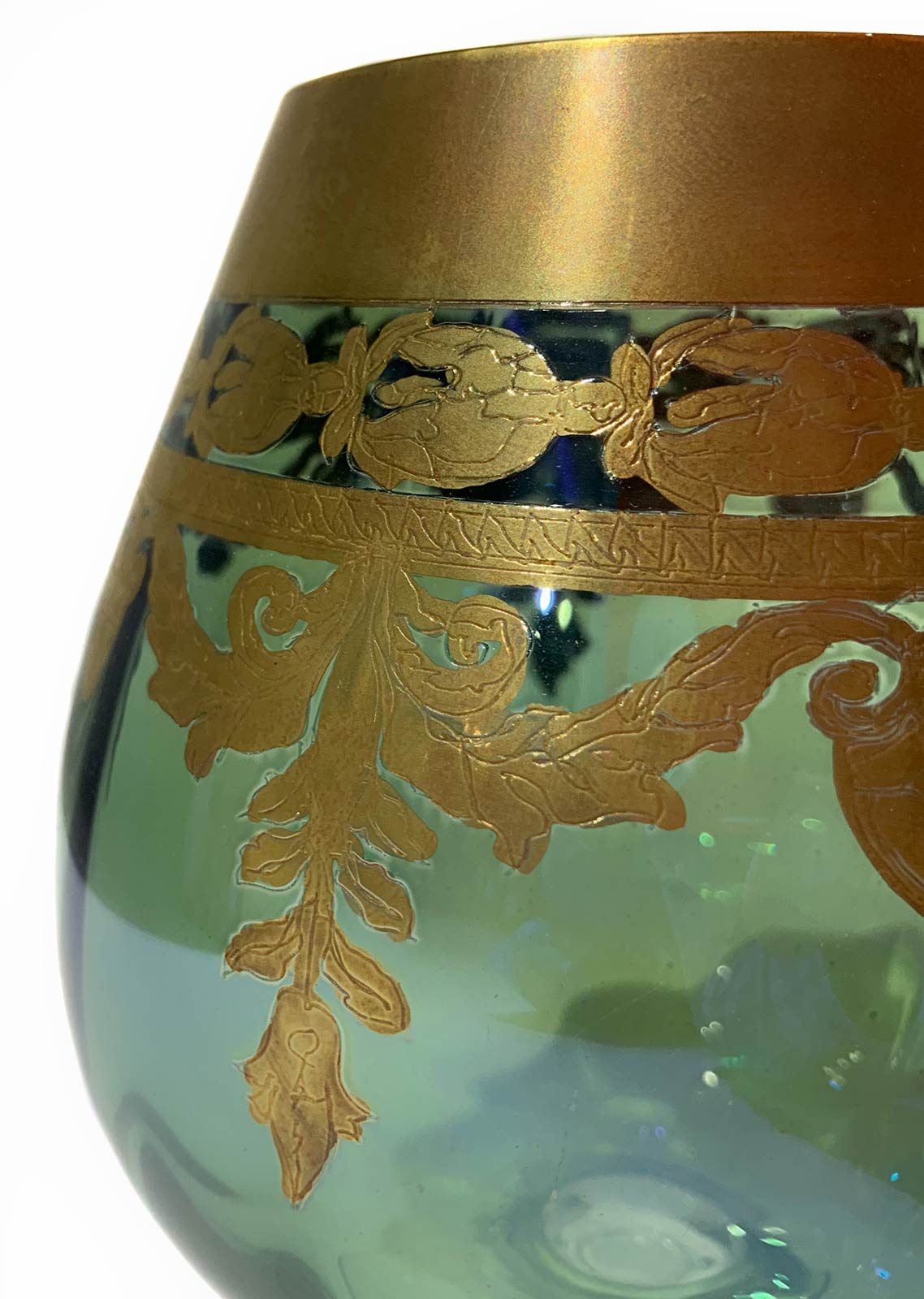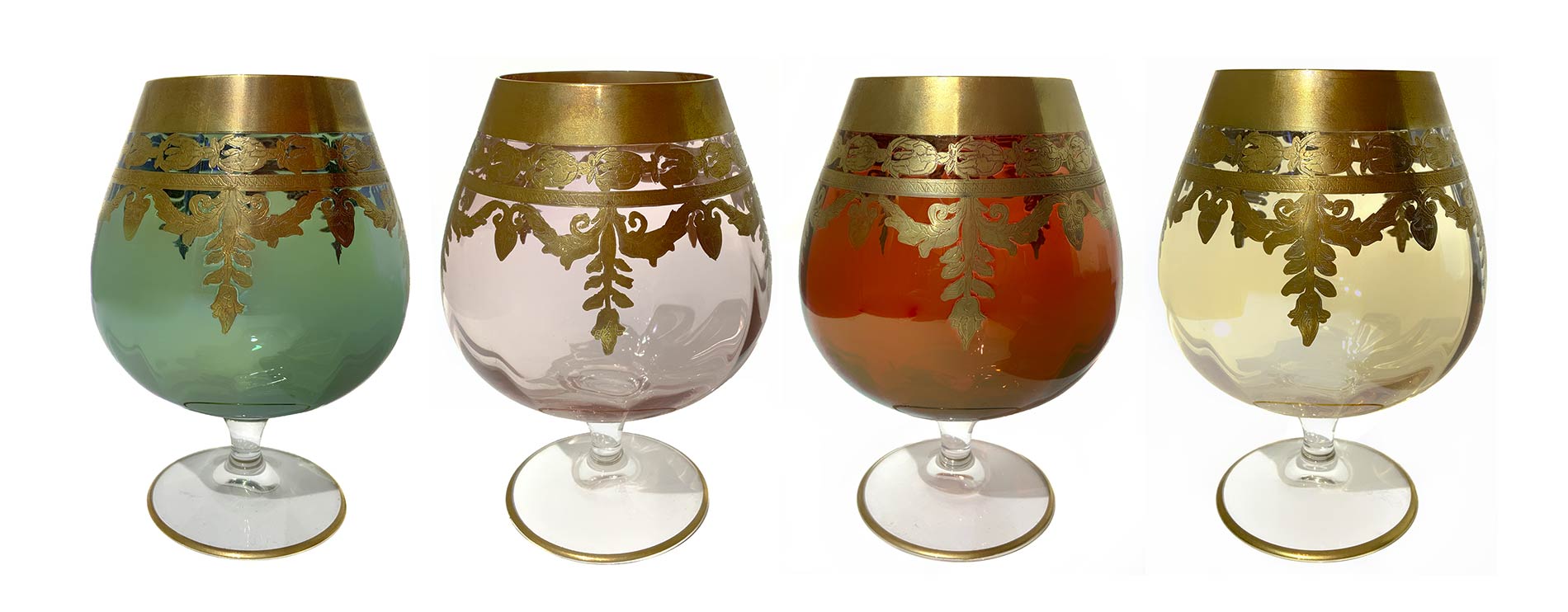 Quattro bicchieri da cognac in vetro di Murano in quattro colori con bordo e decorazioni in oro zecchino. H Cm 15.
