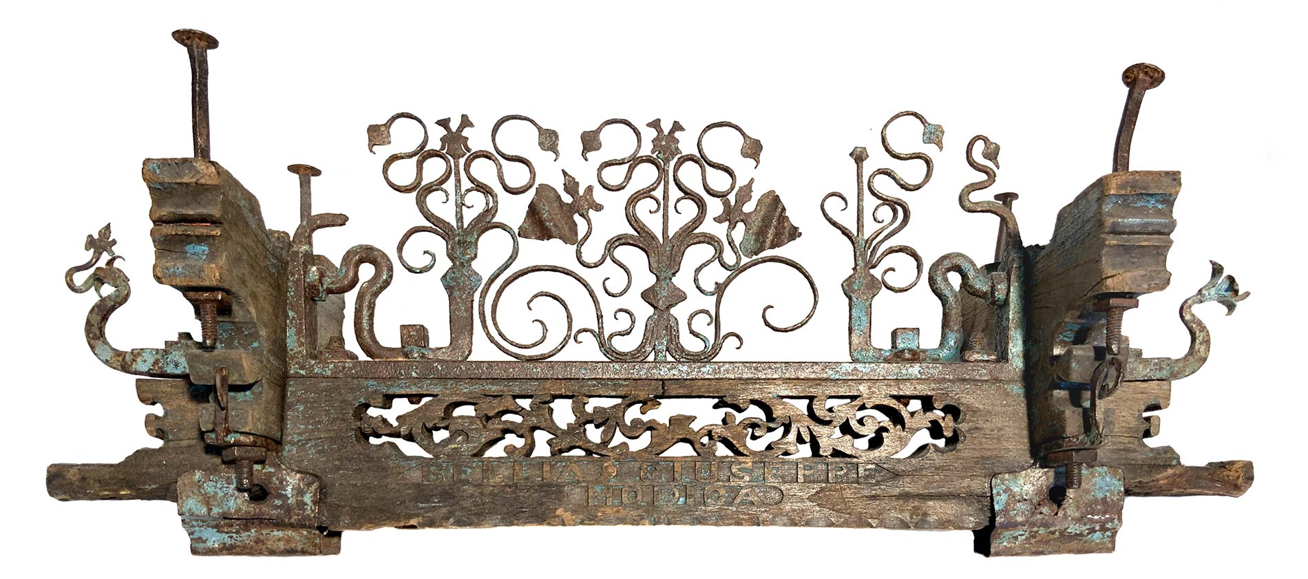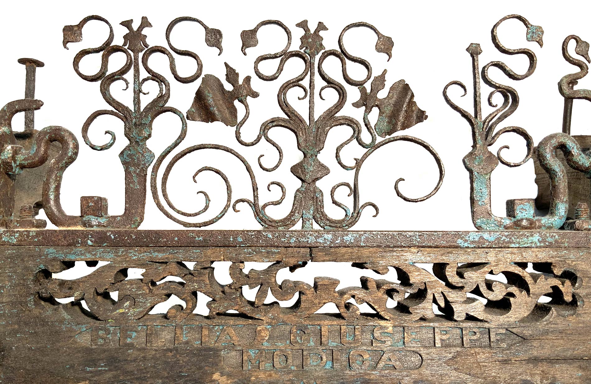 Supporto di carretto siciliano (cascia di fuso). Scultura in legno e ferro battuto, policromo. Firmata sul fronte Bellia Giuseppe Modica. H cm 39. Larghezza cm 99. Profondità cm 34