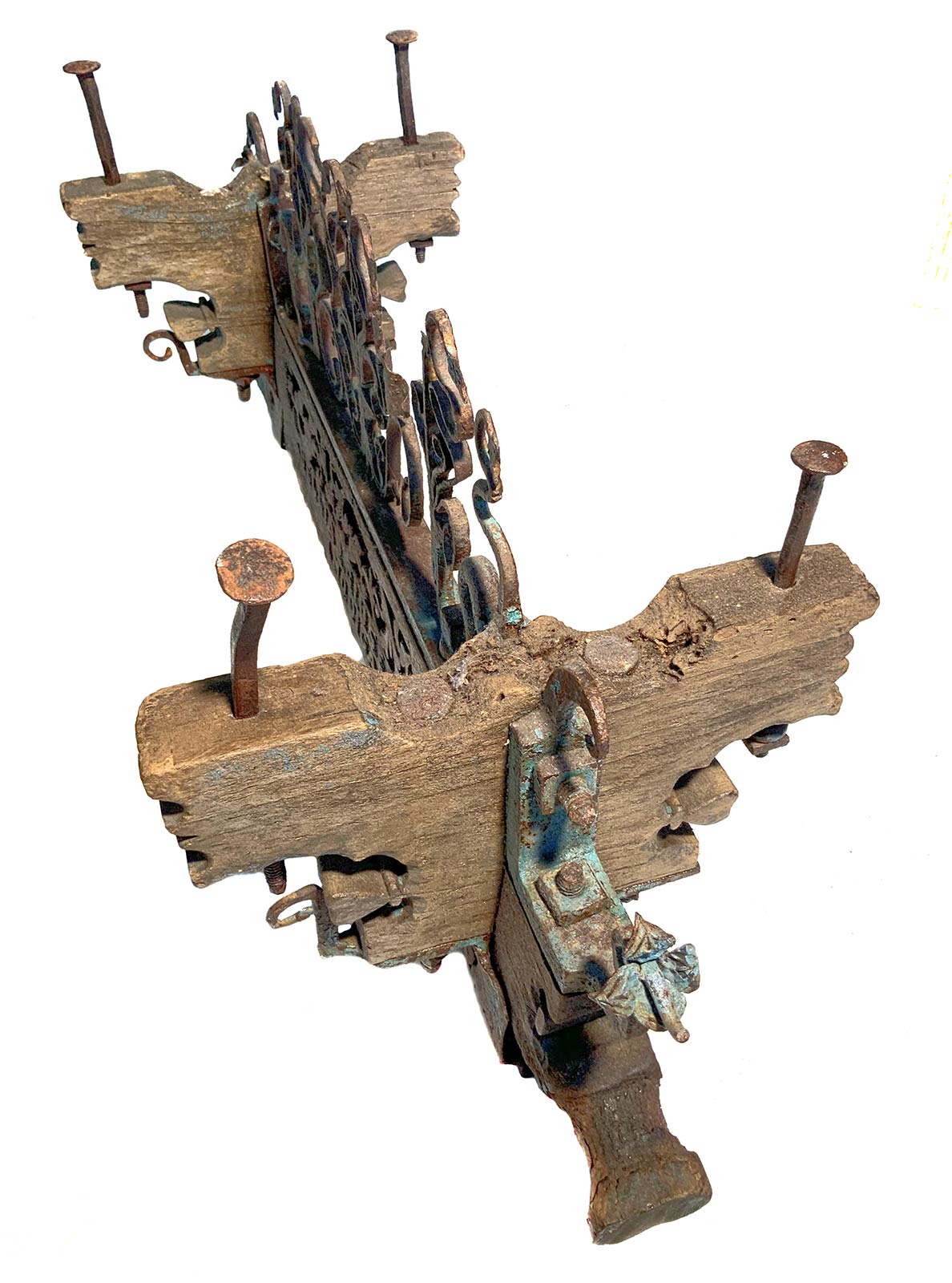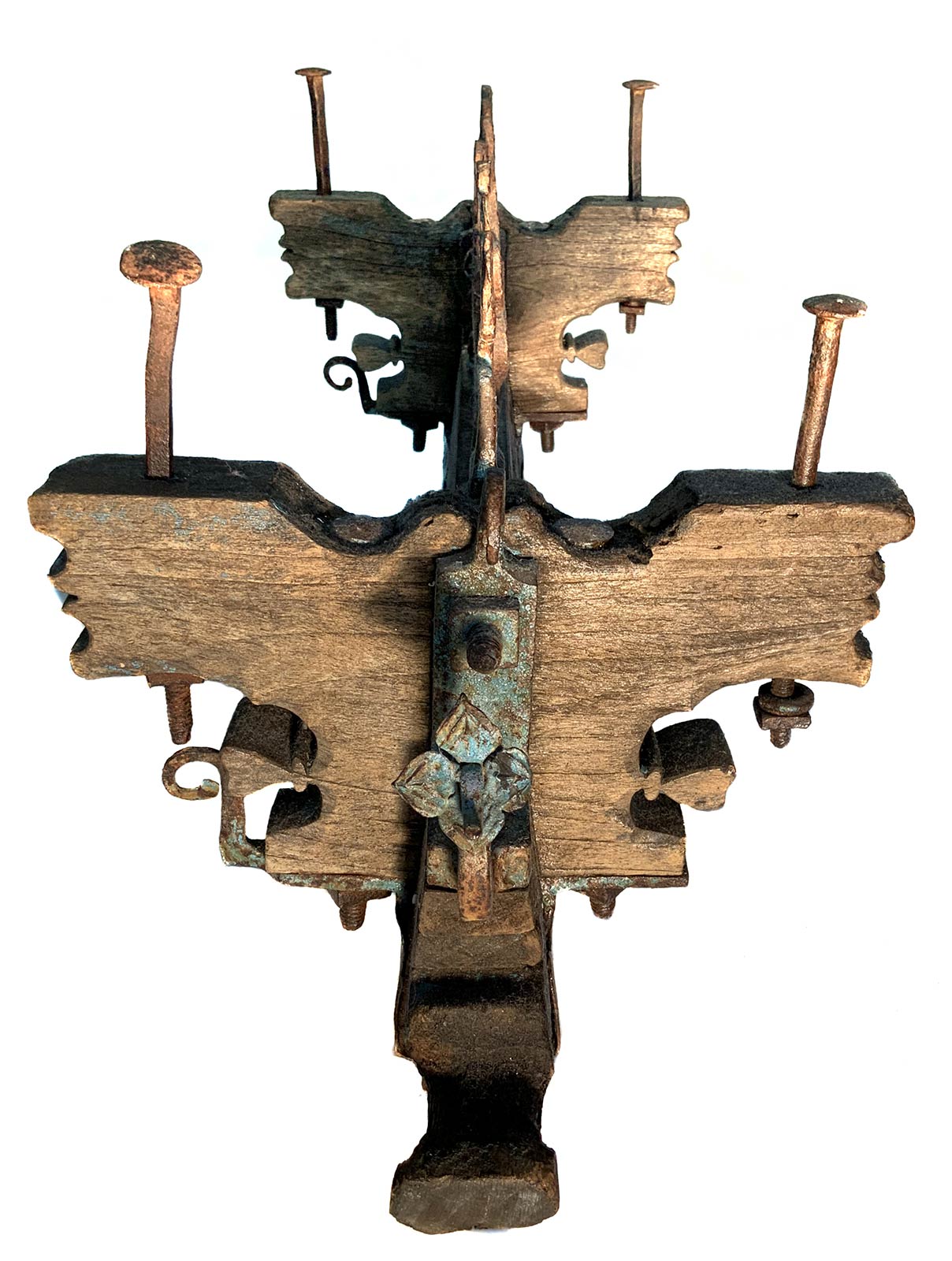 Supporto di carretto siciliano (cascia di fuso). Scultura in legno e ferro...