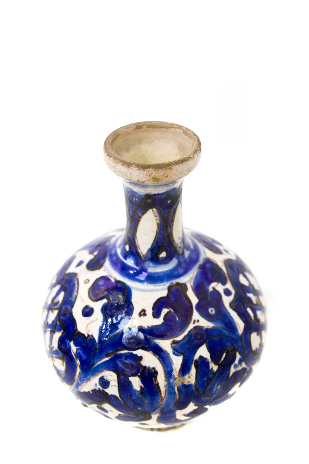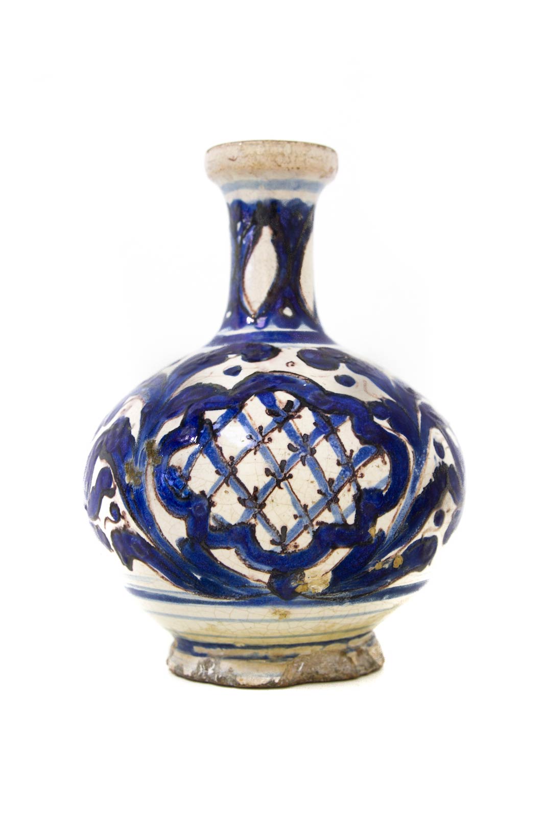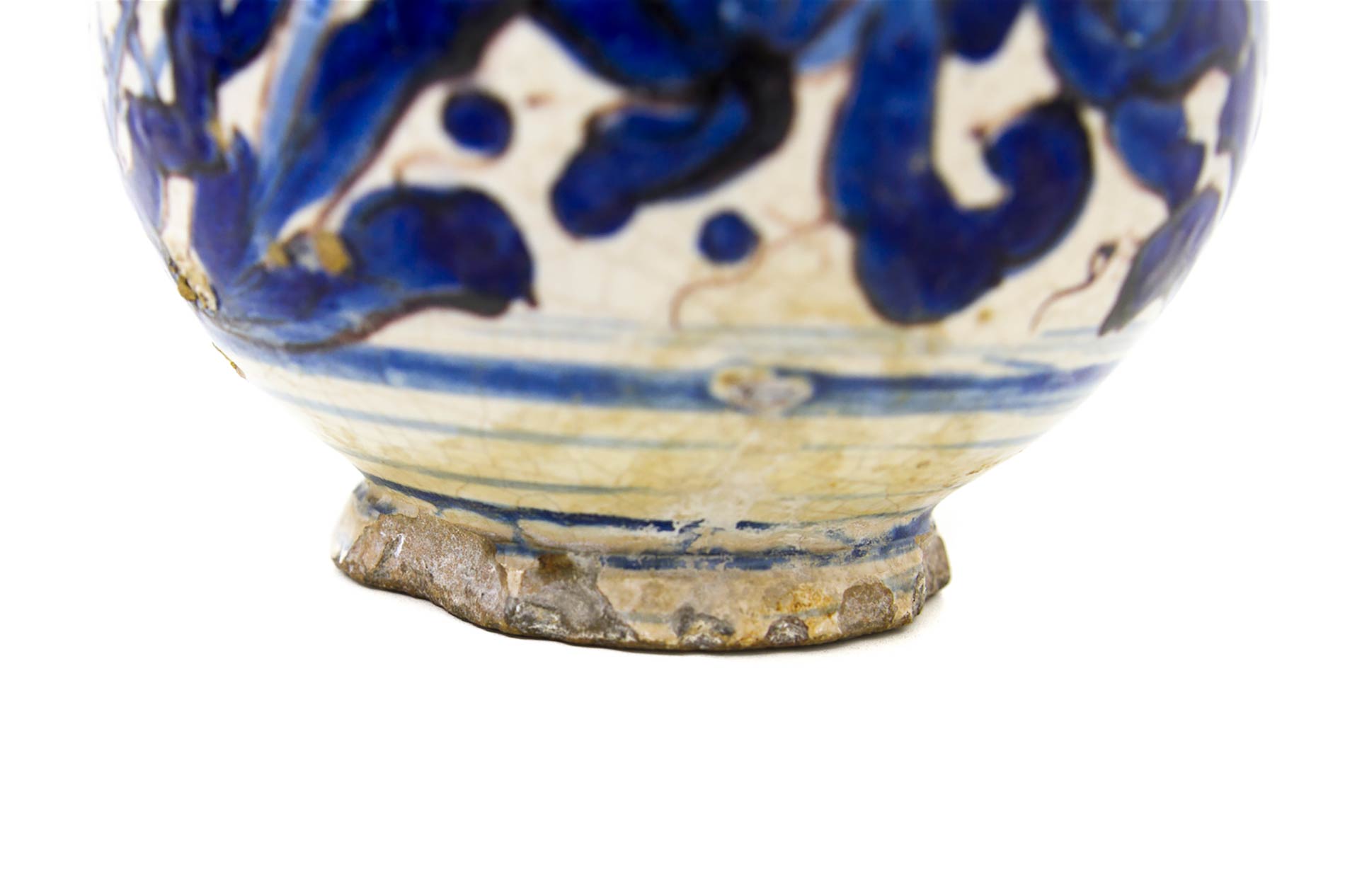 Bottiglia Caltagirone, XVIII Secolo. Fondo a smalto bianco con decori a larghe foglie blu. H cm 22