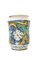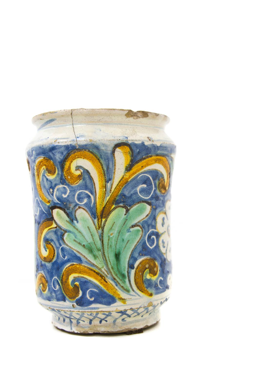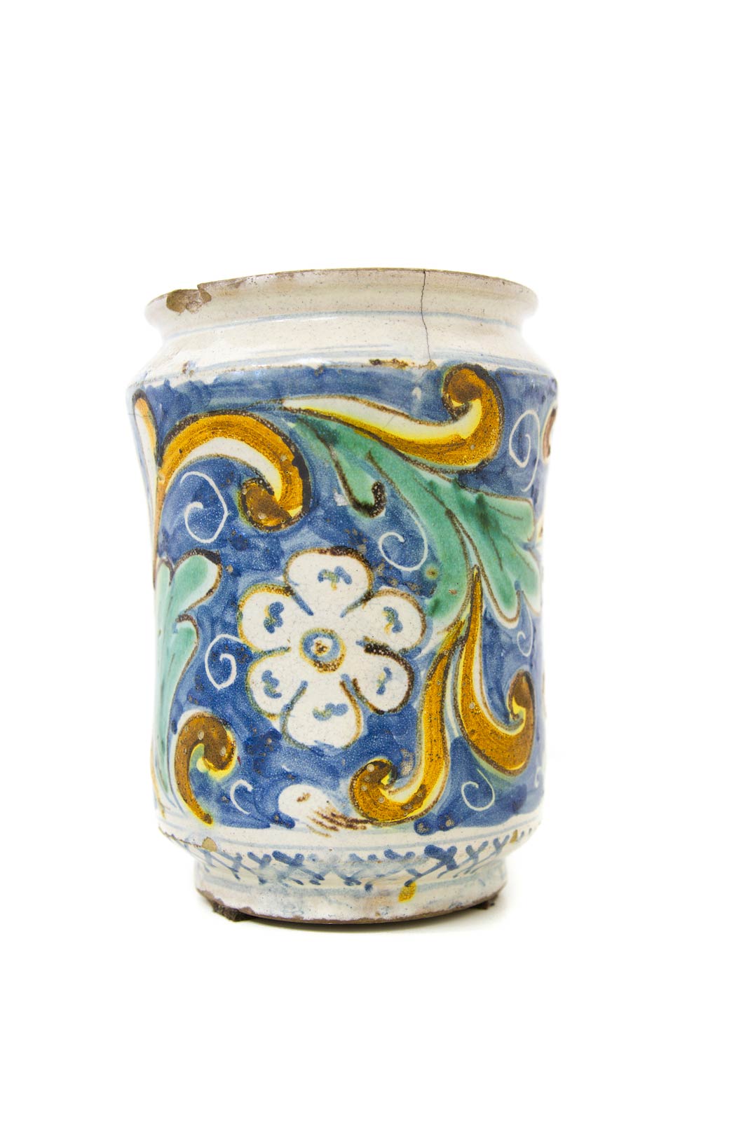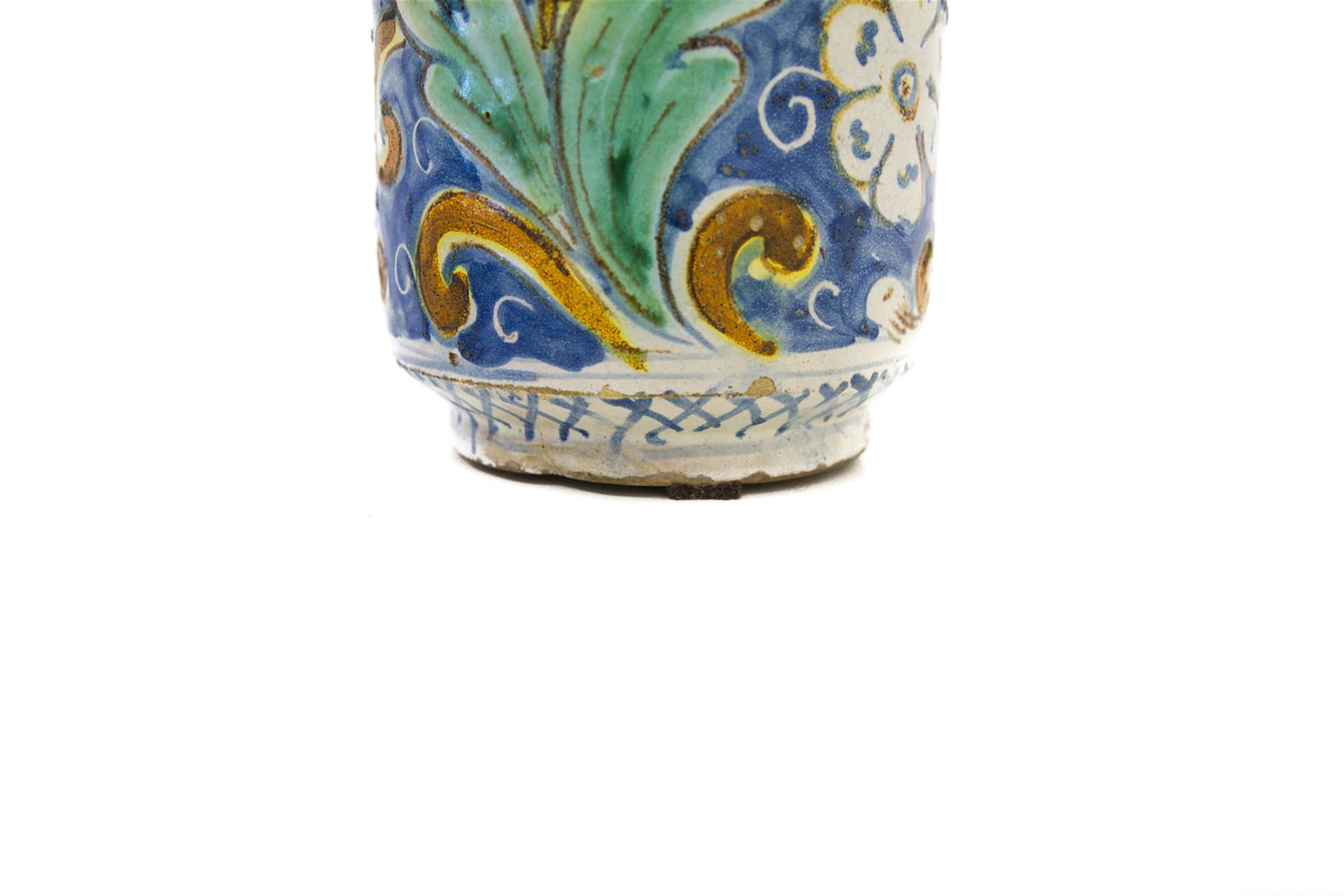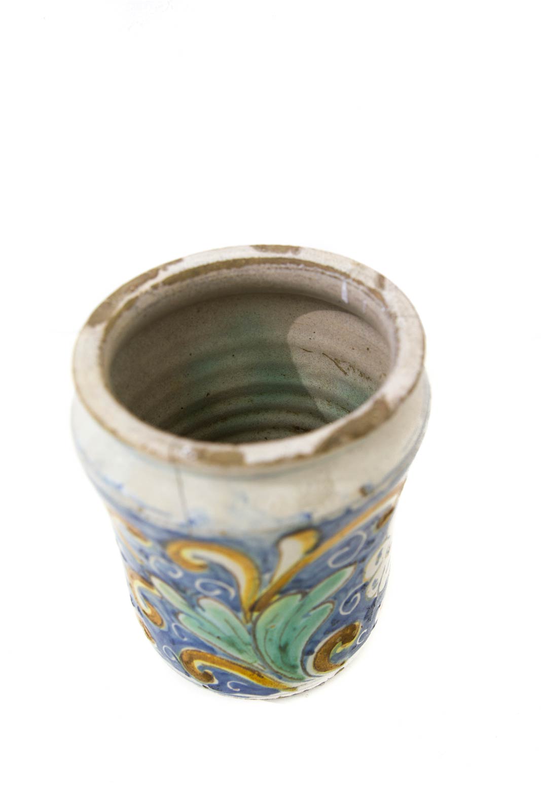 Cilindro in maiolica di Caltagirone, XVIII Secolo. Smalto blu con decori a fiori e foglie gialli e bianchi. H Cm 17.