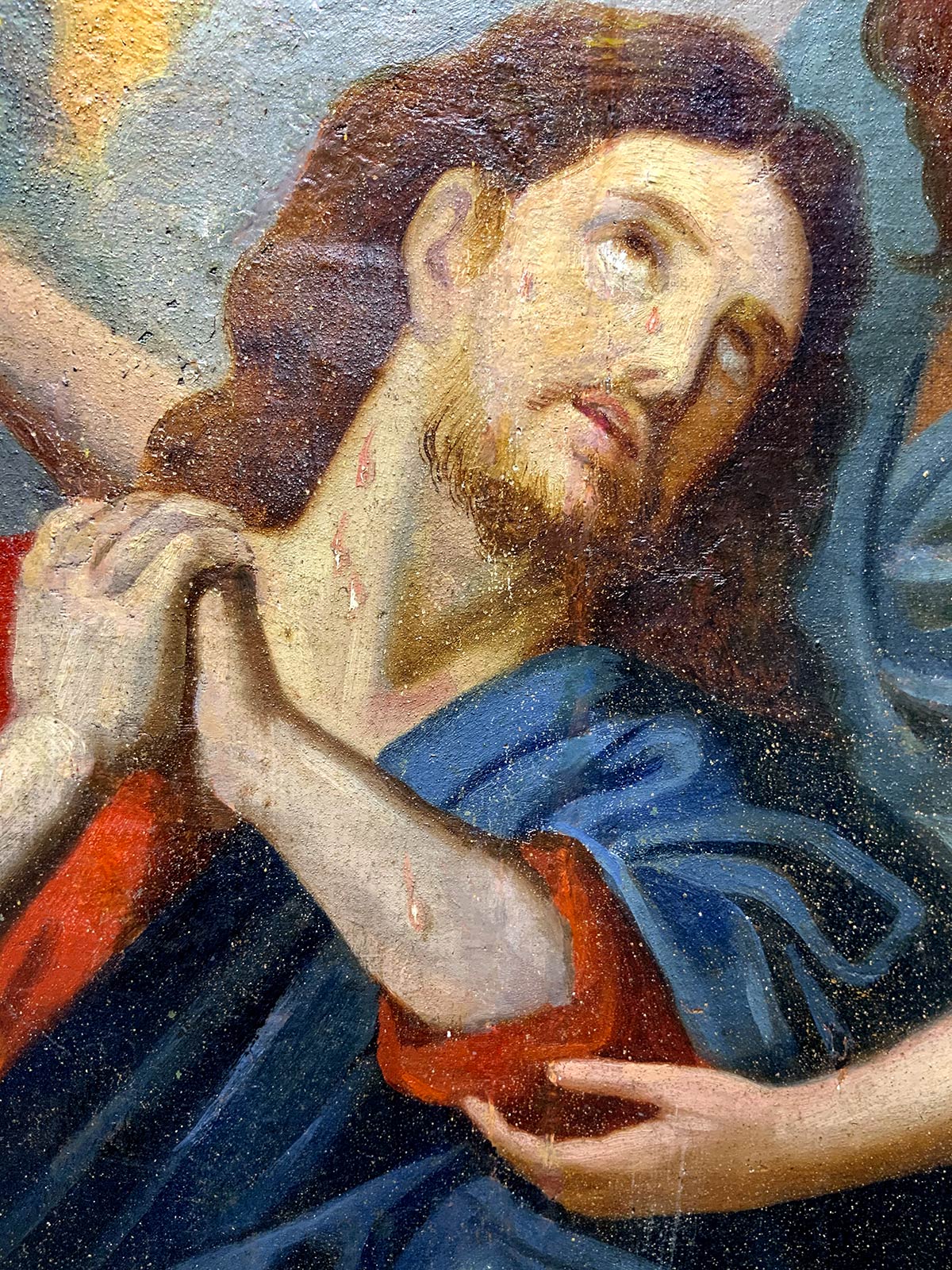 Dipinto ad olio su tela raffigurante scena biblica "Transustanziazione di Gesù", attribuito ad Olivio Sozzi (Catania, 1690 - Ispica, 1765). Cm 91x103, olio su tela applicata a masonite.