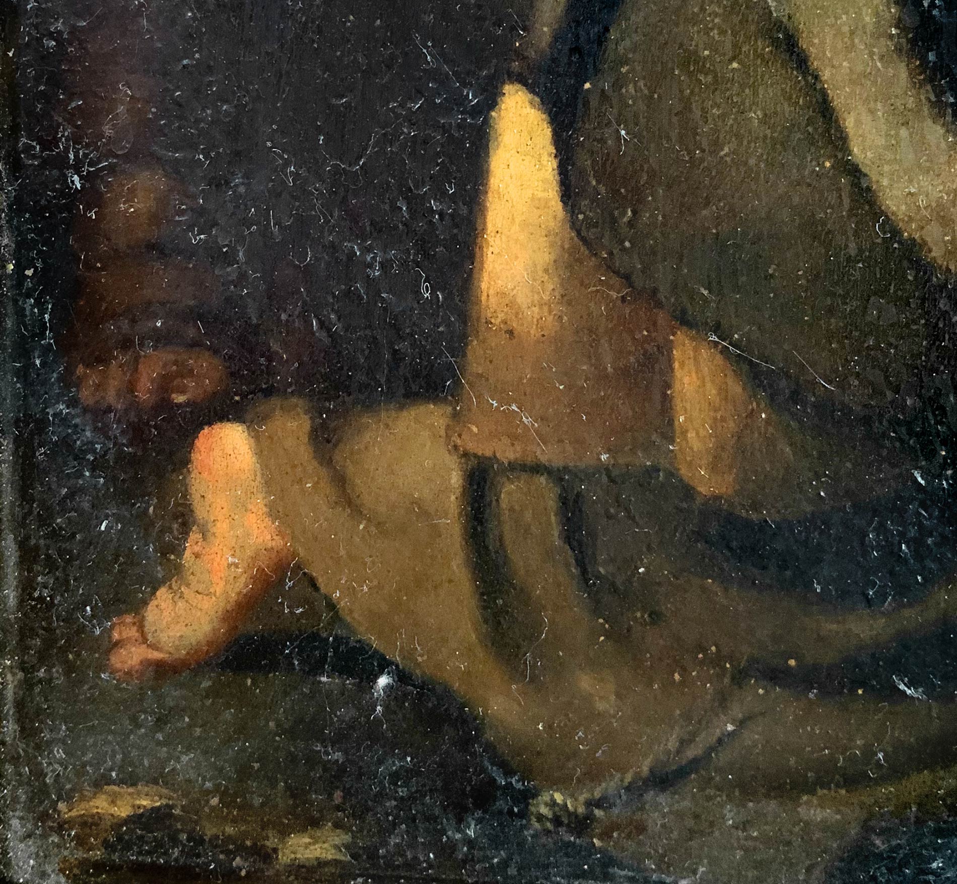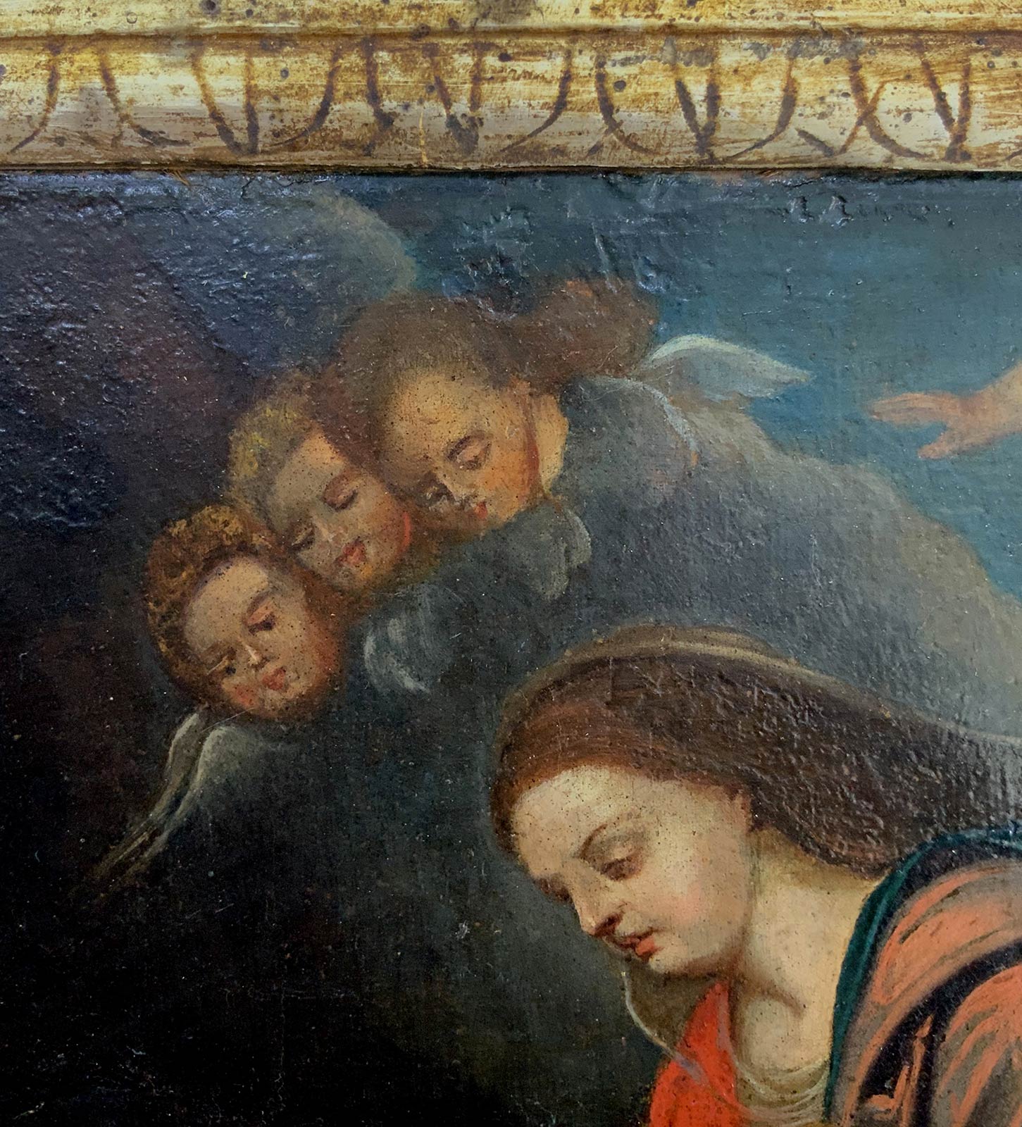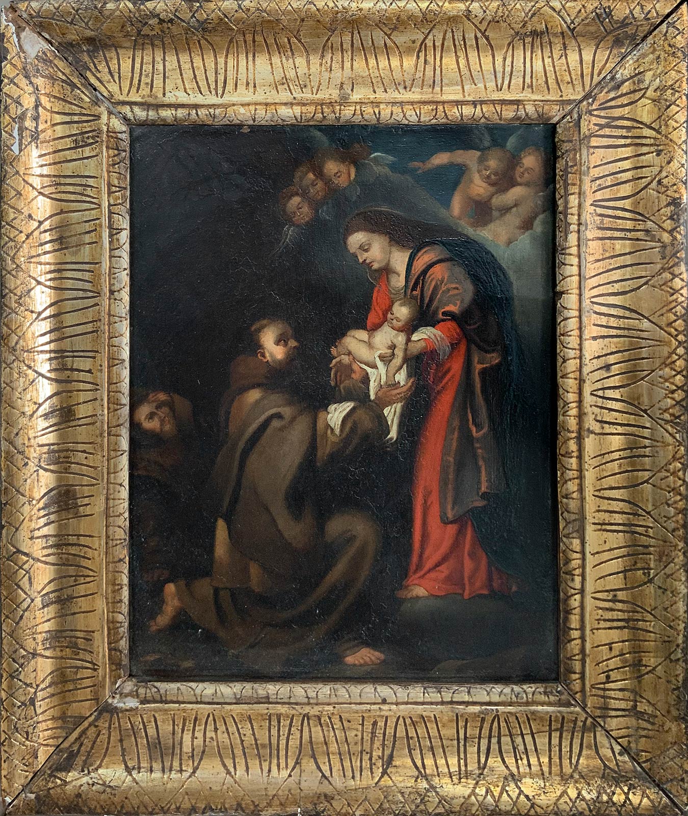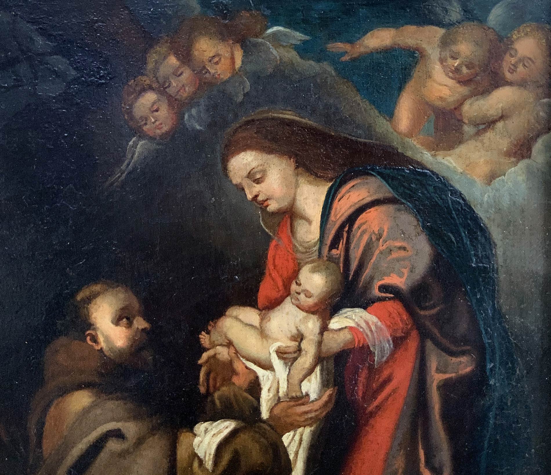 Lotto 312 | Dipinto ad olio su tela applicata a tavola, Madonna con bambino e San...