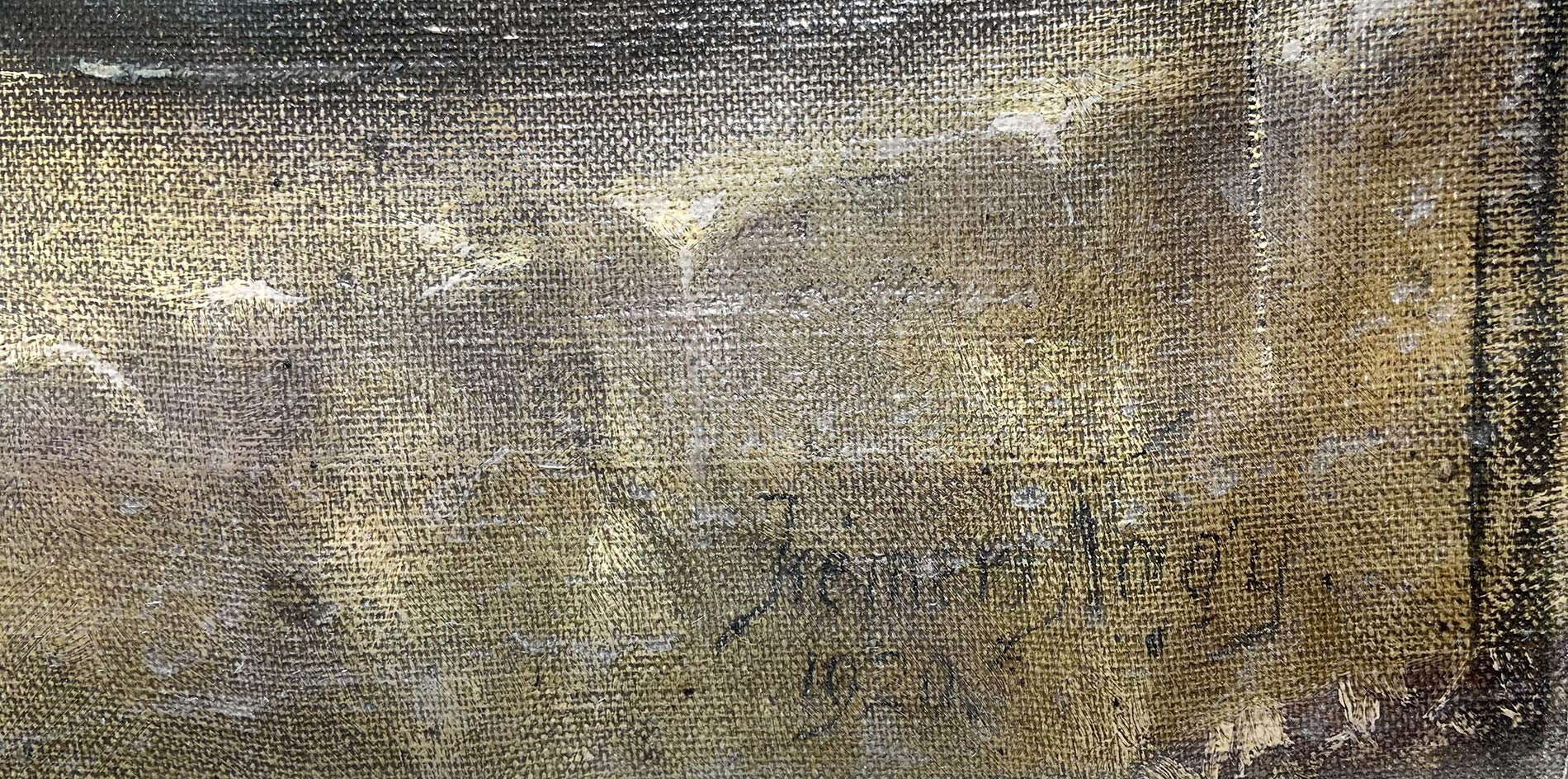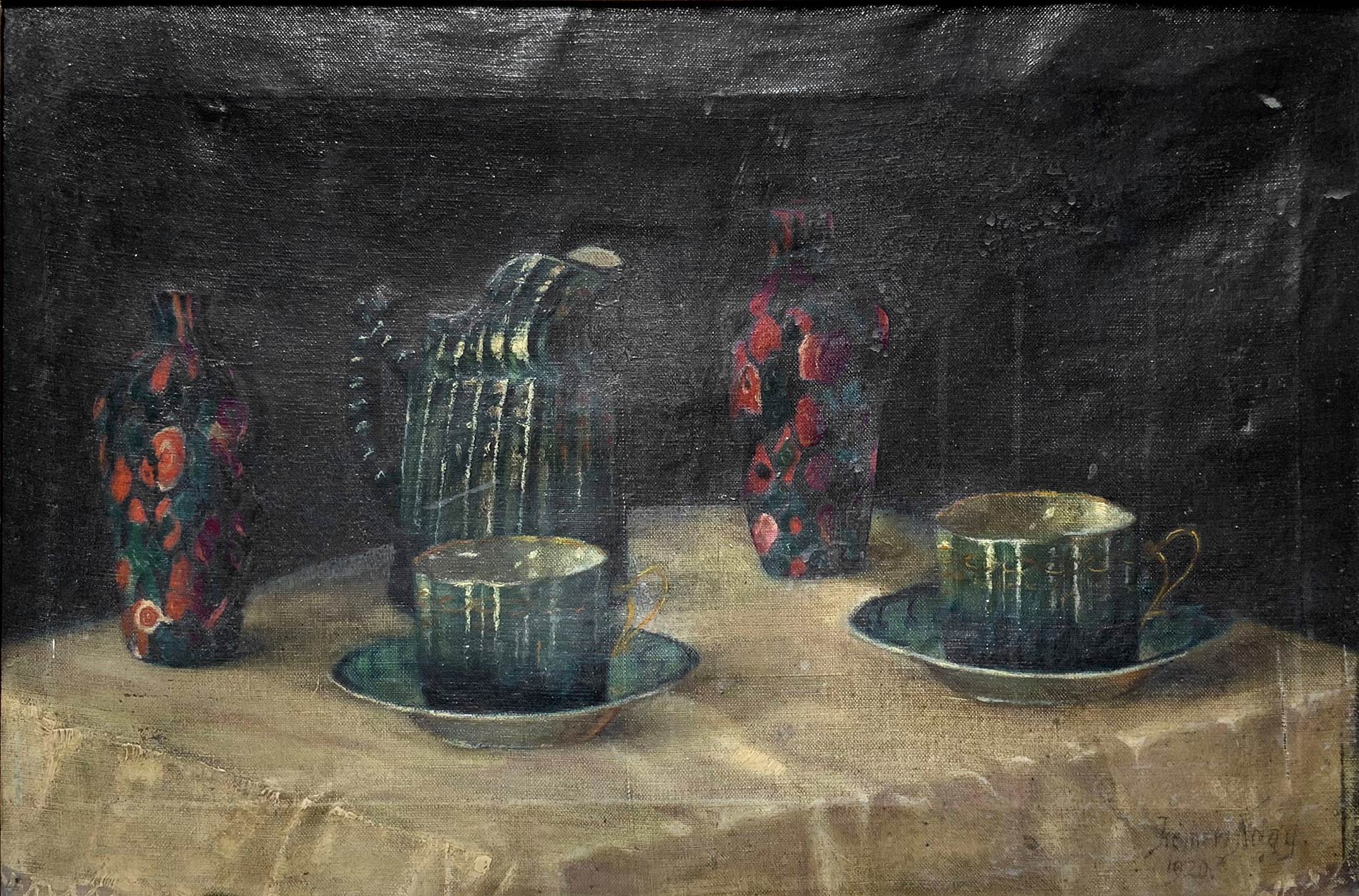 Dipinto ad olio su tela raffigurante natura morta di oggetti, tazze lattiera e vasi, periodo decò. Cm 39,5x59. Firmato e datato in basso a destra 1920.