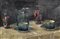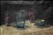 Dipinto ad olio su tela raffigurante natura morta di oggetti, tazze lattiera...