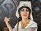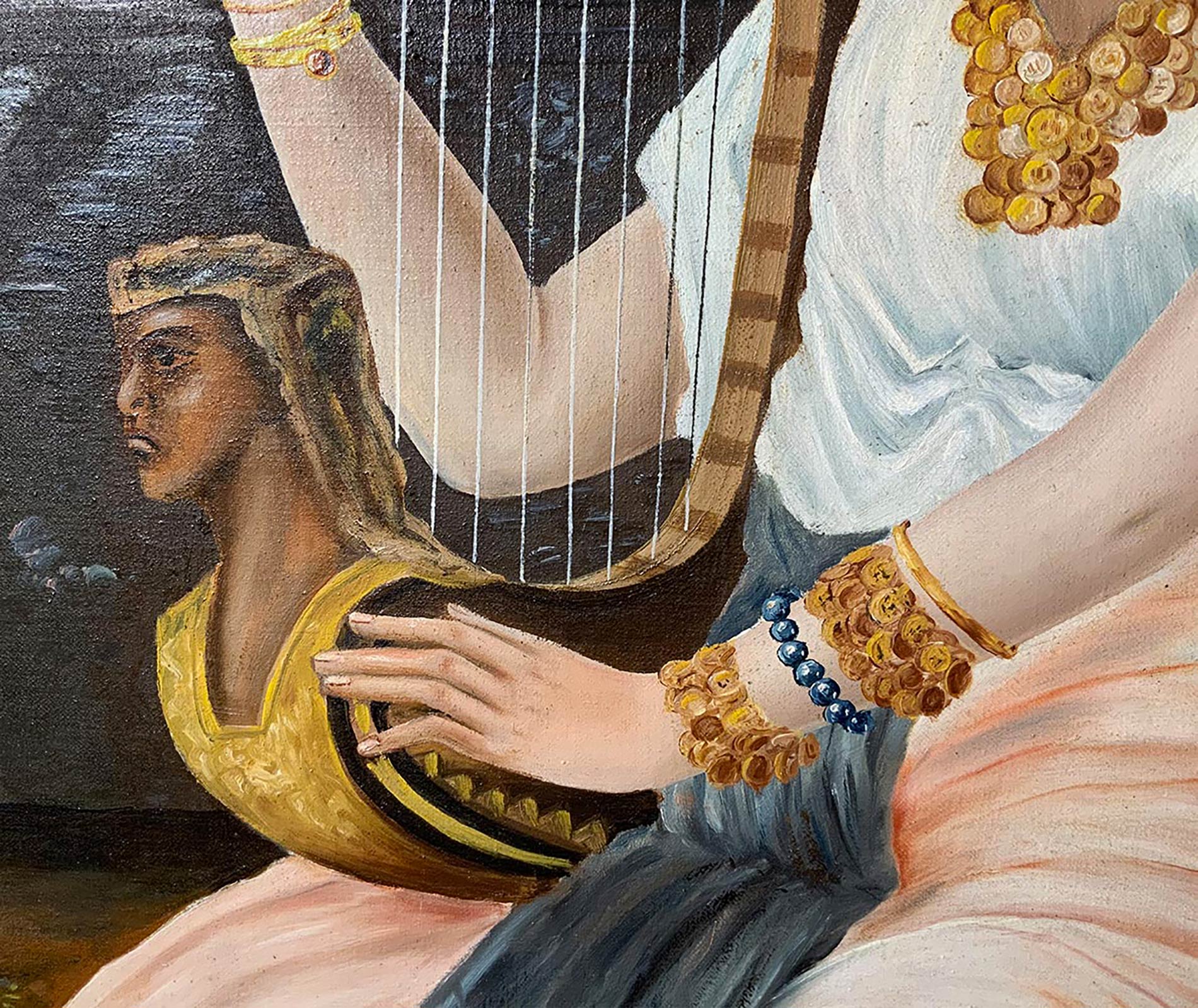 Dipinto ad olio su tela raffigurante donna orientale con arpa, fine del XIX...