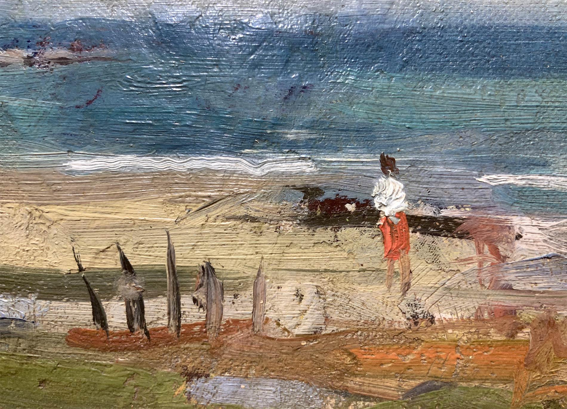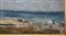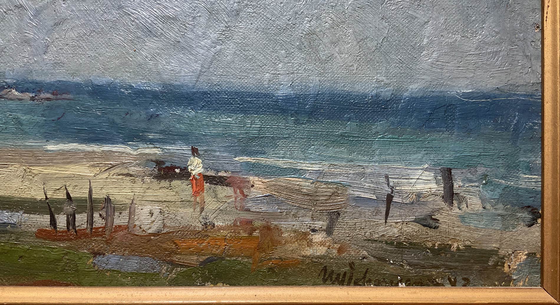 Dipinto ad olio su masonite raffigurante marina. Firmato Ulf Johansen (Stoccolma 1912- 1978) e datato 1943. Cm 25,5x54.