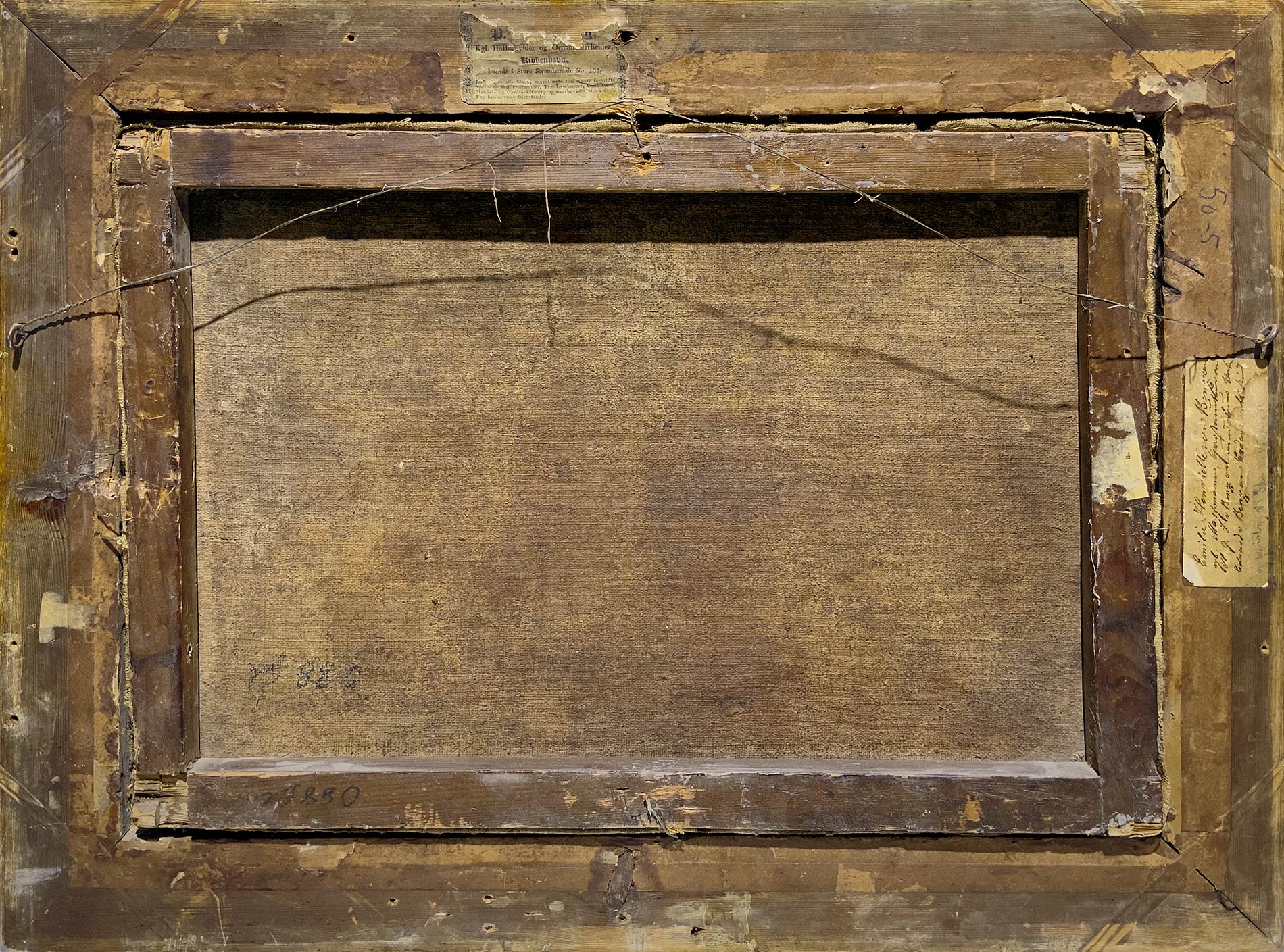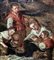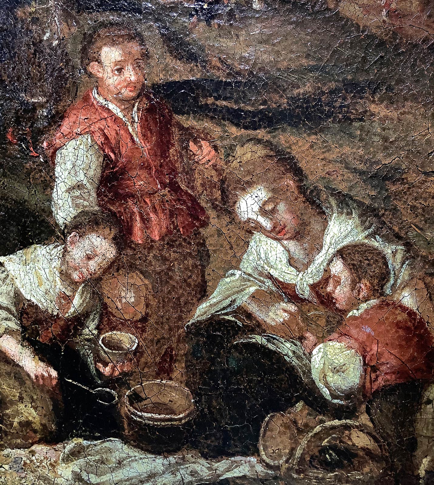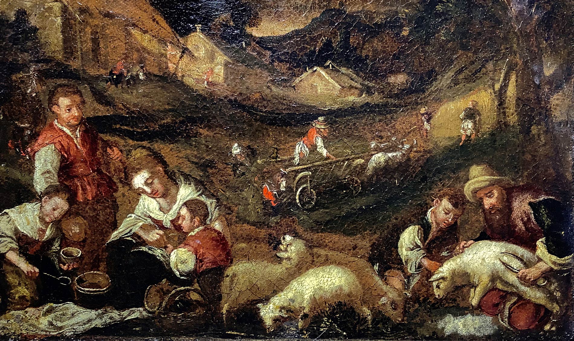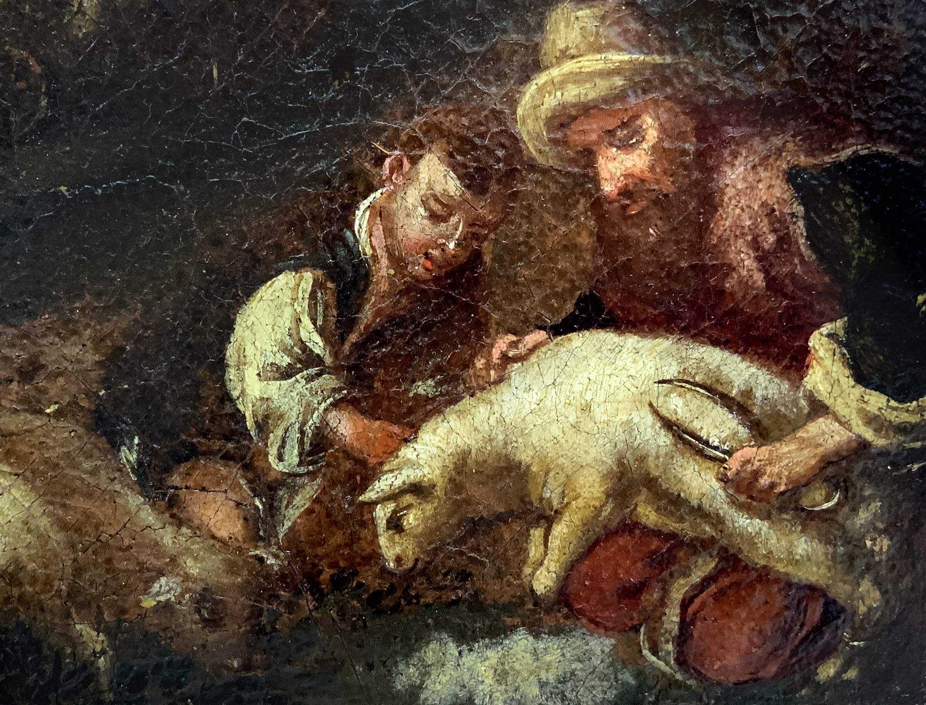 Dipinto ad olio su tela raffigurante personaggi intenti alla tosatura di pecore. Pittore bassanese del XVII secolo. Cm 34x48,