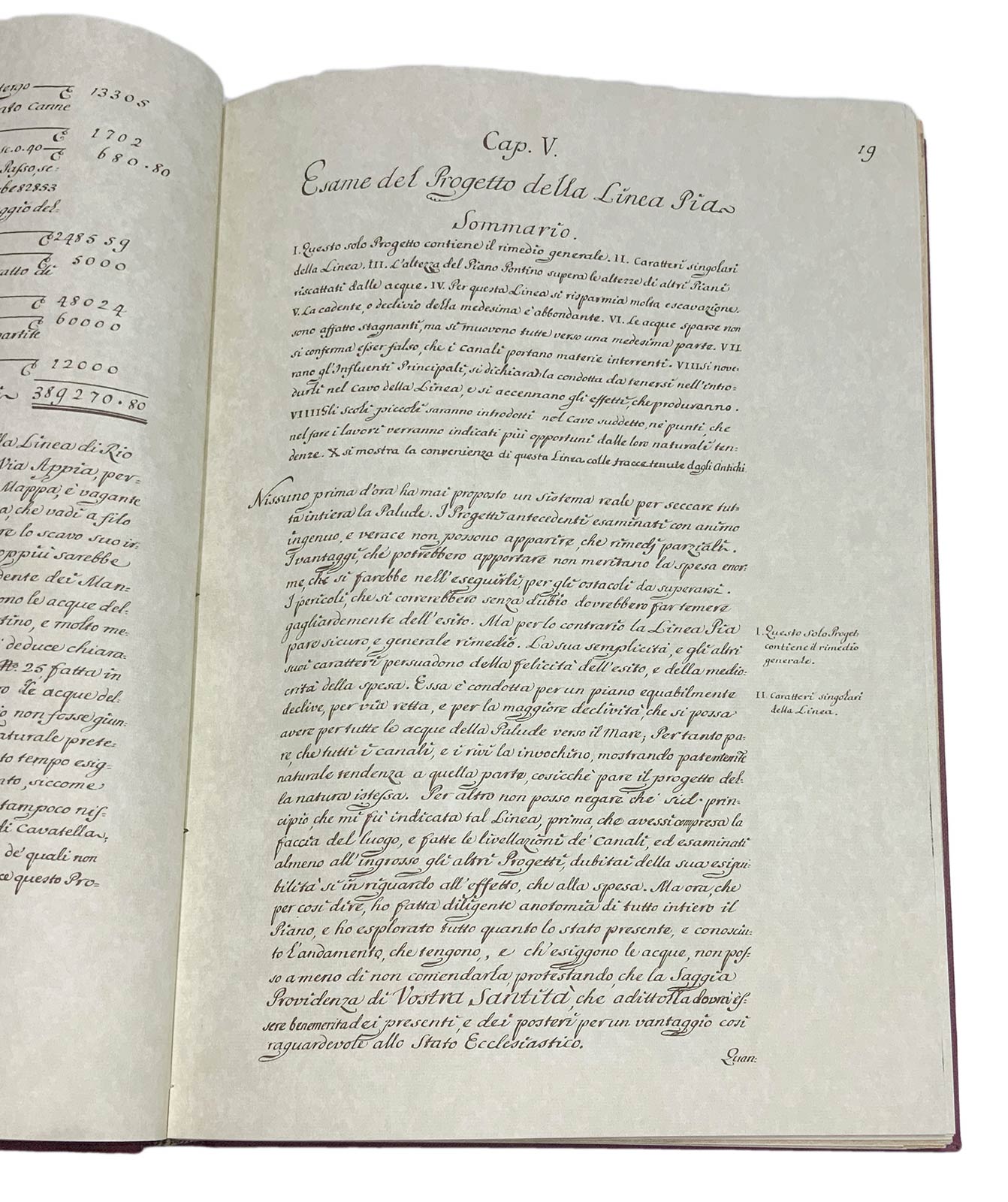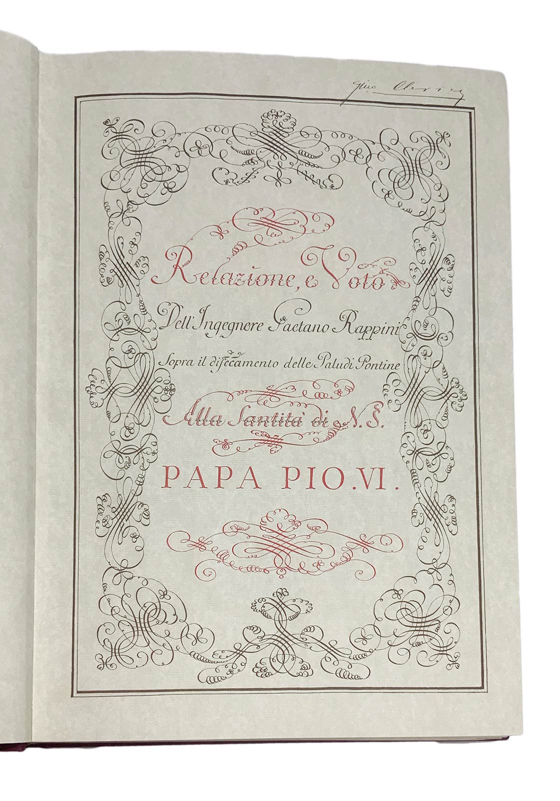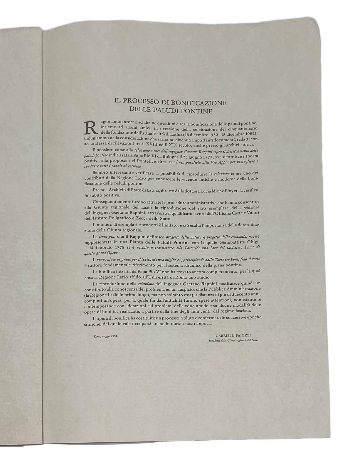 Relazione e Voto dell’ingegnere Gaetano Rappini sopra il disseccamento delle Paludi Pontine alla Santità di N.S. Papa Pio VI, Roma 1983. In folio tela ornata in oro, 42 pagine, 55 tavole a colori di qui 21 pieghevoli 1 carta inserita. Facsimile del manoscritto dell'ing. Rappini (1734-1796). Ottimo stato.