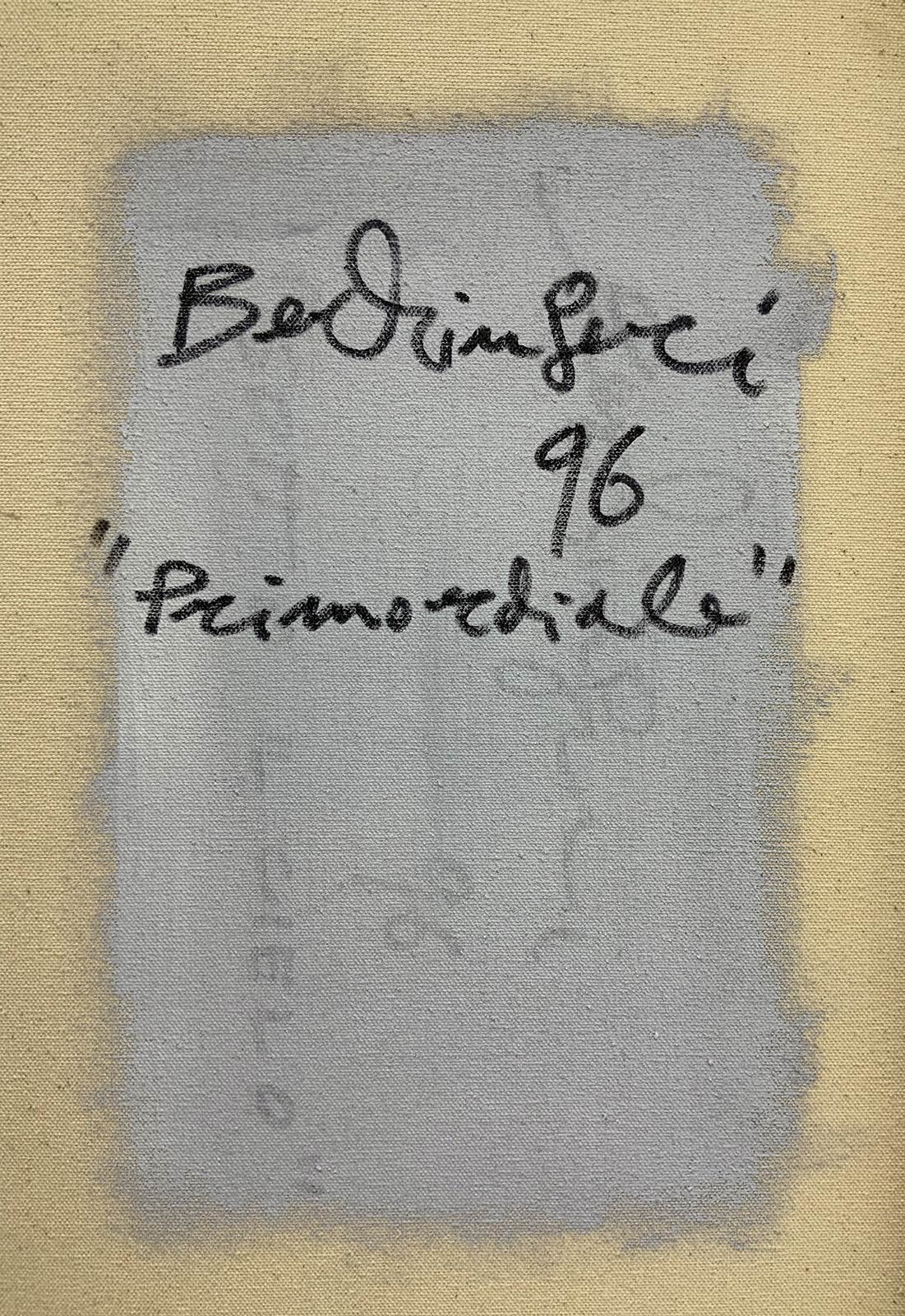 Dipinto ad olio su tela, composizione astratta “Primordiale” di Cesare Berlingeri (1948 Cittanova). Cm 60x70. Firmato e datato 1996 sul retro. Certificato d’autenticità su foto Toluian.