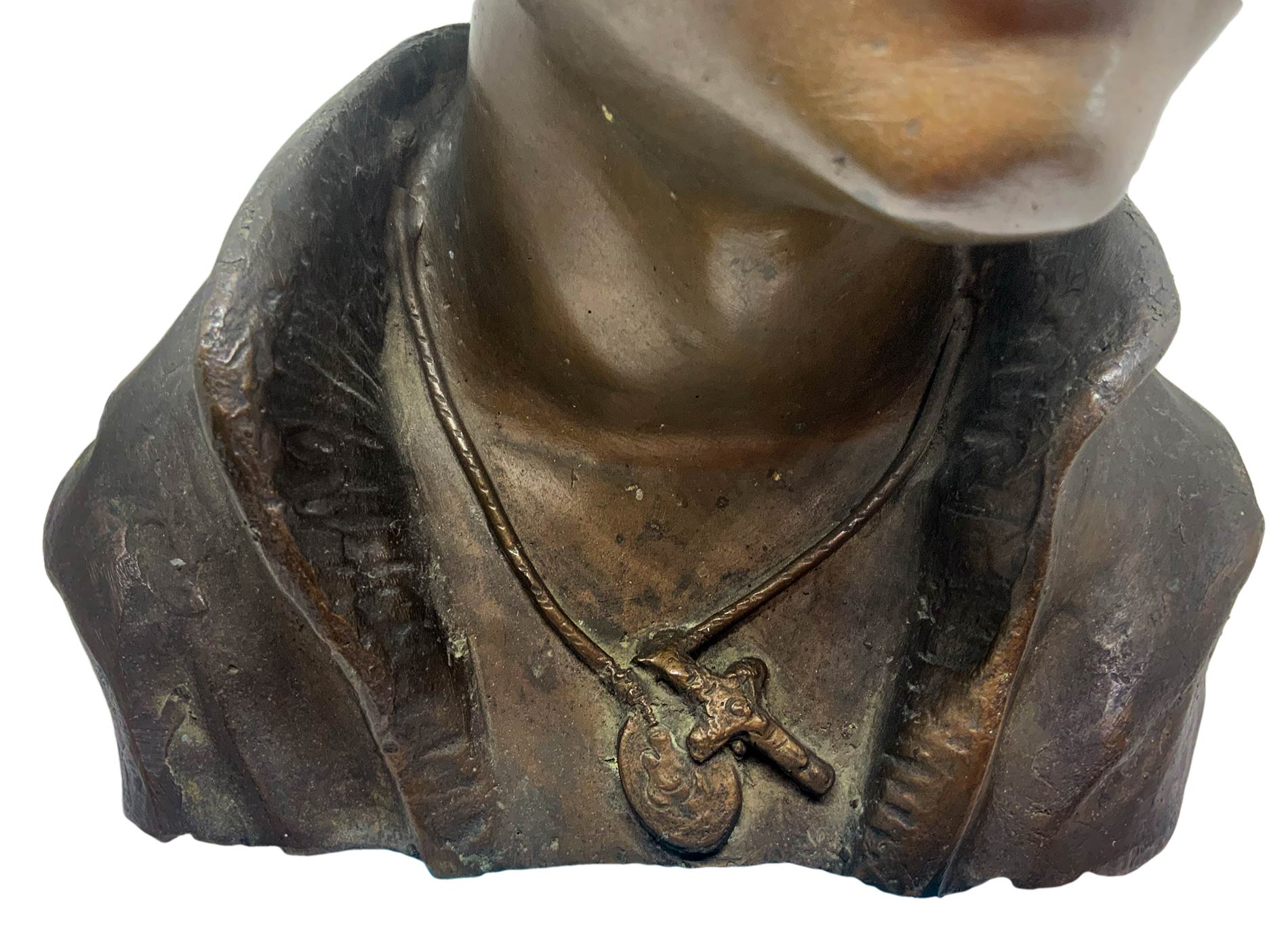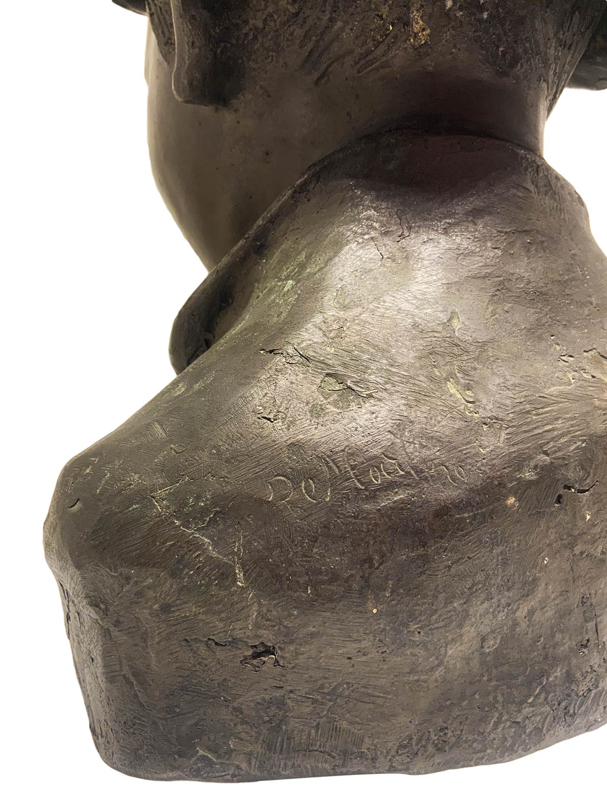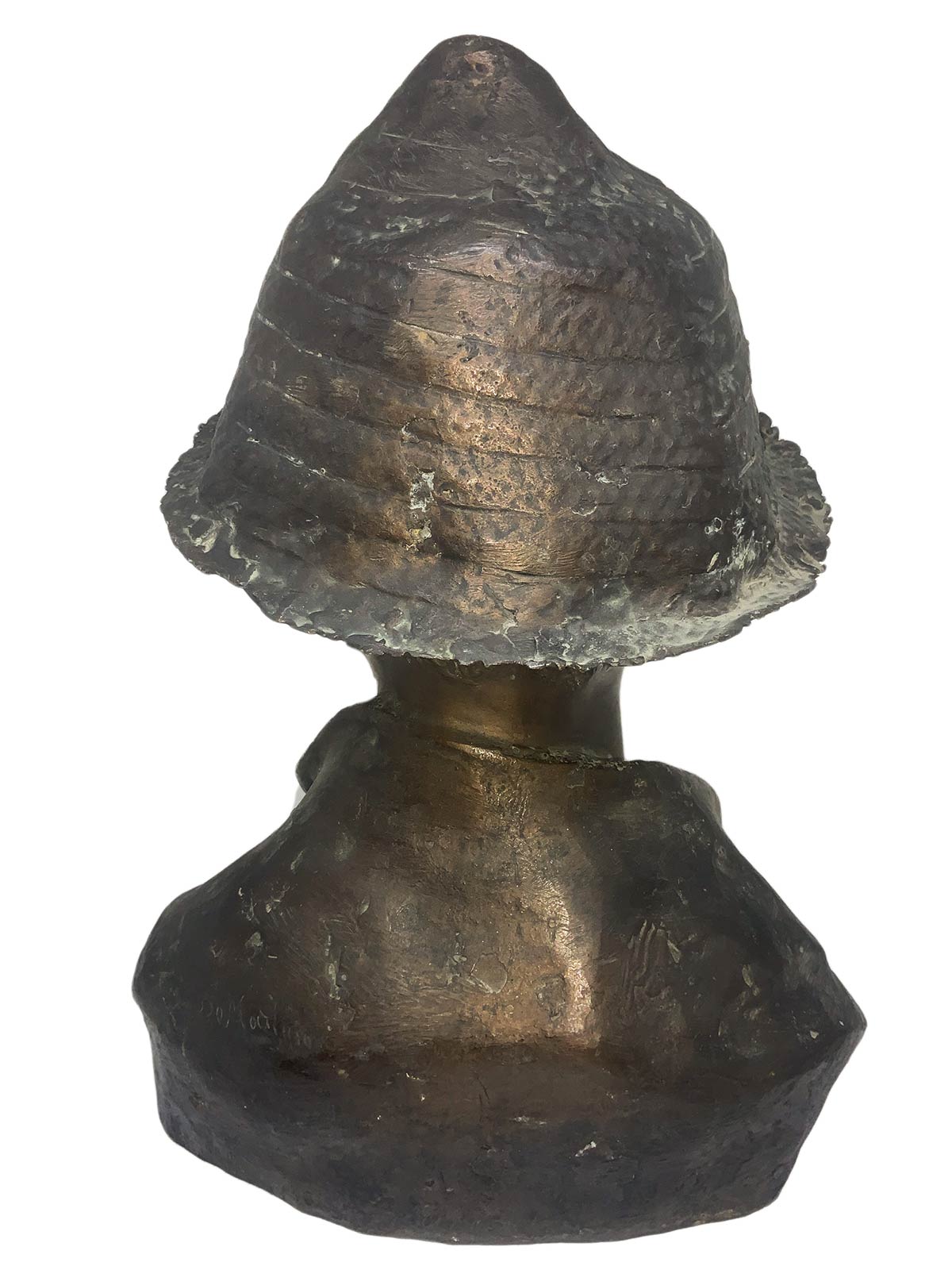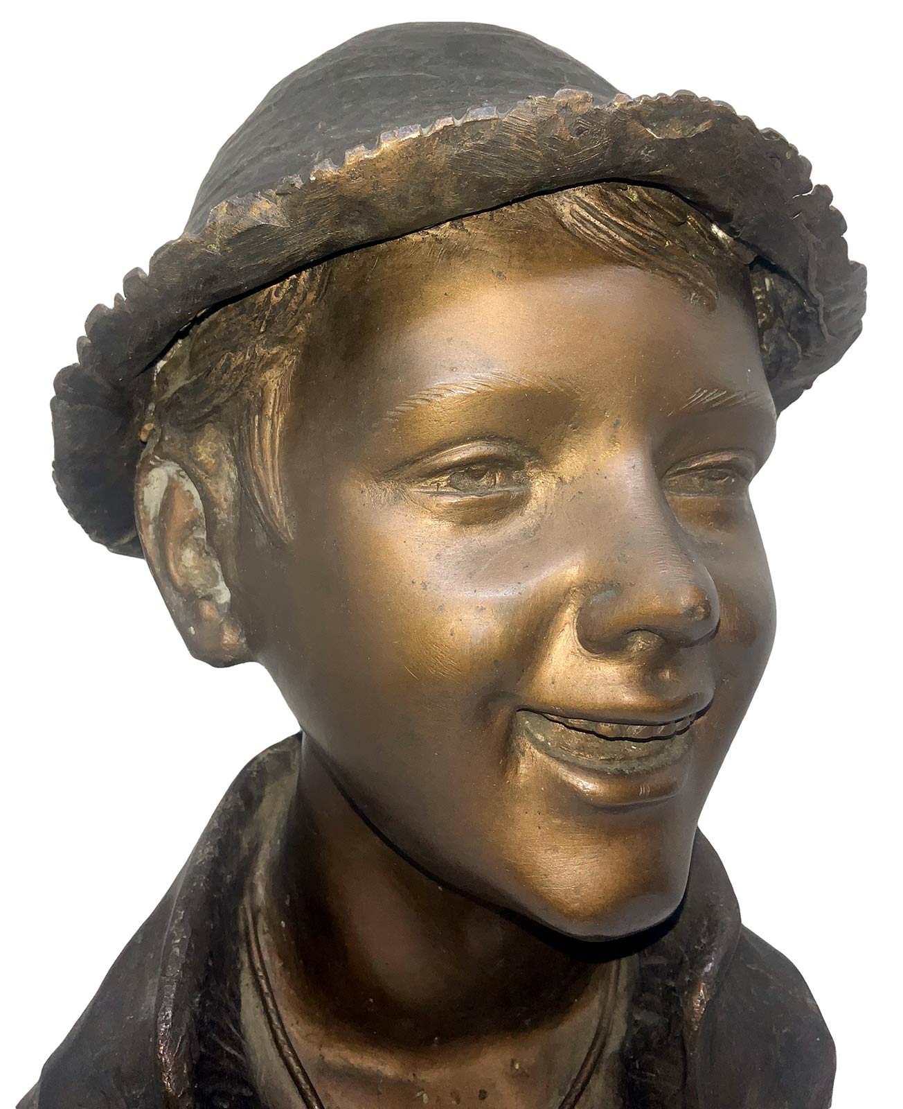 Bronzo raffigurante ragazzo con cappello, patinato bruno a cera persa. H cm 33.