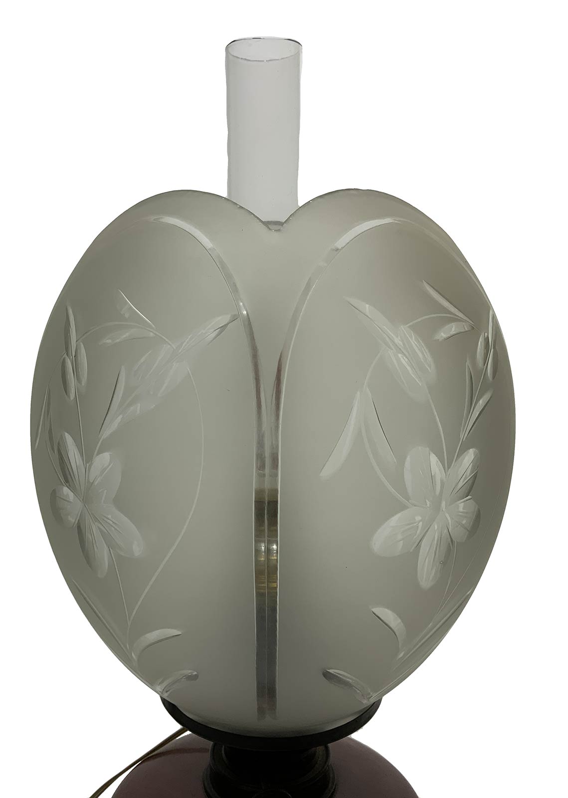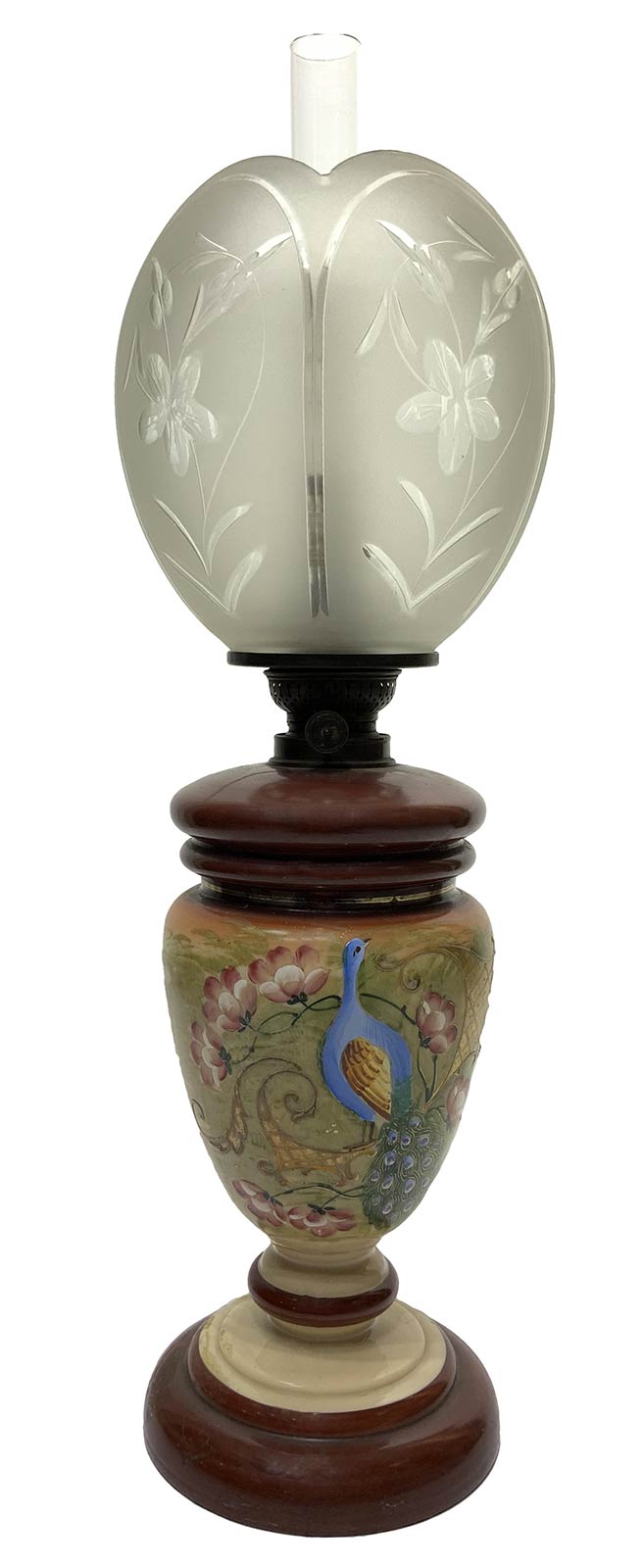 Lume a petrolio con decori di pavoni e coppa in vetro con incisioni floreali, XX secolo. H cm 56.