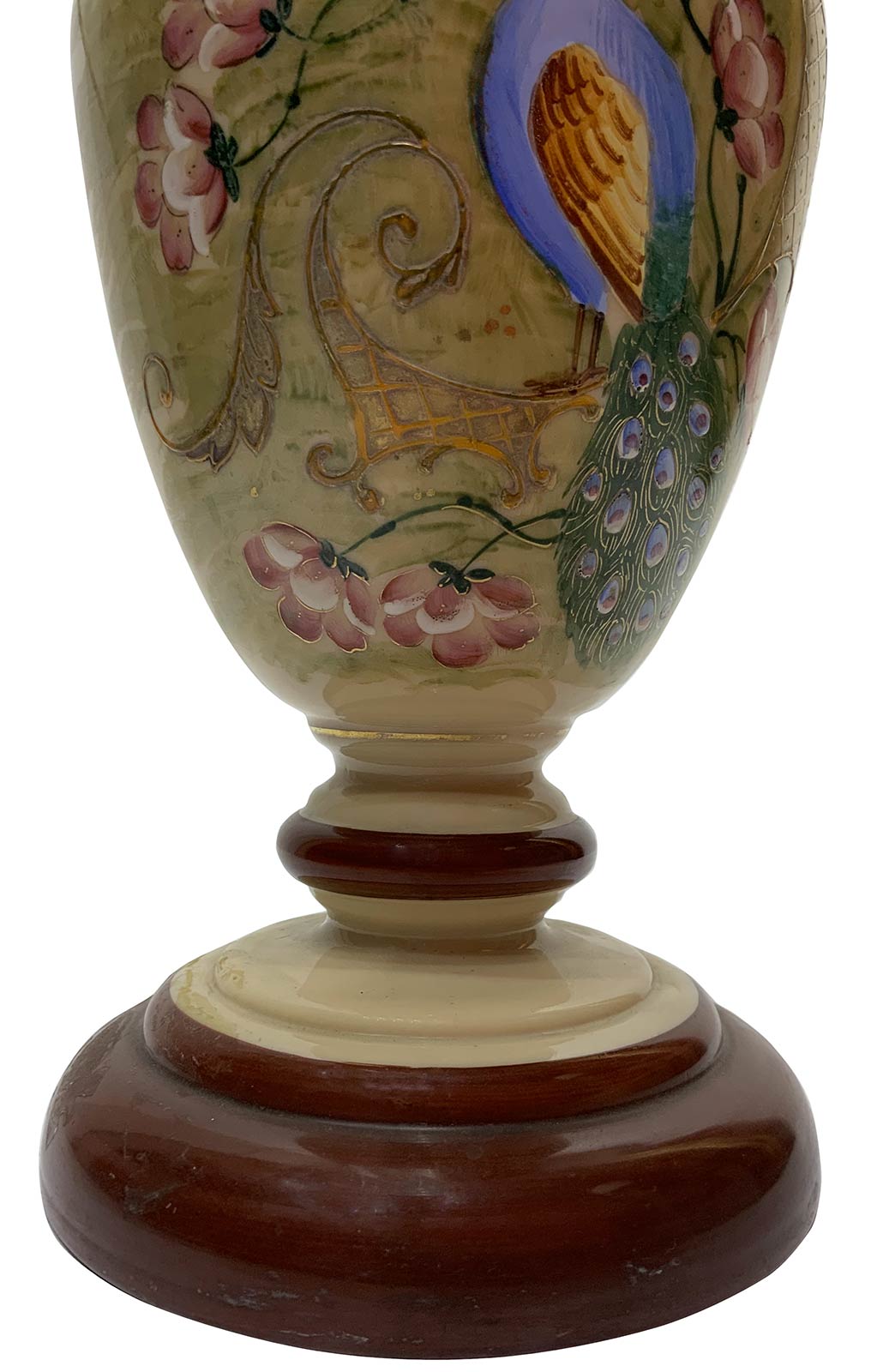 Lume a petrolio con decori di pavoni e coppa in vetro con incisioni floreali,...