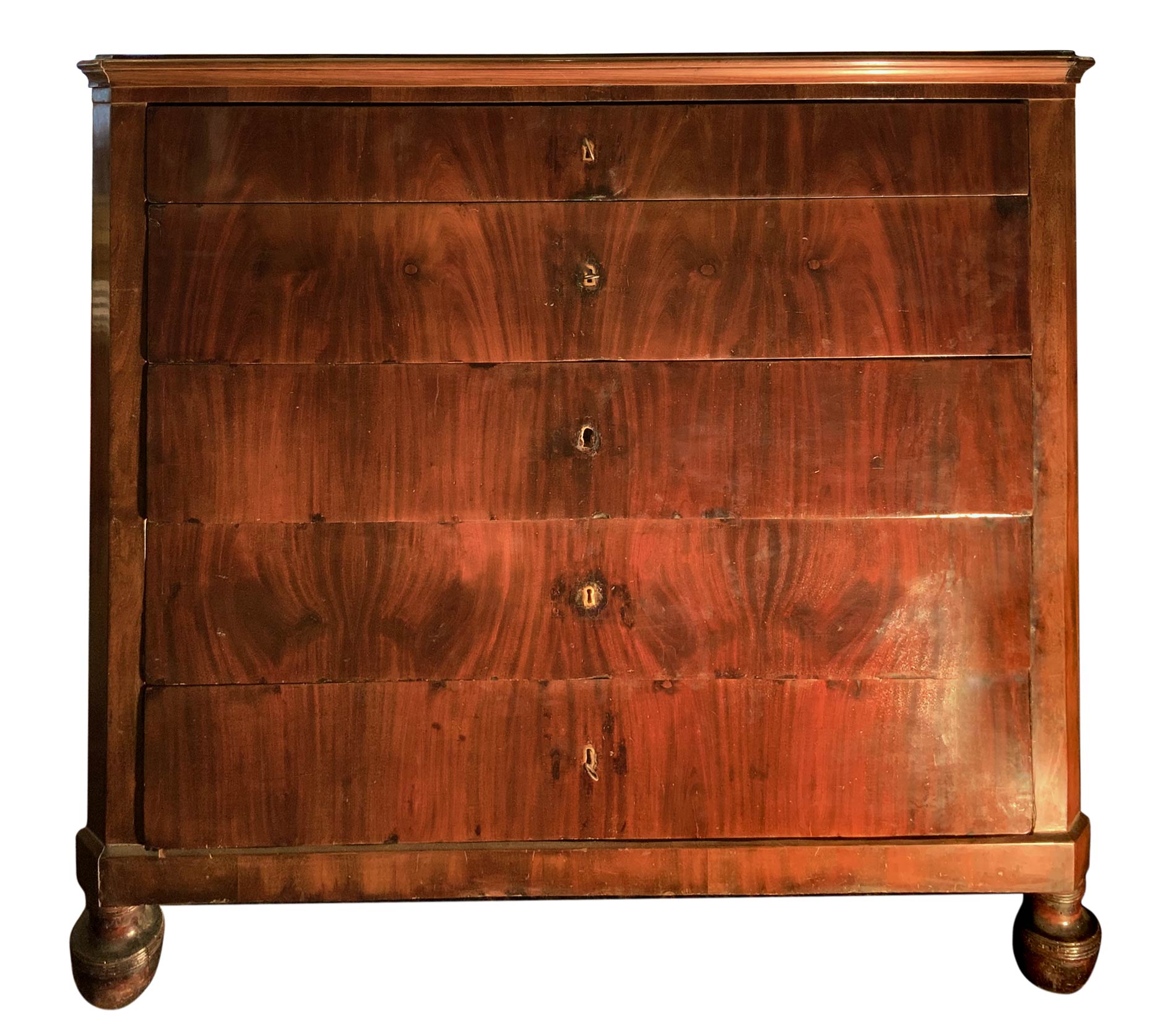 Cassettone in piuma di mogano a cinque cassetti. Sicilia, XIX secolo. H cm 126. Lunghezza cm 135. Profondità cm 45.