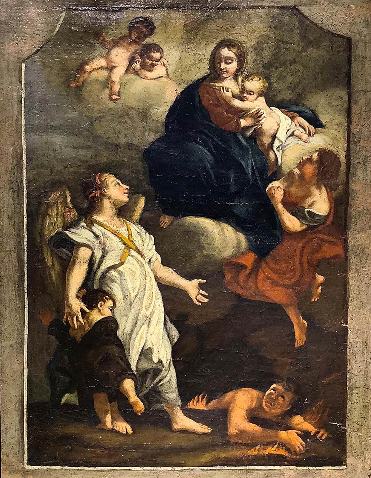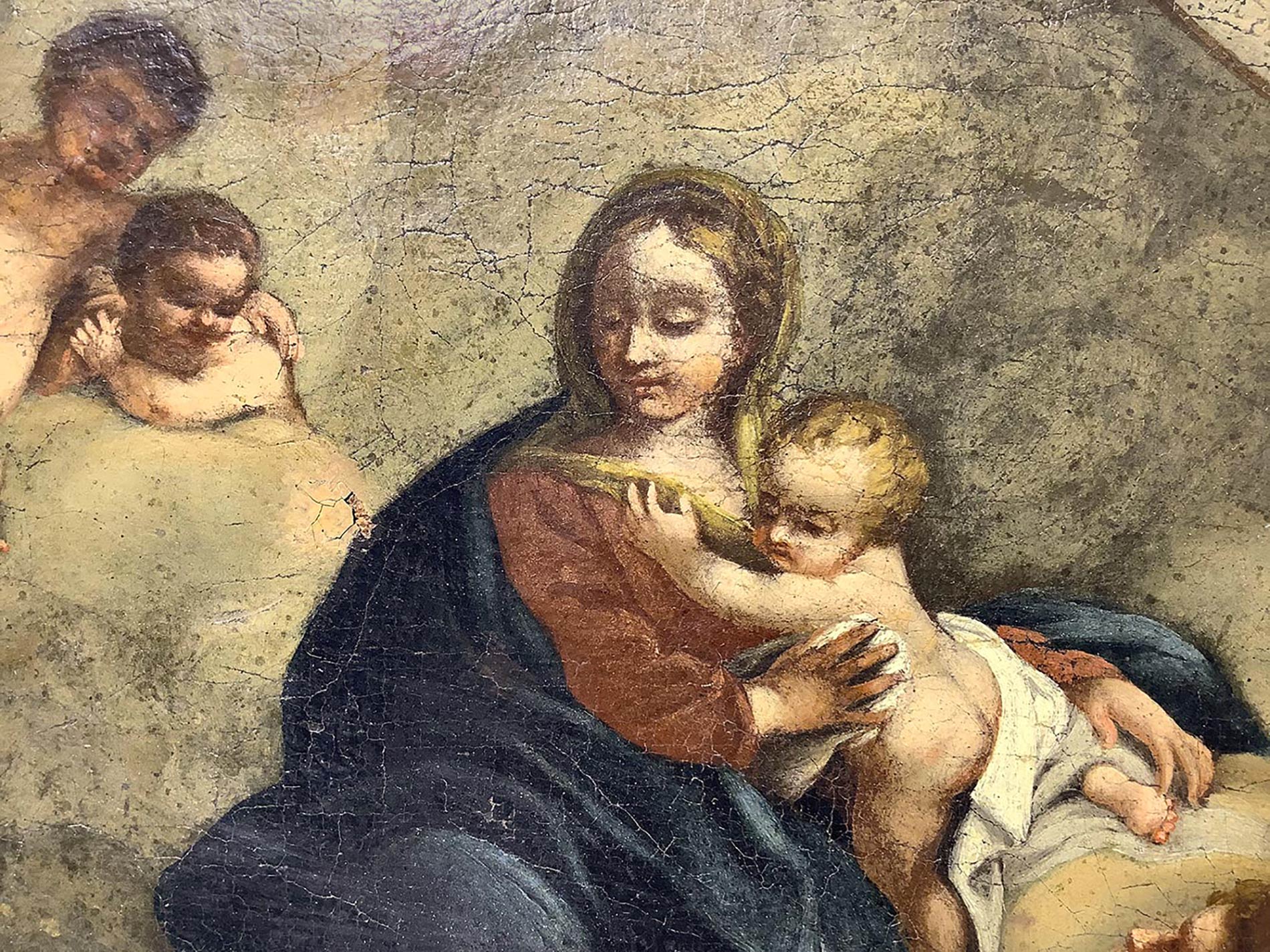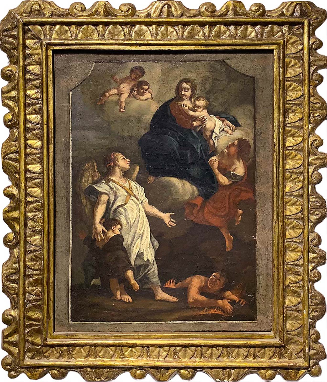 Dipinto ad olio su tela raffigurante Madonna con Bambino e Angeli, bozzetto, XVIII secolo, Italia. Cm 48x35.