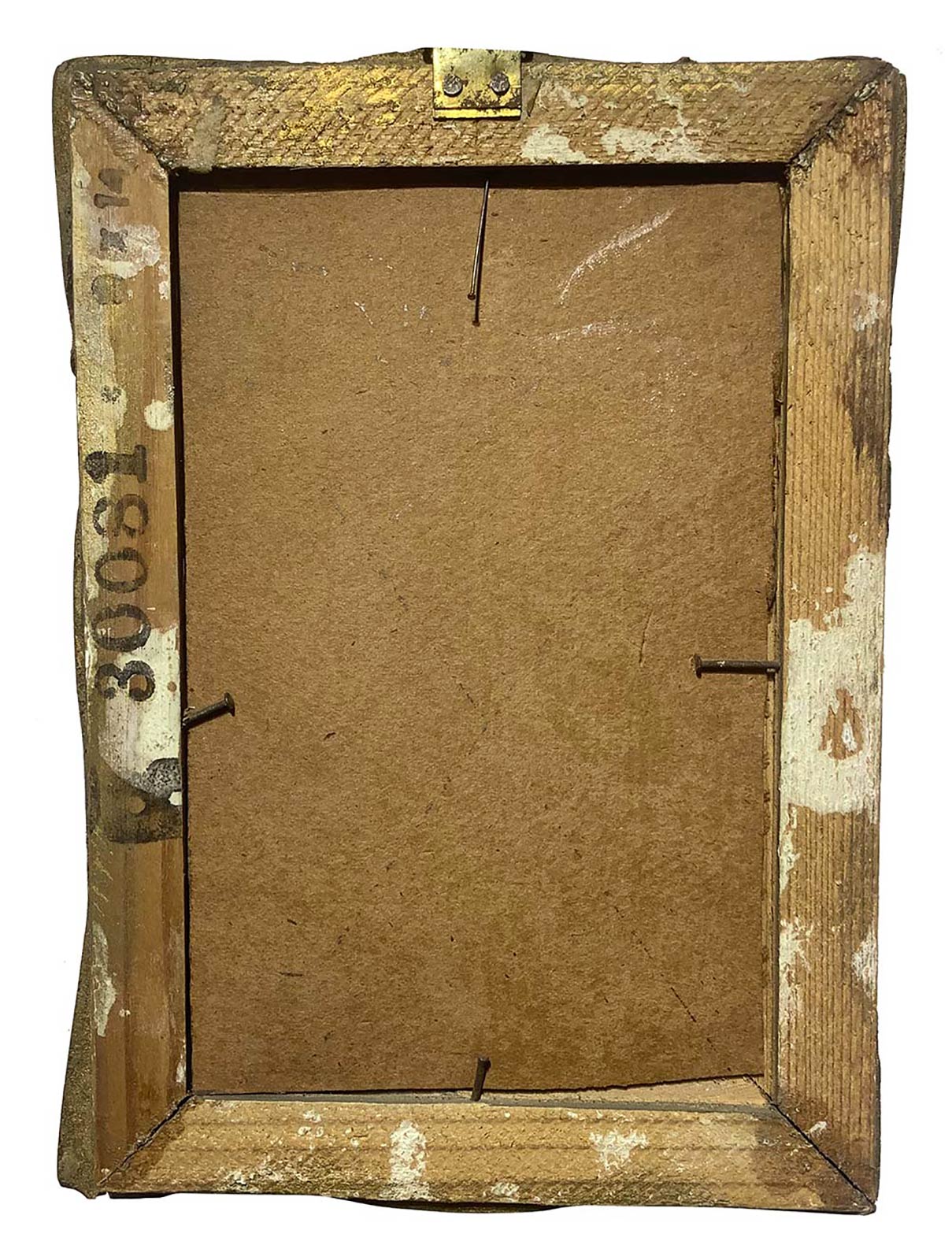 Dipinto raffigurante paesaggio con case di Elvira Del Giudice. 14x9, olio su masonite. Firmato in alto a destra.