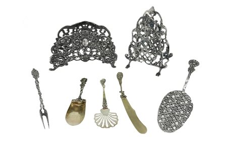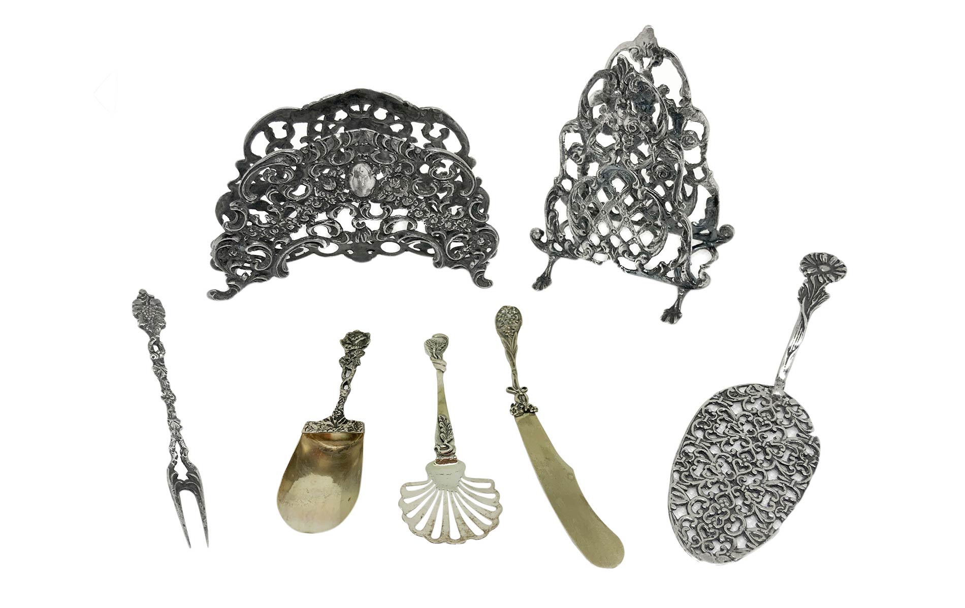 Gruppo di oggetti in argento 800. Portatovaglioli e piccole posate da portata. Gr 210