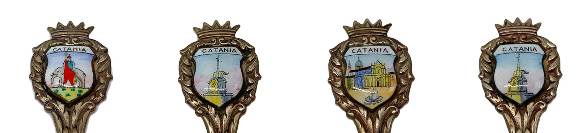 6 forchettine in argento 800 con smalti raffiguranti simboli della città di Catania. H cm 11.