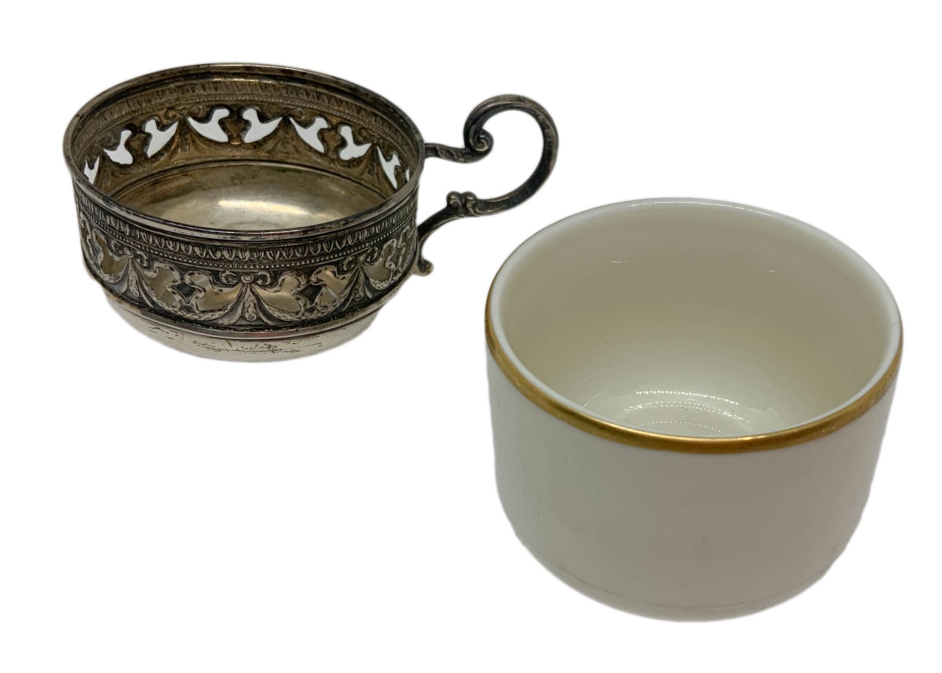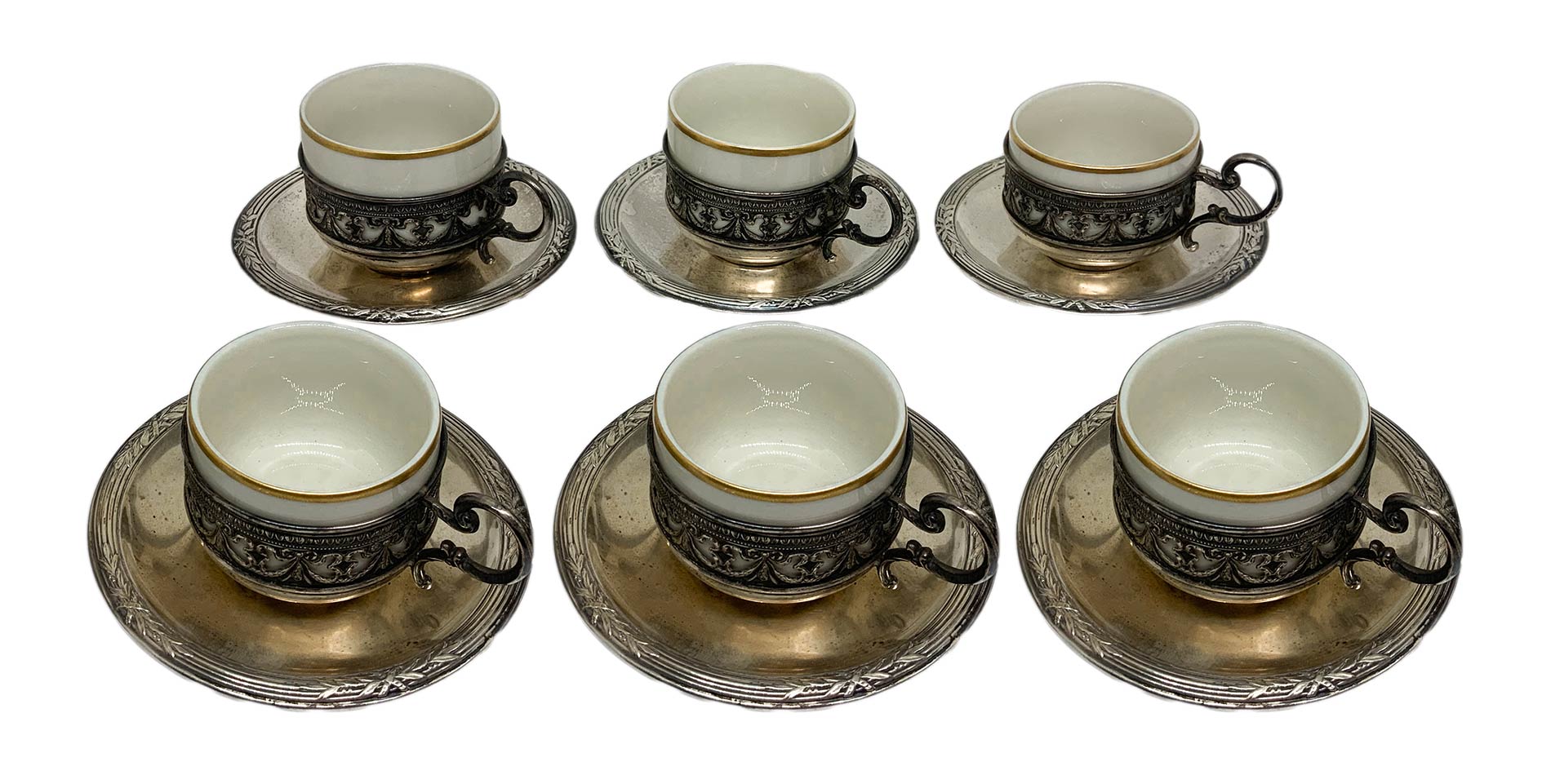 servizio da caffè in porcellana e argento, XX secolo. Composto da: 6 tazzine da caffè con base e piattini in argento.