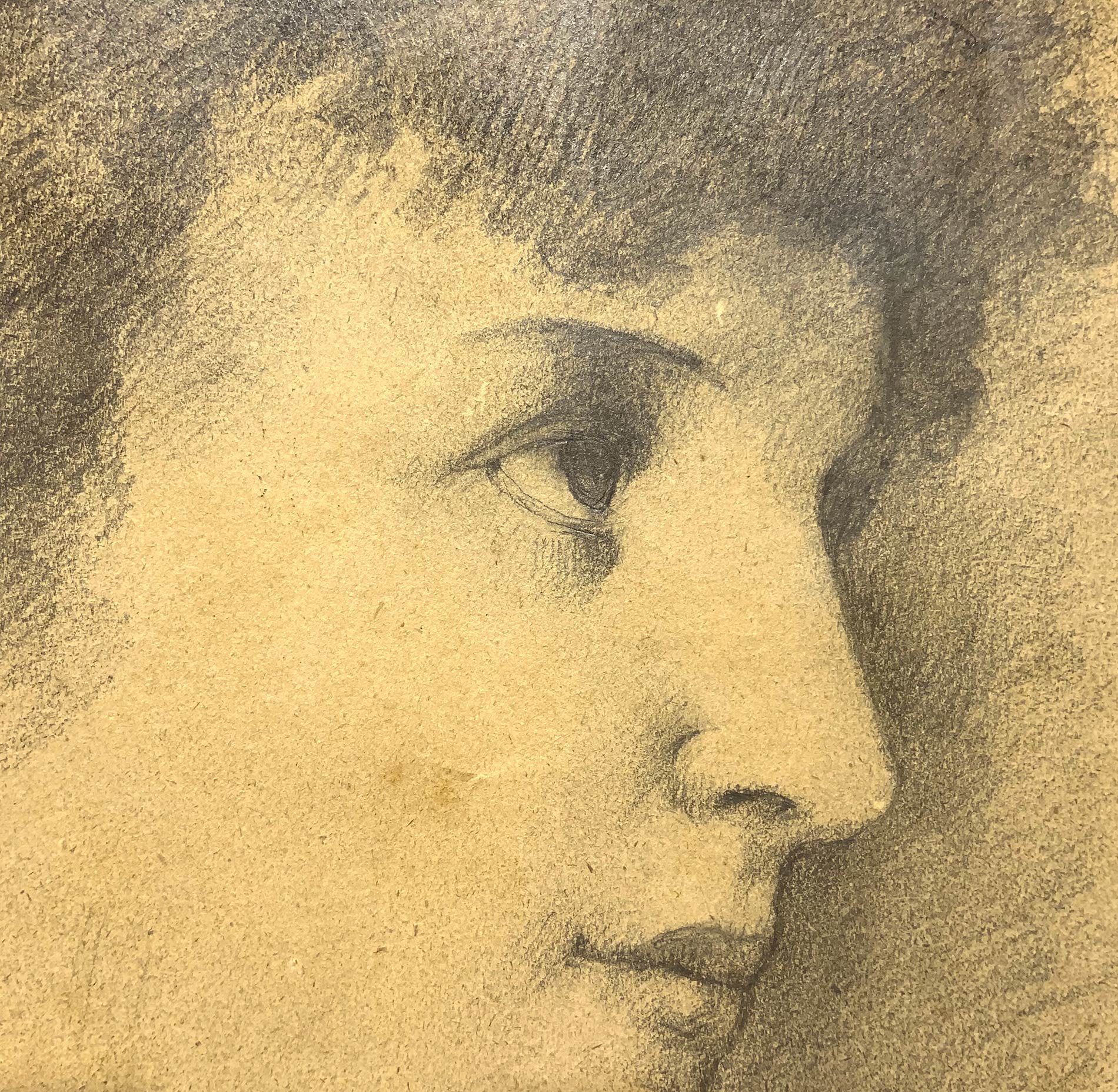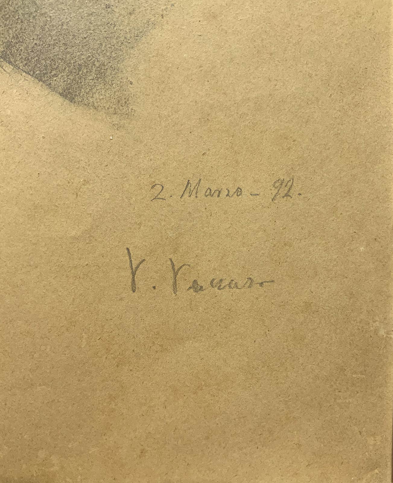 Disegno a matita su carta raffigurante viso di donna di Vincenzo Vaccaro (1858-1929). Cm 37x25, firmato e datato in basso a destra 2 Marzo 1892 V. Vaccaro.