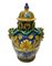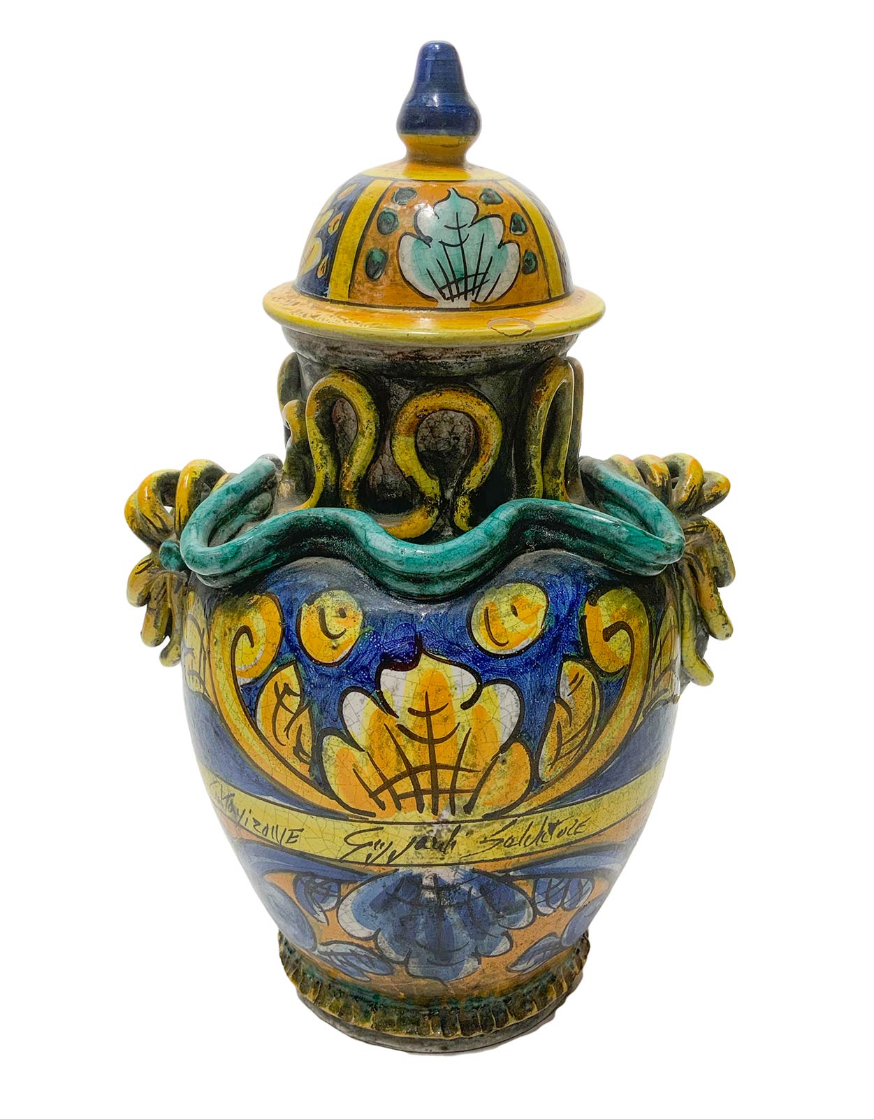 Poutiche in maiolica di Caltagirone, figura antropomorfa di donna policroma nei toni del blu, giallo e verde. H cm 38. Firmato sul retro Guzzardi Salvatore.