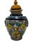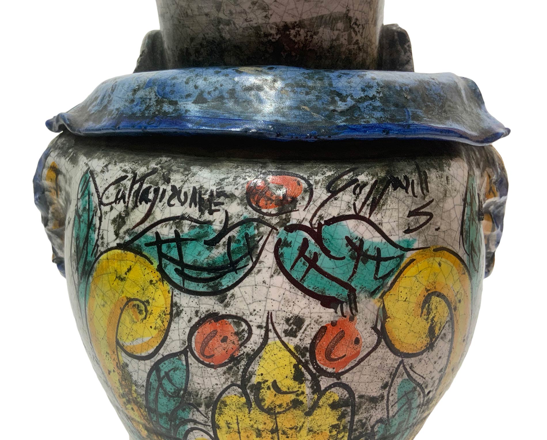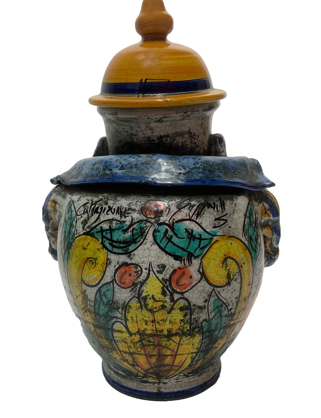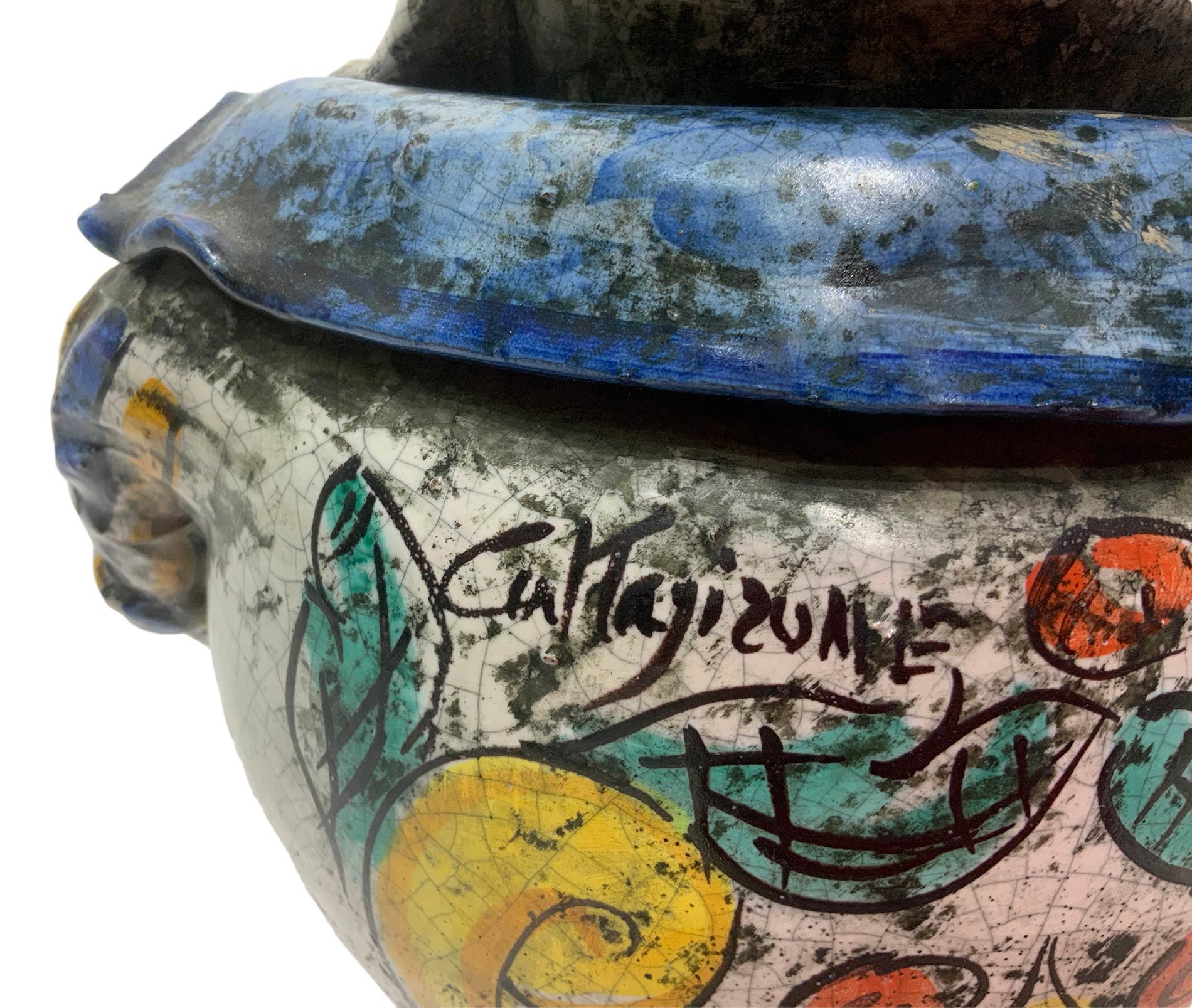 Poutiche in maiolica di Caltagirone. Figura antropomorfa di uomo policroma nei toni del blu, giallo e verde. H cm 38. Firmato sul retro Guzzardi Salvatore