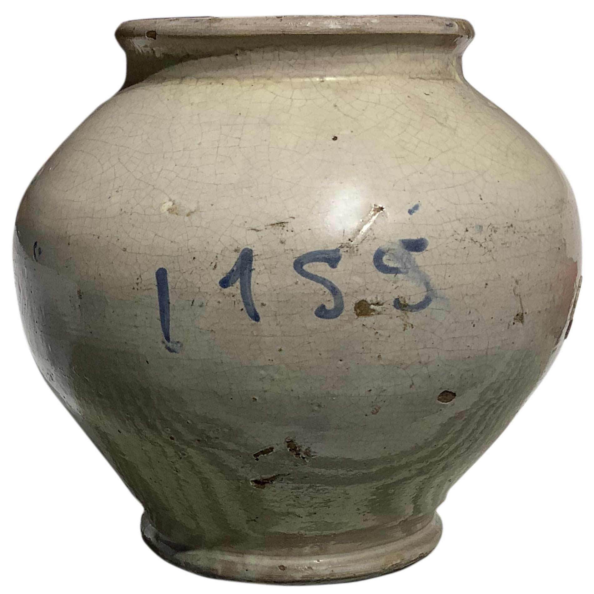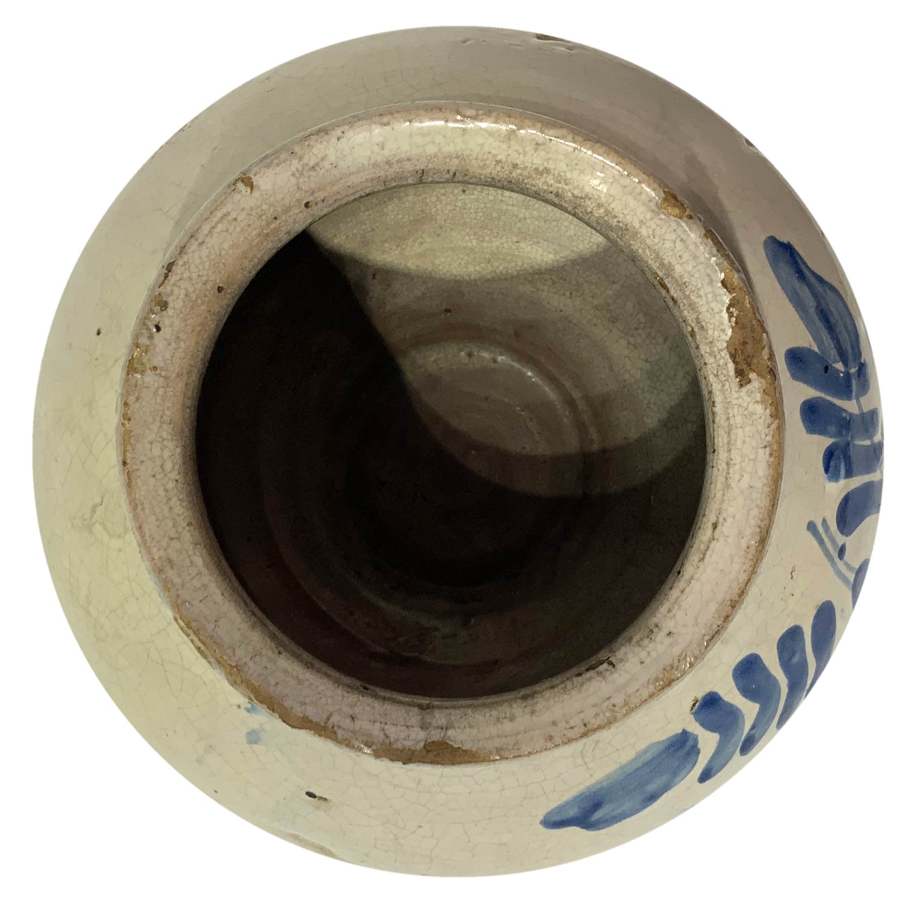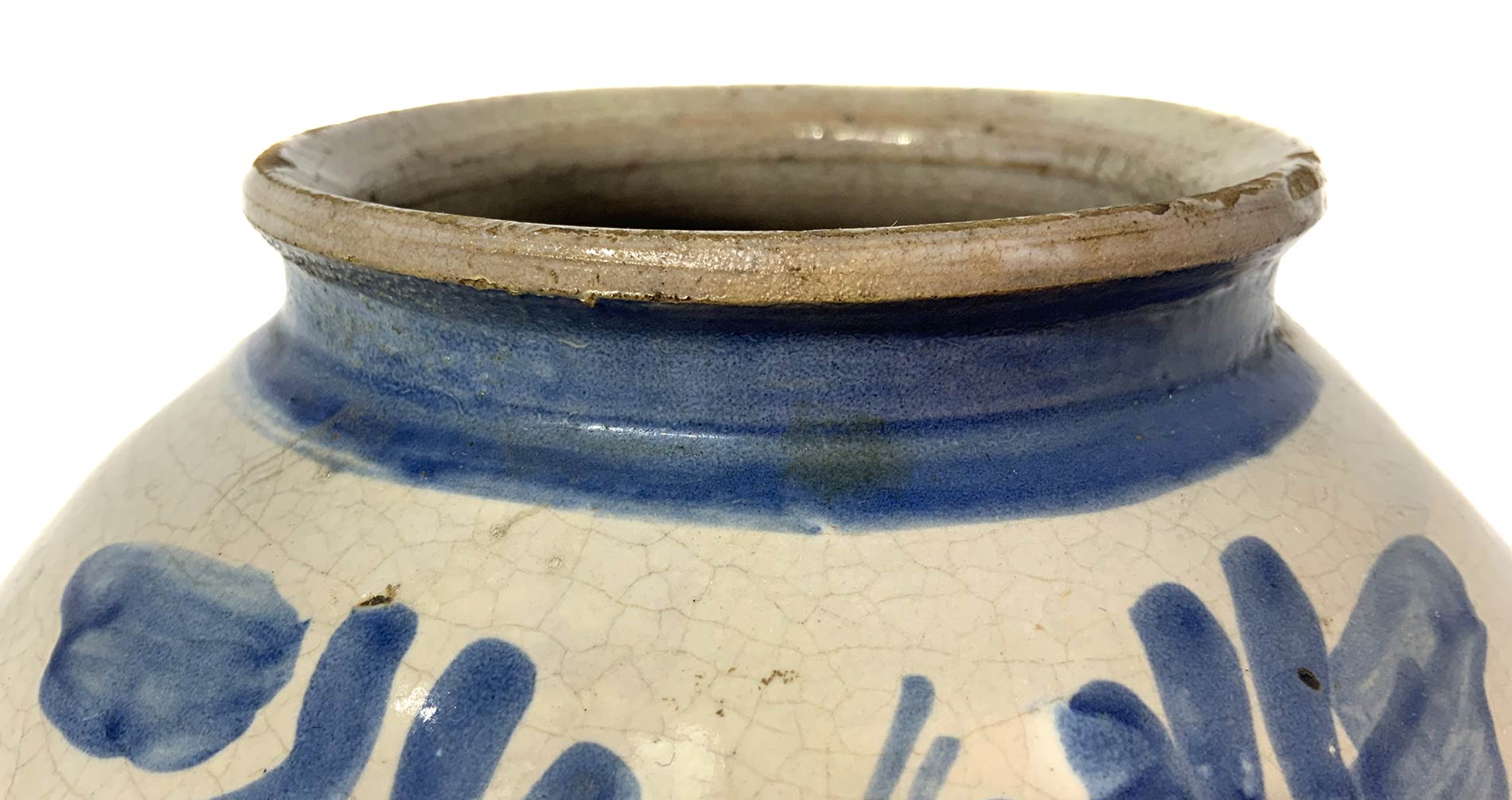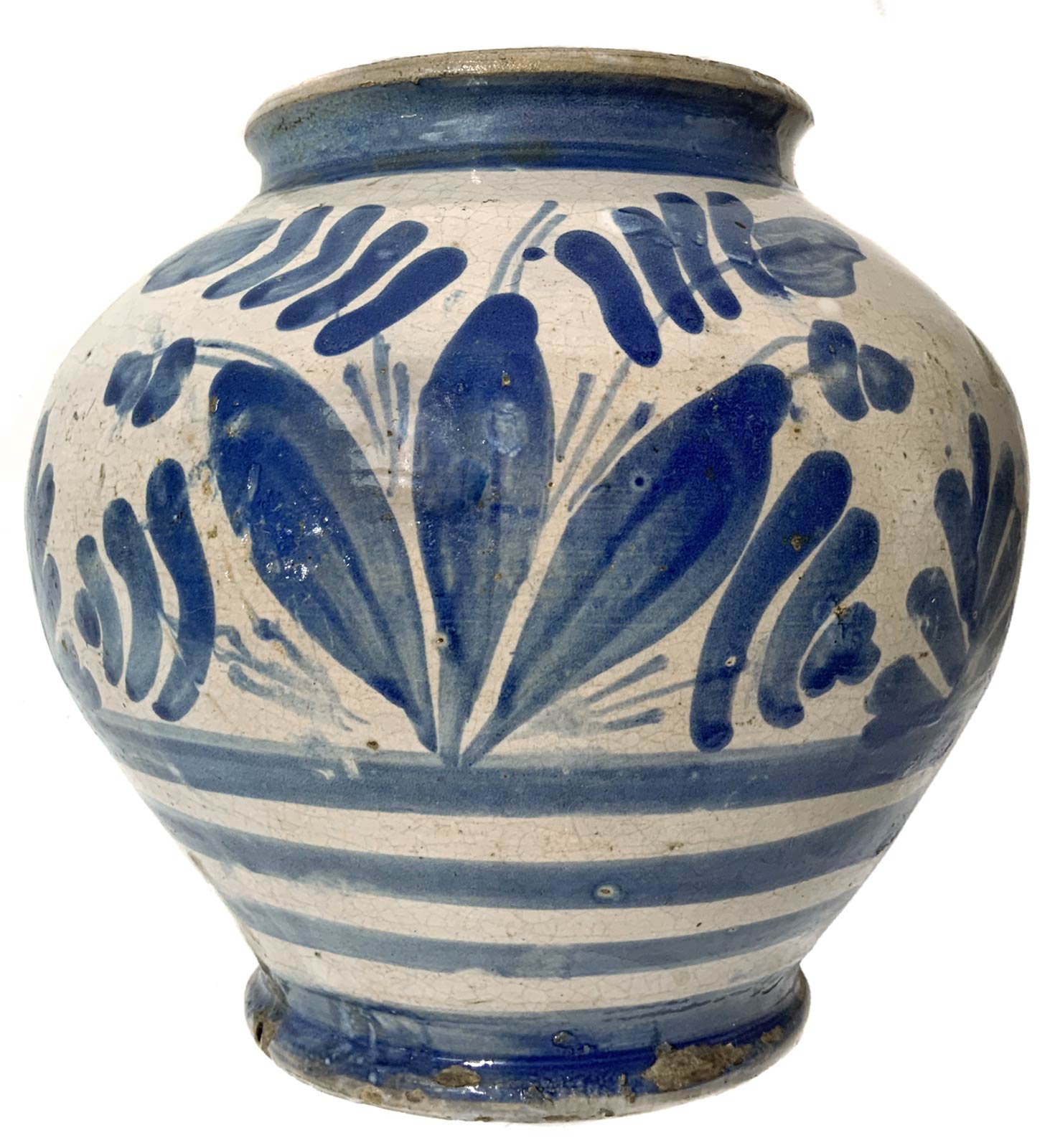 Boccia in maiolica di Caltagirone, Sicilia, 1755. Decorata con fogliame azzurro. H cm 17. Datata 1755.