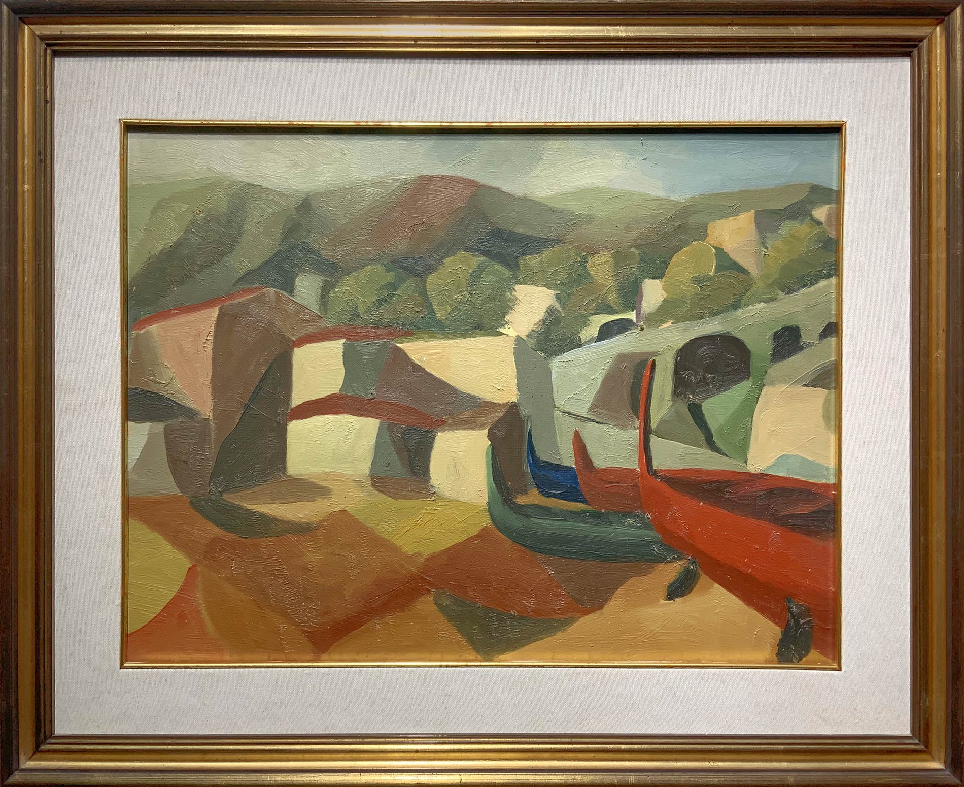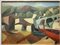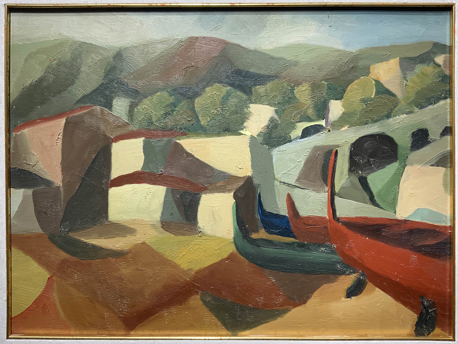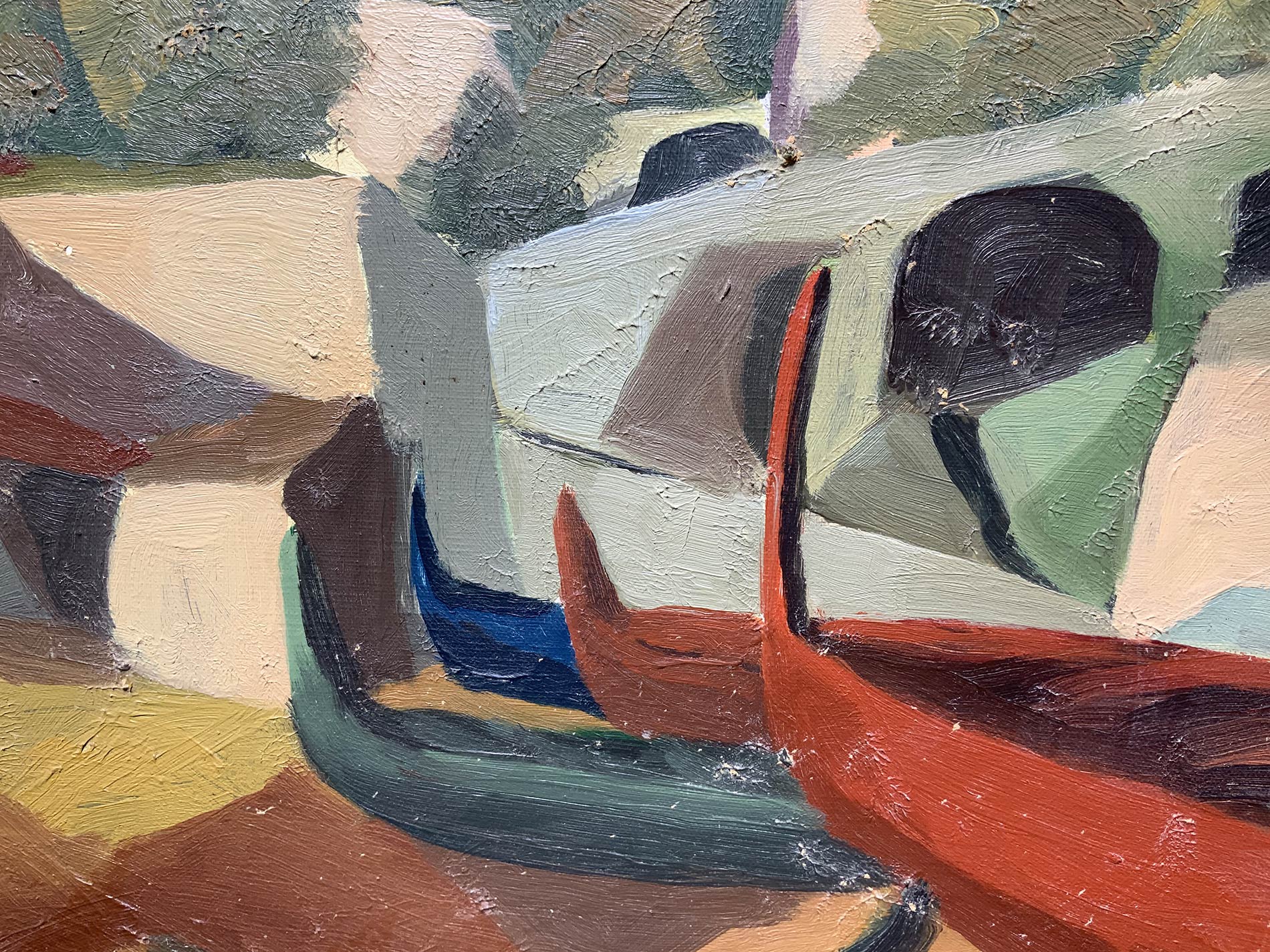 Dipinto ad olio su tela raffigurante barche a secco. Opera espressionistica degli anni '50. Cm 45x60.