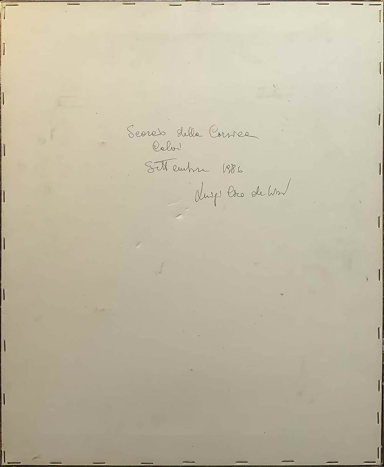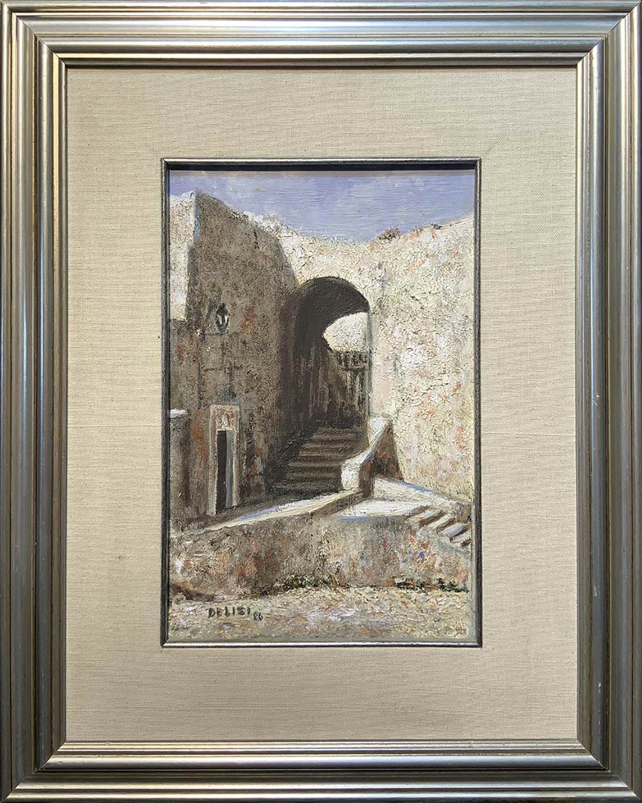 Dipinto ad olio su tela raffigurante scorcio di paese, De Lisi. Cm 29x18,5, olio su tela. Firmato e datato 1986 in basso a sinistra.