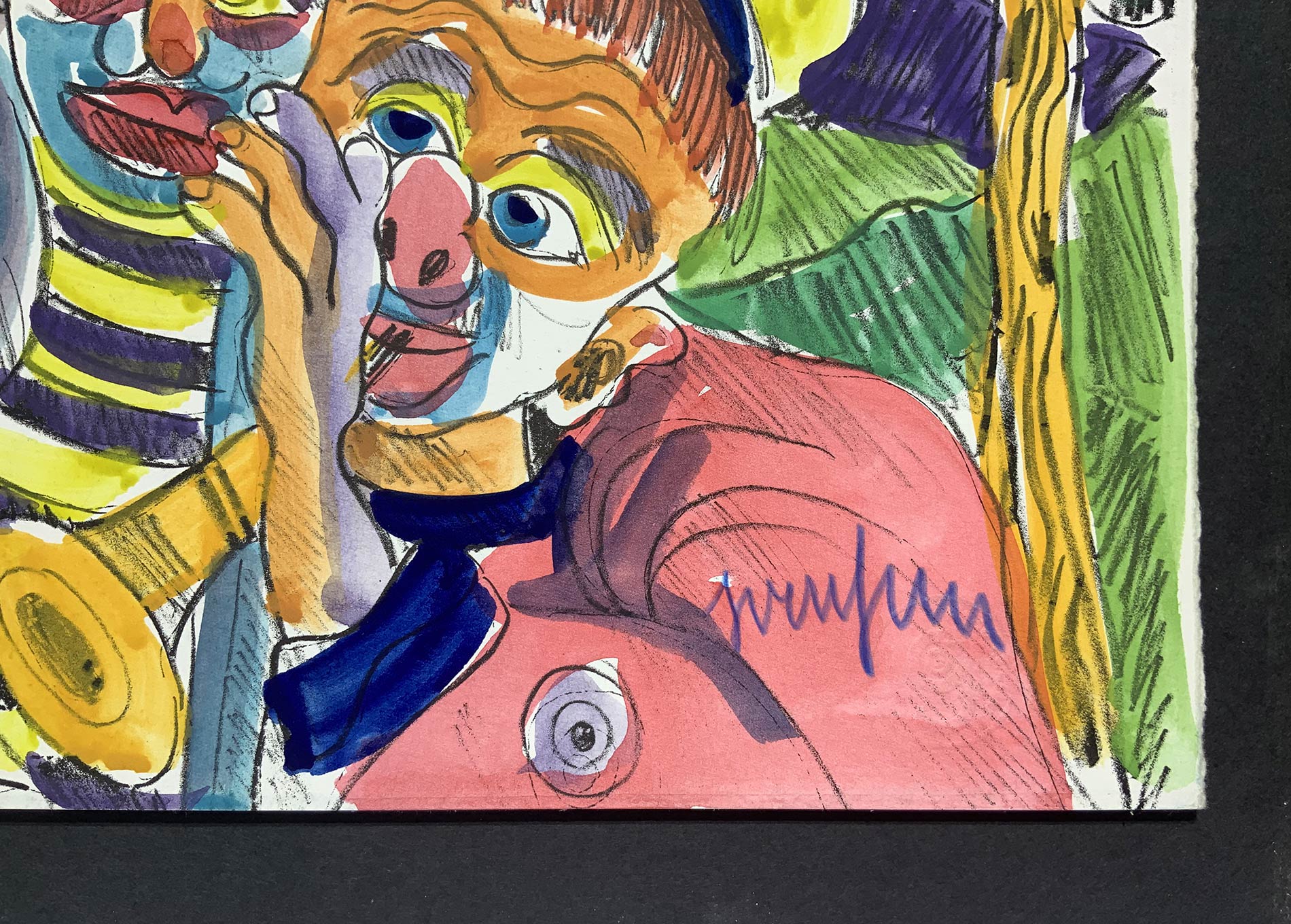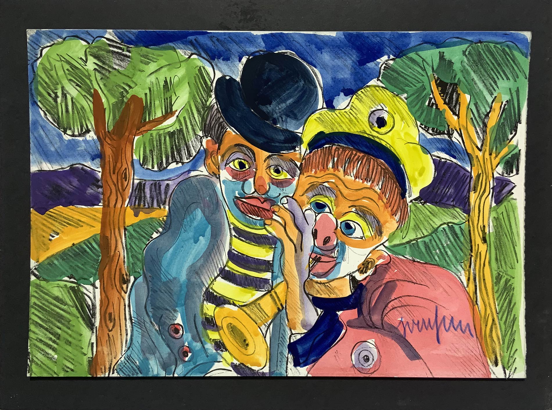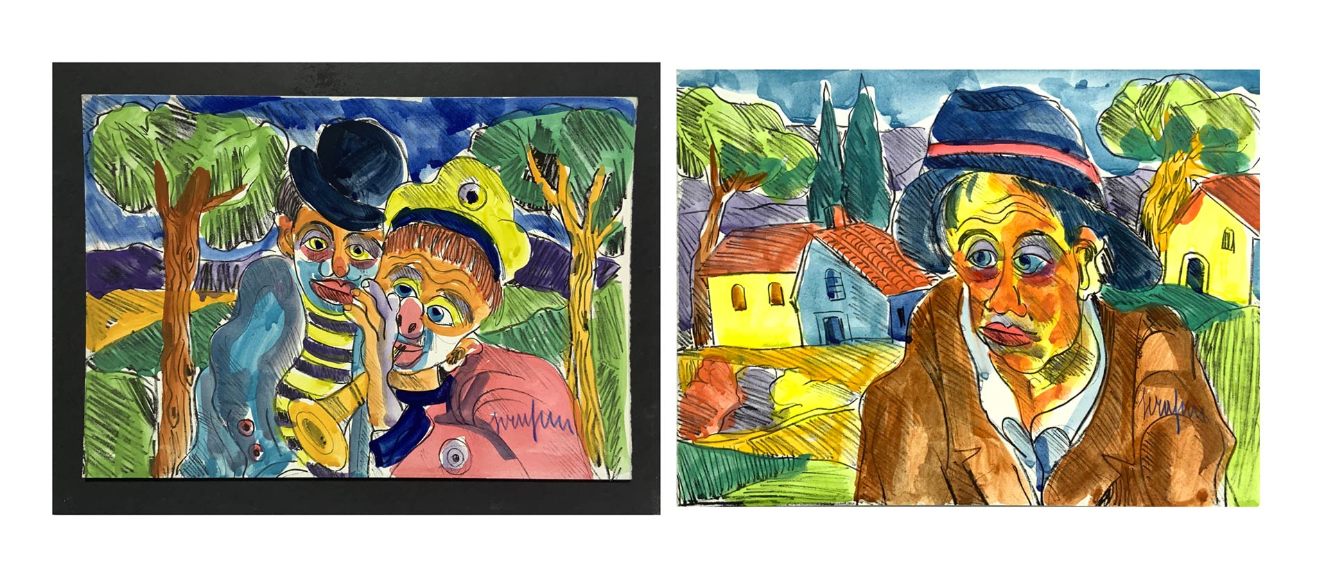 Coppia di disegni ad acquarello e tecnica mista su carta raffiguranti figure di Beppe (Giuseppe) Serafini (1915, Montelupo Fiorentino - 1987, Montelupo Fiorentino). Cm 25x35, firmate in basso a destra.