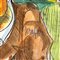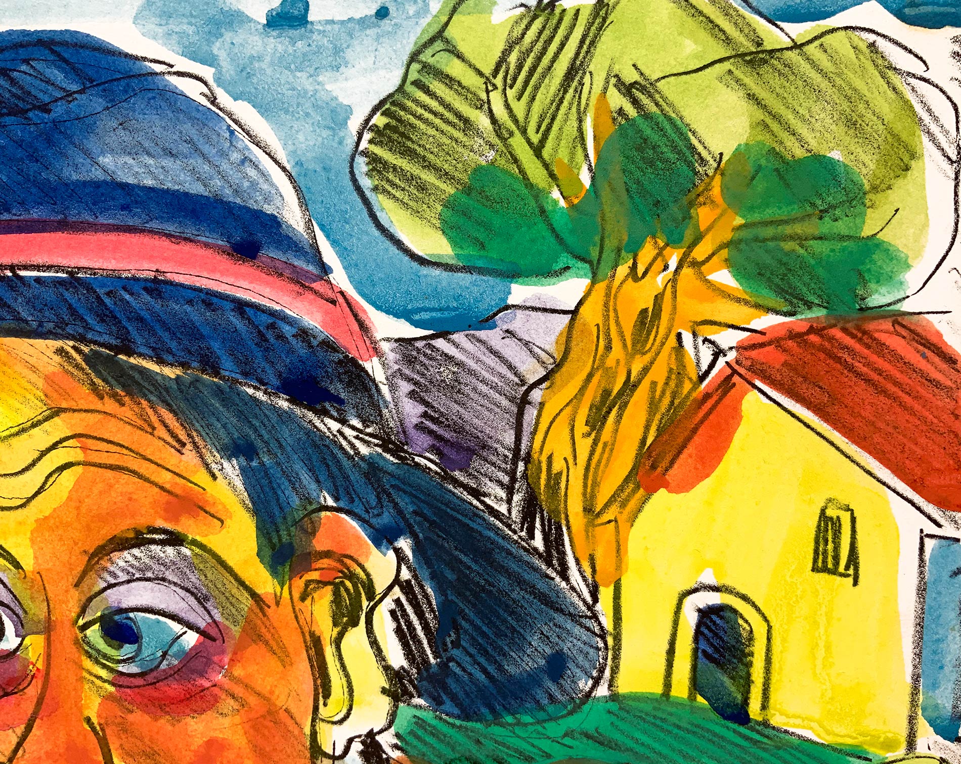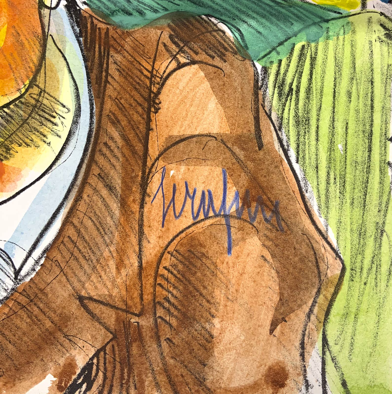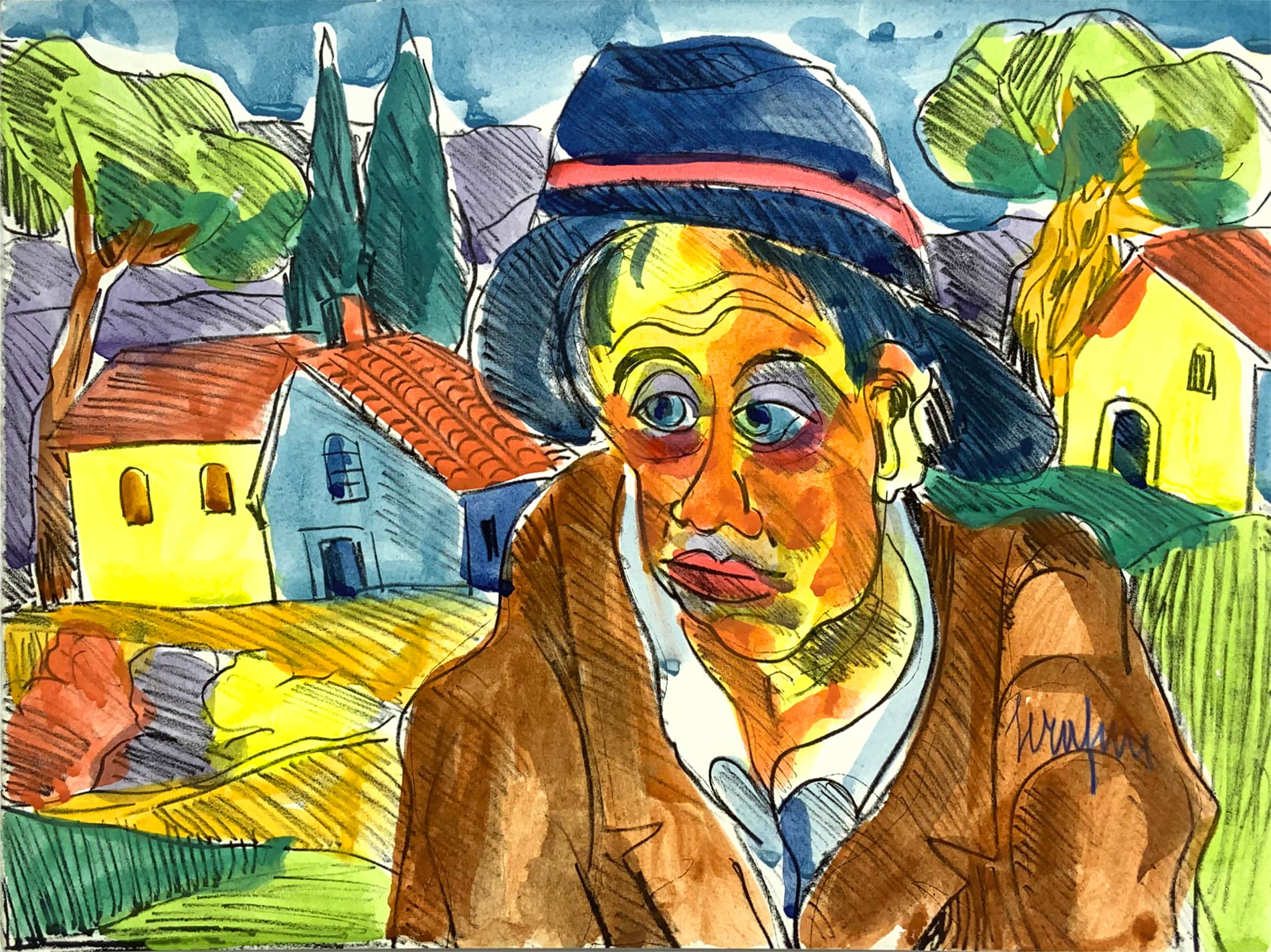 Coppia di disegni ad acquarello e tecnica mista su carta raffiguranti figure di Beppe (Giuseppe) Serafini (1915, Montelupo Fiorentino - 1987, Montelupo Fiorentino). Cm 25x35, firmate in basso a destra.