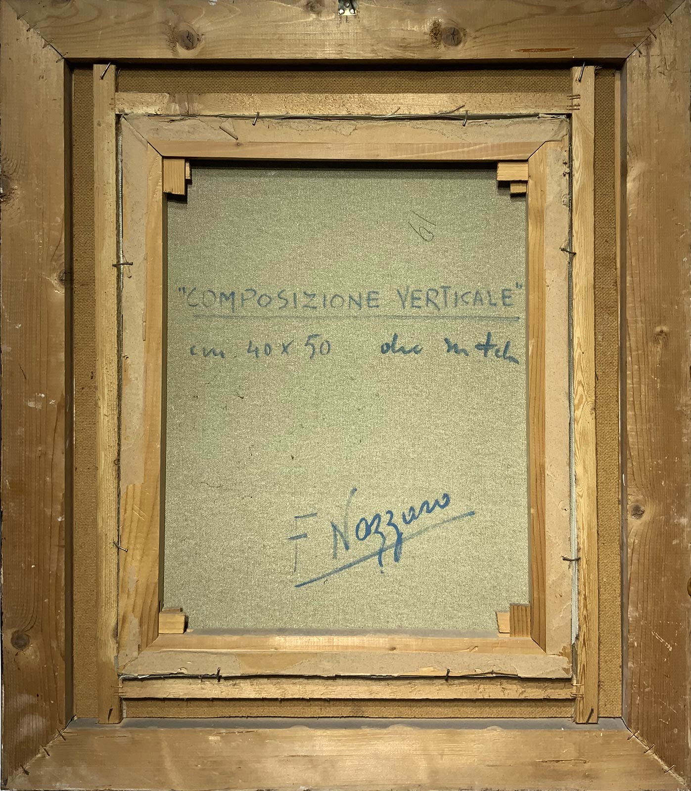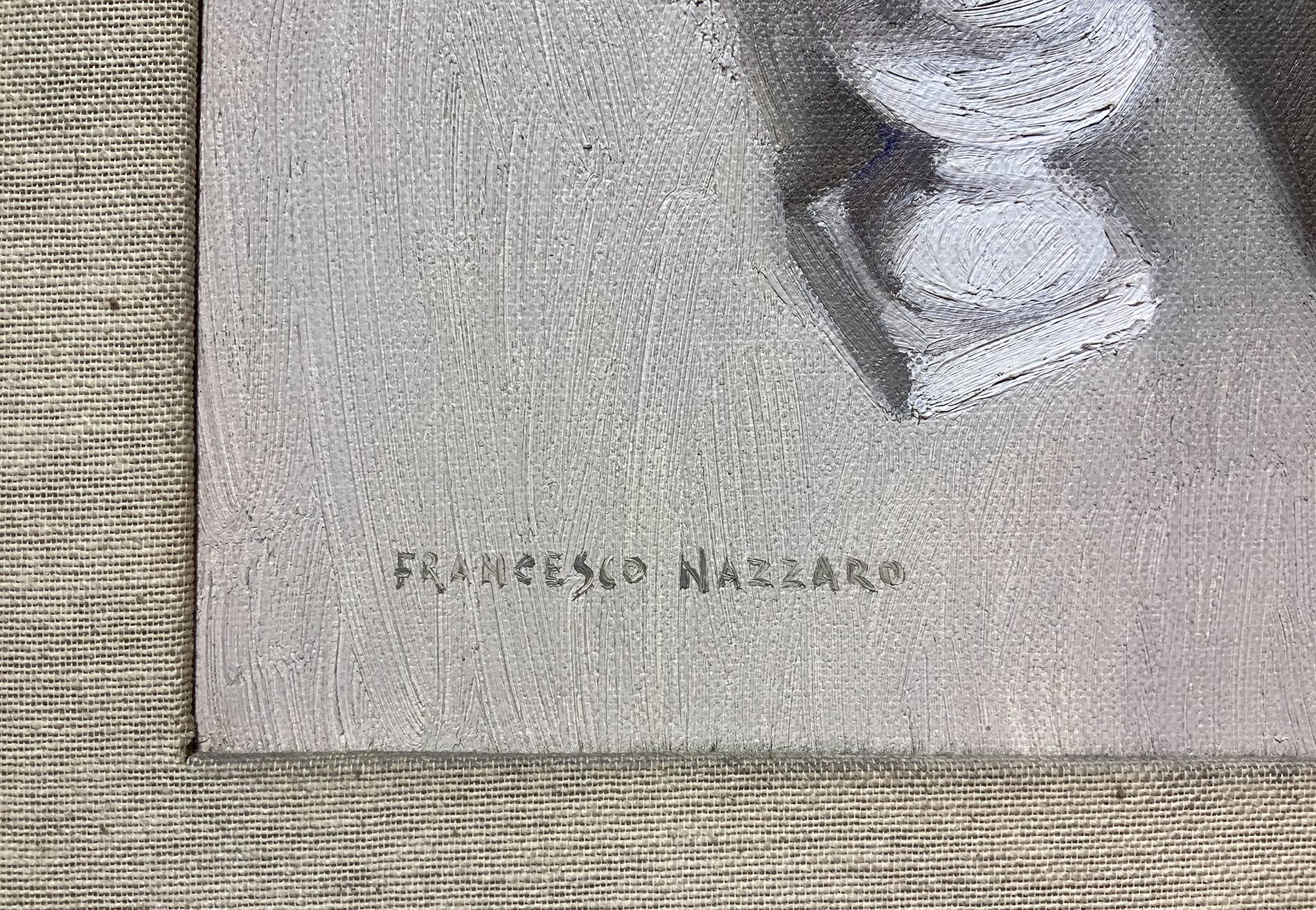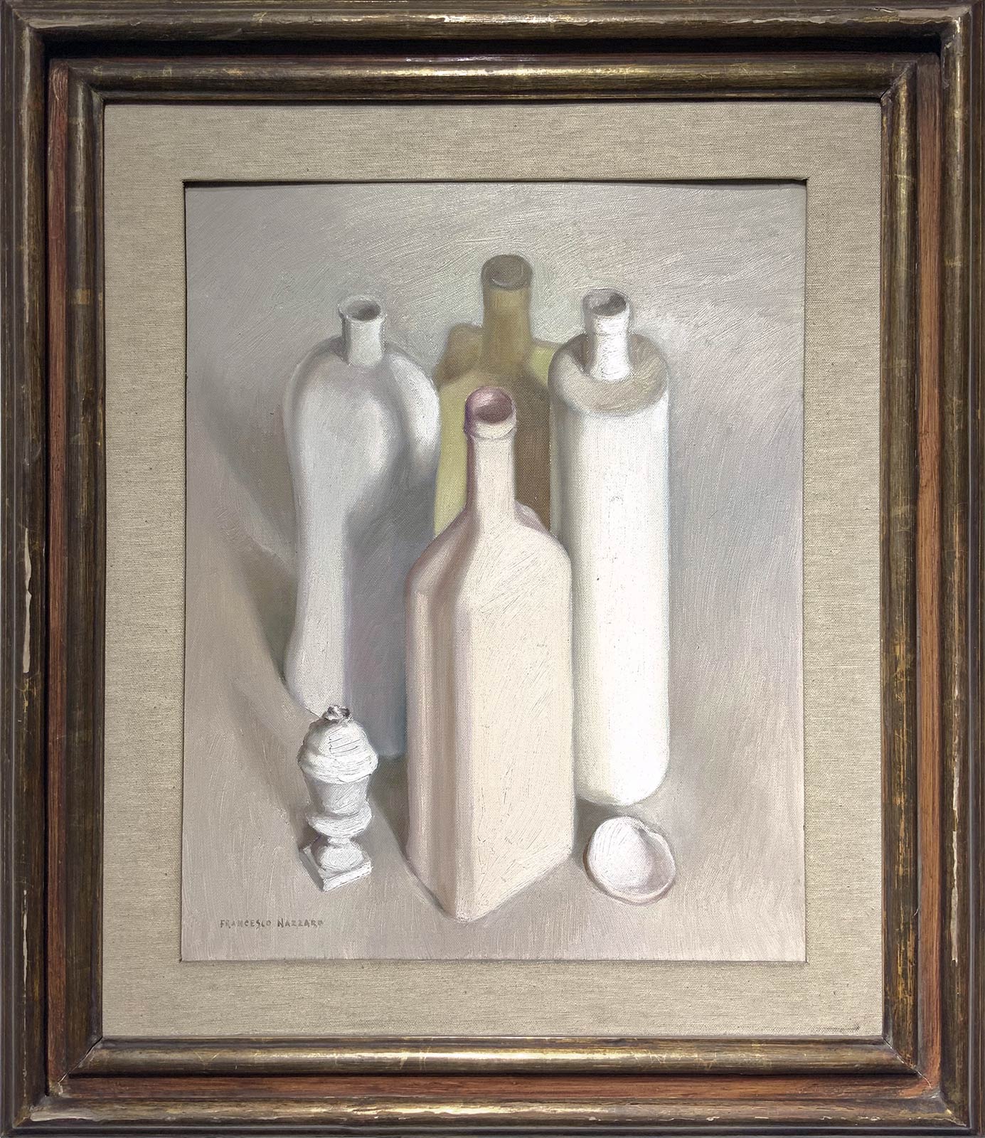 Dipinto ad olio su tela raffigurante natura morta “Bottiglie, composizione verticale”. Cm 40x50, Firmato in basso a sinistra Francesco Nazzaro.