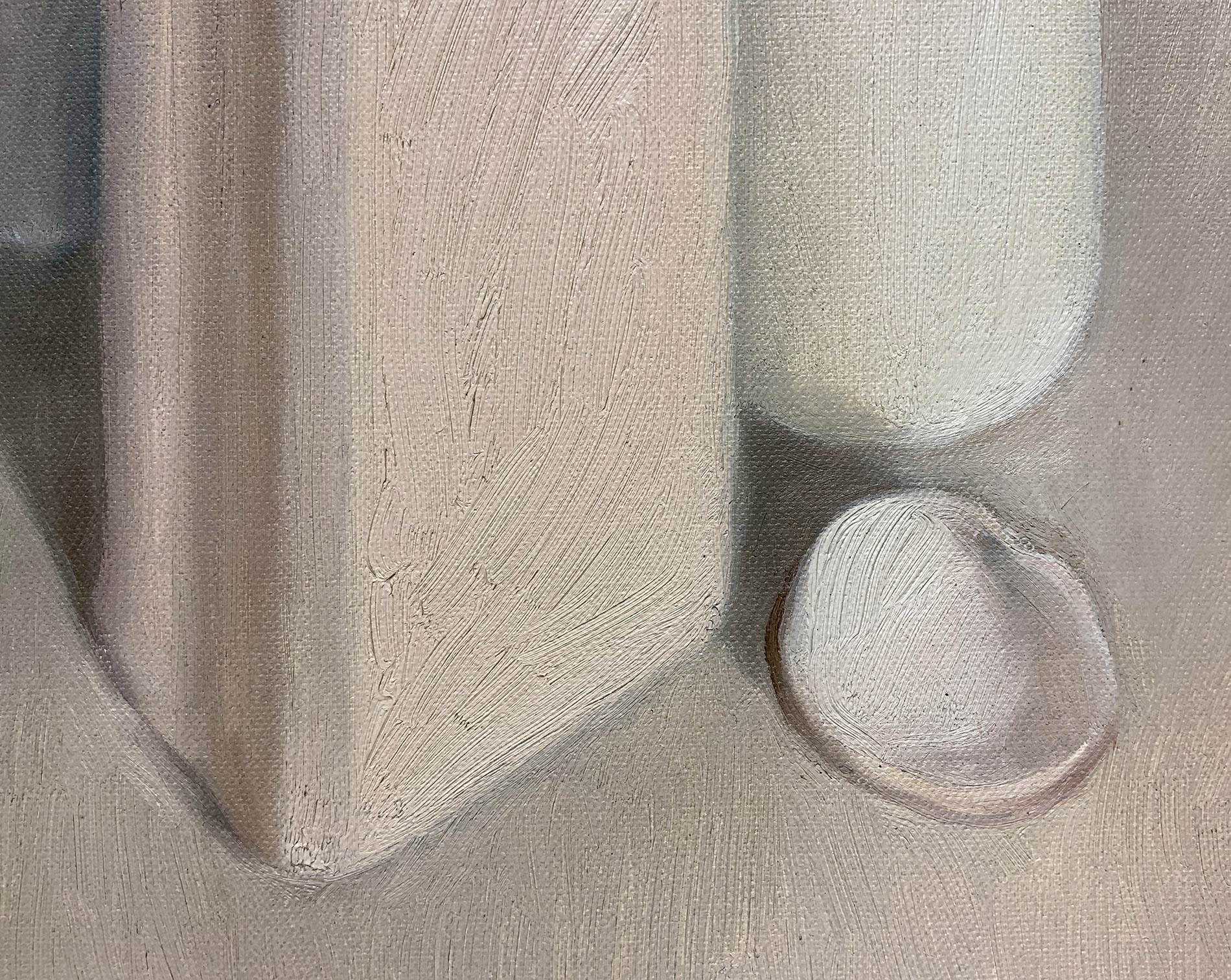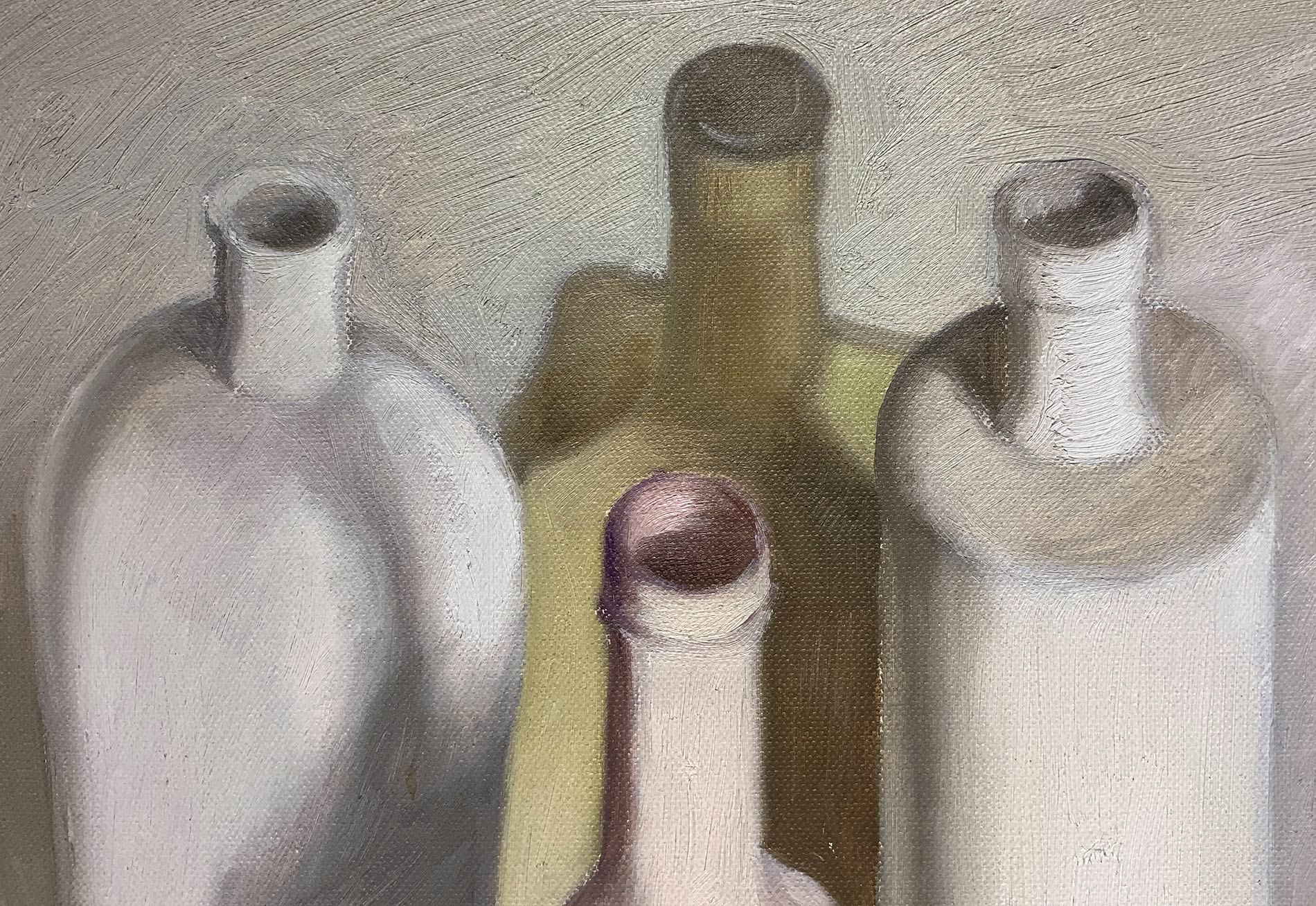 Dipinto ad olio su tela raffigurante natura morta “Bottiglie, composizione...