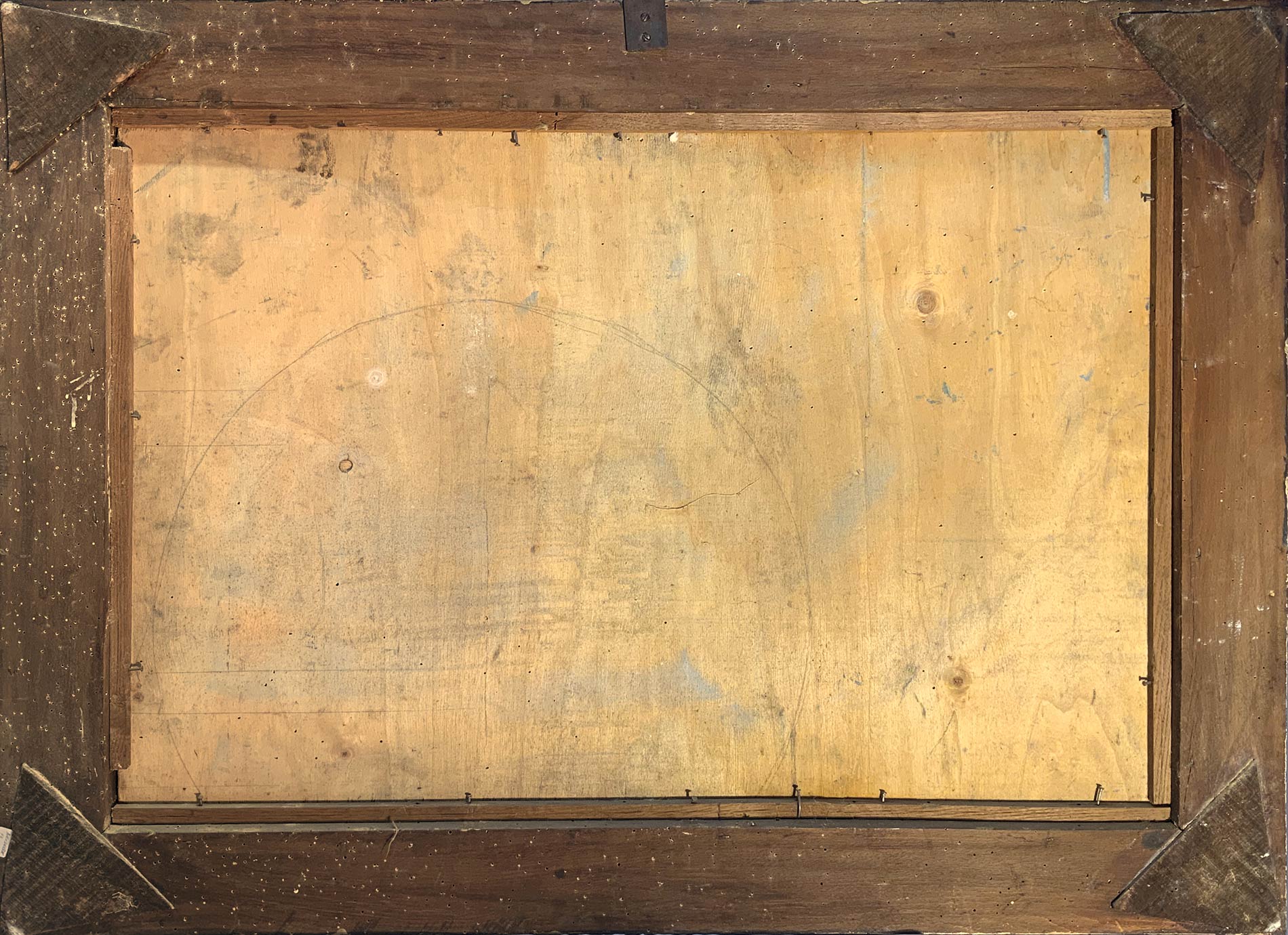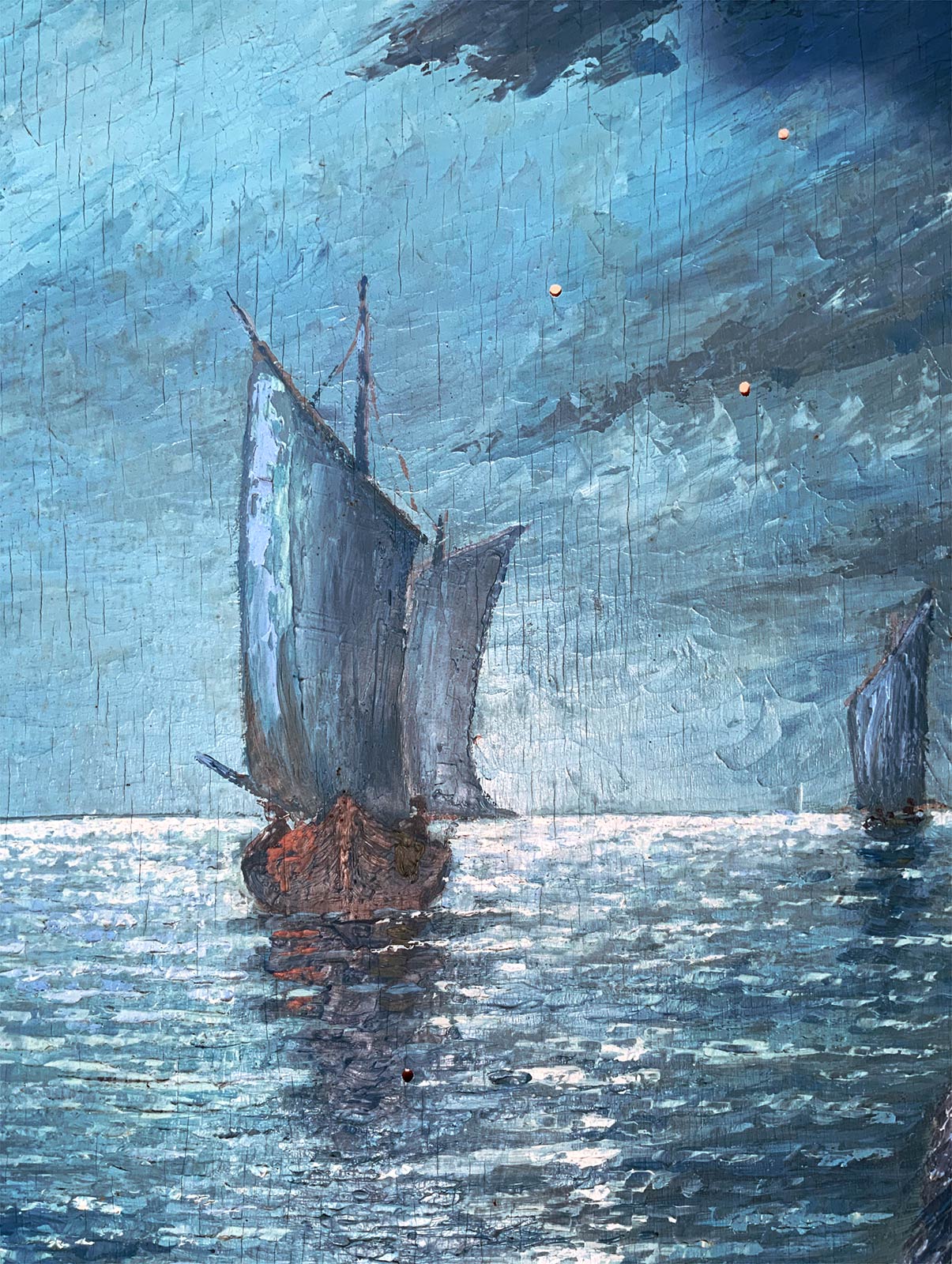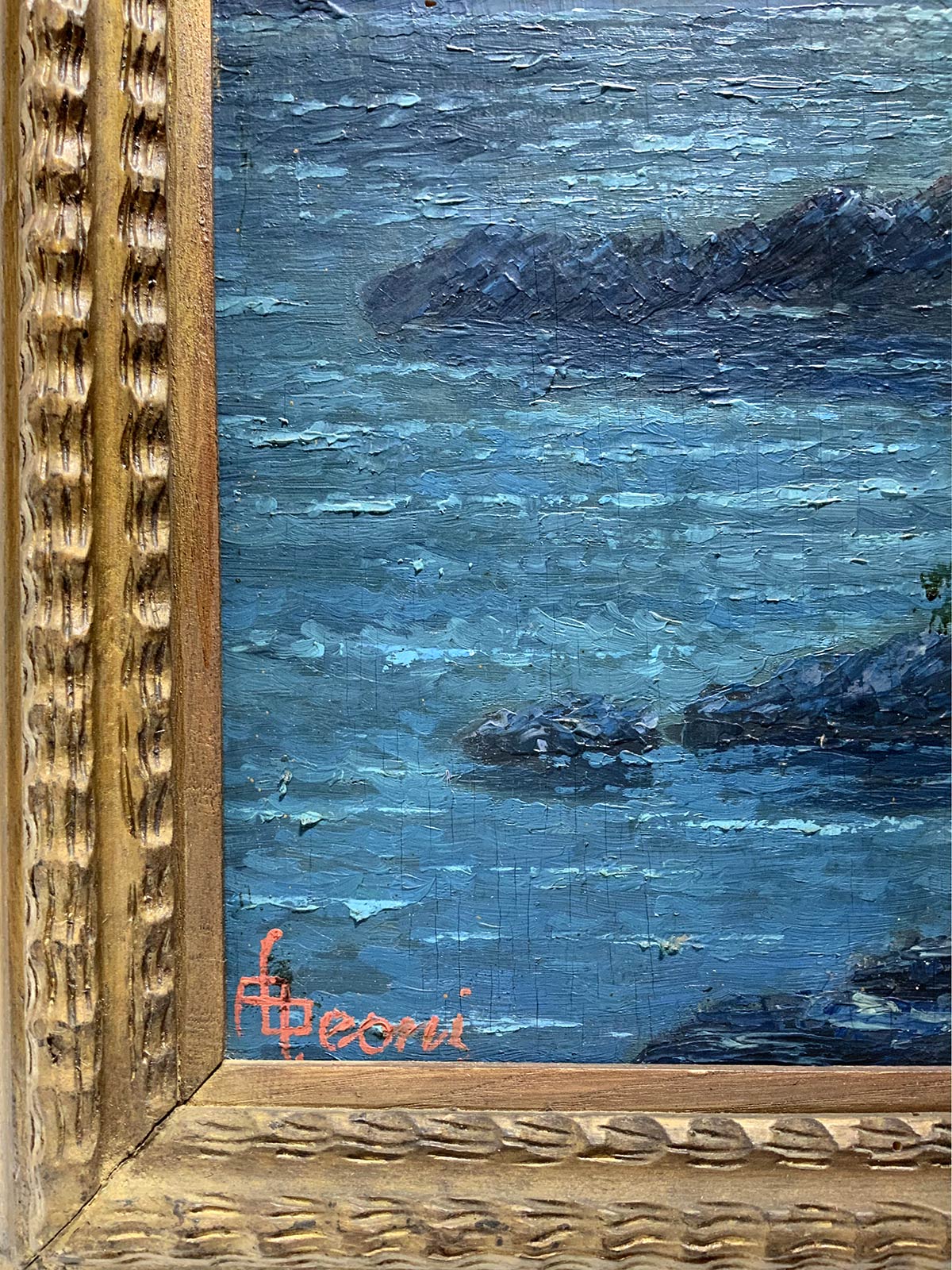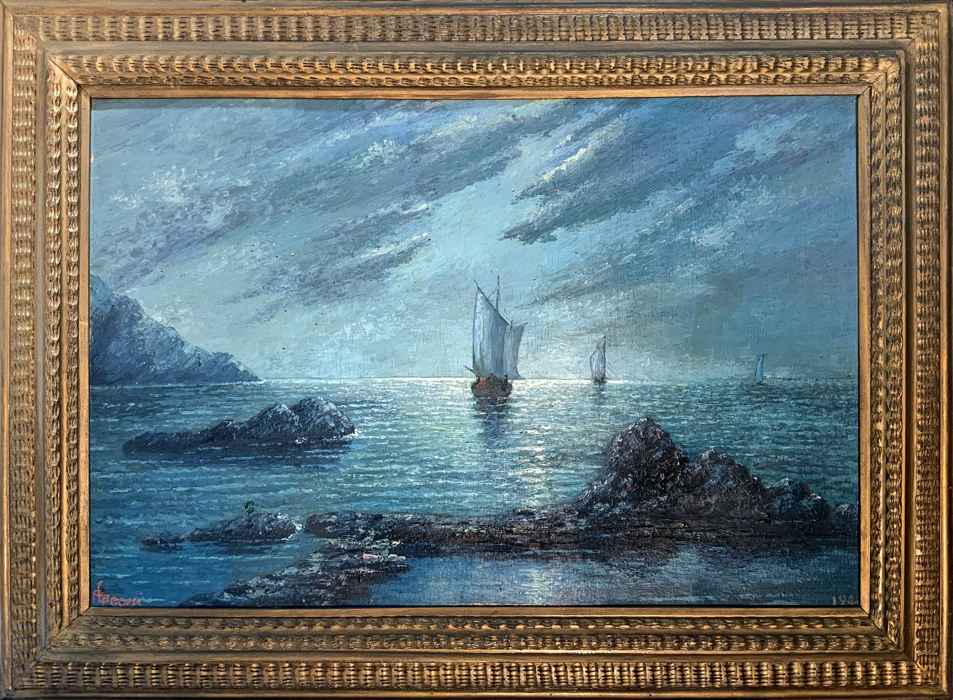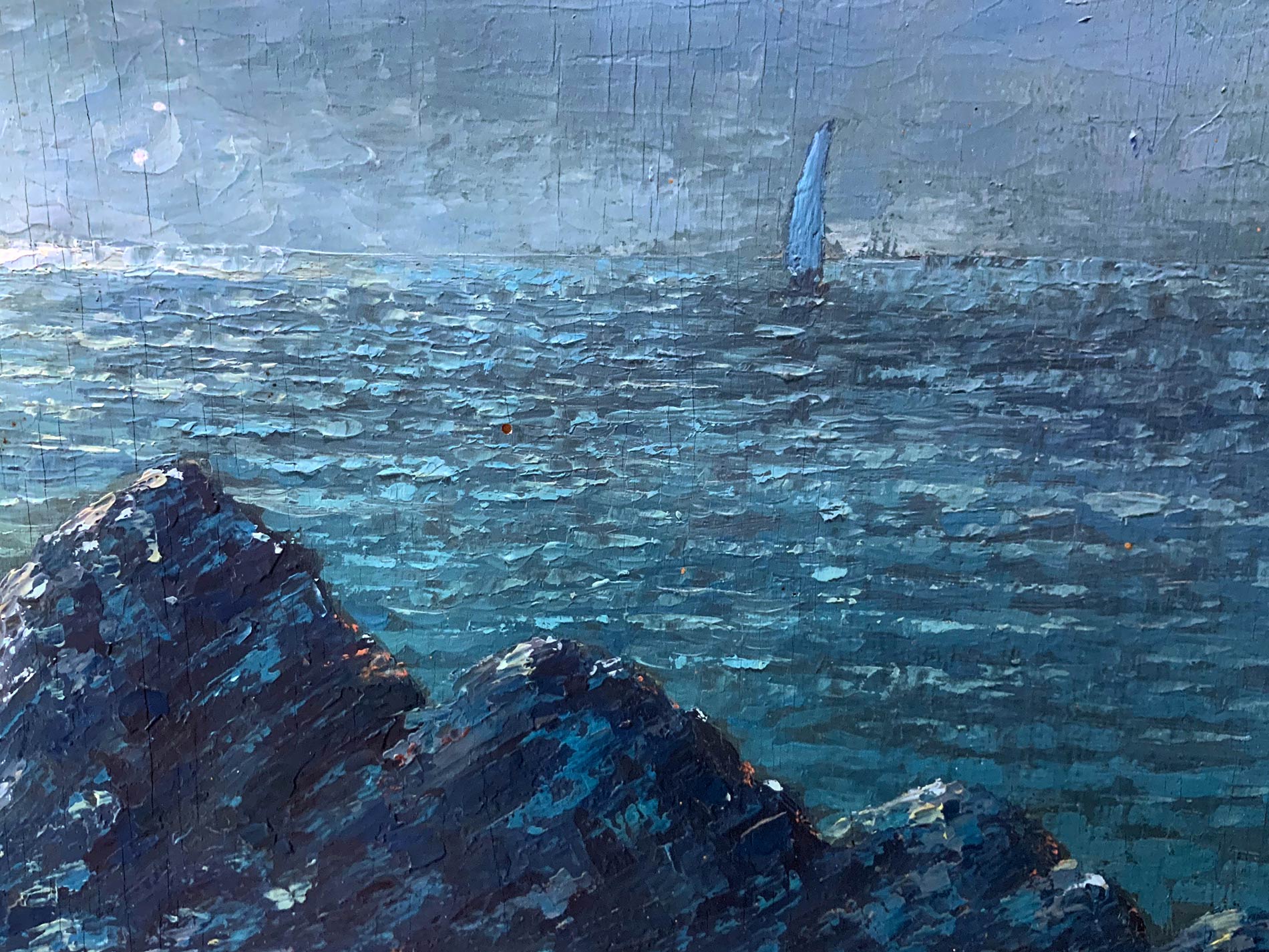 Dipinto ad olio su compensato raffigurante paesaggio marino, XX secolo. Cm 60x90, Deformato.