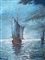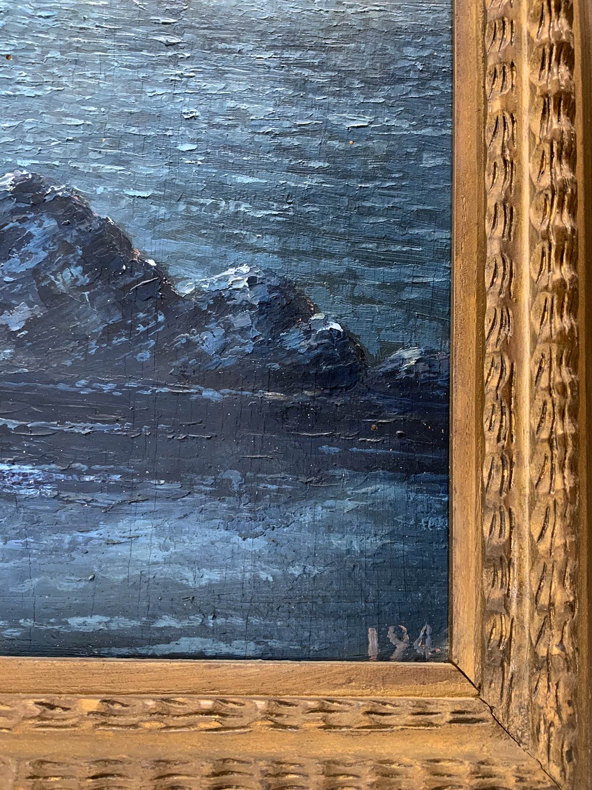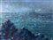 Dipinto ad olio su compensato raffigurante paesaggio marino, XX secolo. Cm...