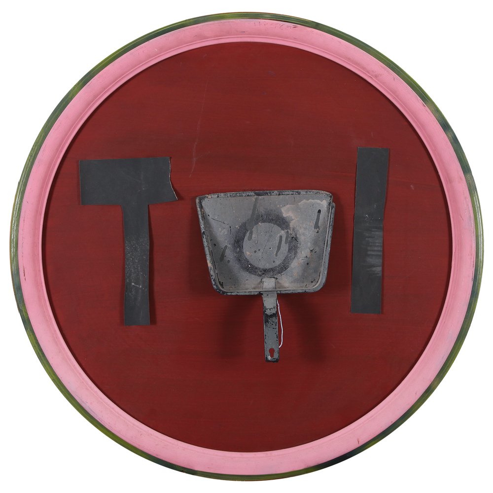SERGIO DANGELO Milano 1932 Toi spray e applicazioni su masonite con cornice invasa diametro cm. 70, opera non firmata, esposta nella mostra presso il Museo D'Arte Contemporanea Multimediale D'Europa Domus Jani, l'opera è stata pubblicata sul mensile Voce di Verona, volume II n. 12/16 luglio/novembre 1990 dove viene fotografata la sala dedicata ai "TOI" con l'artista.