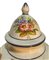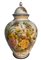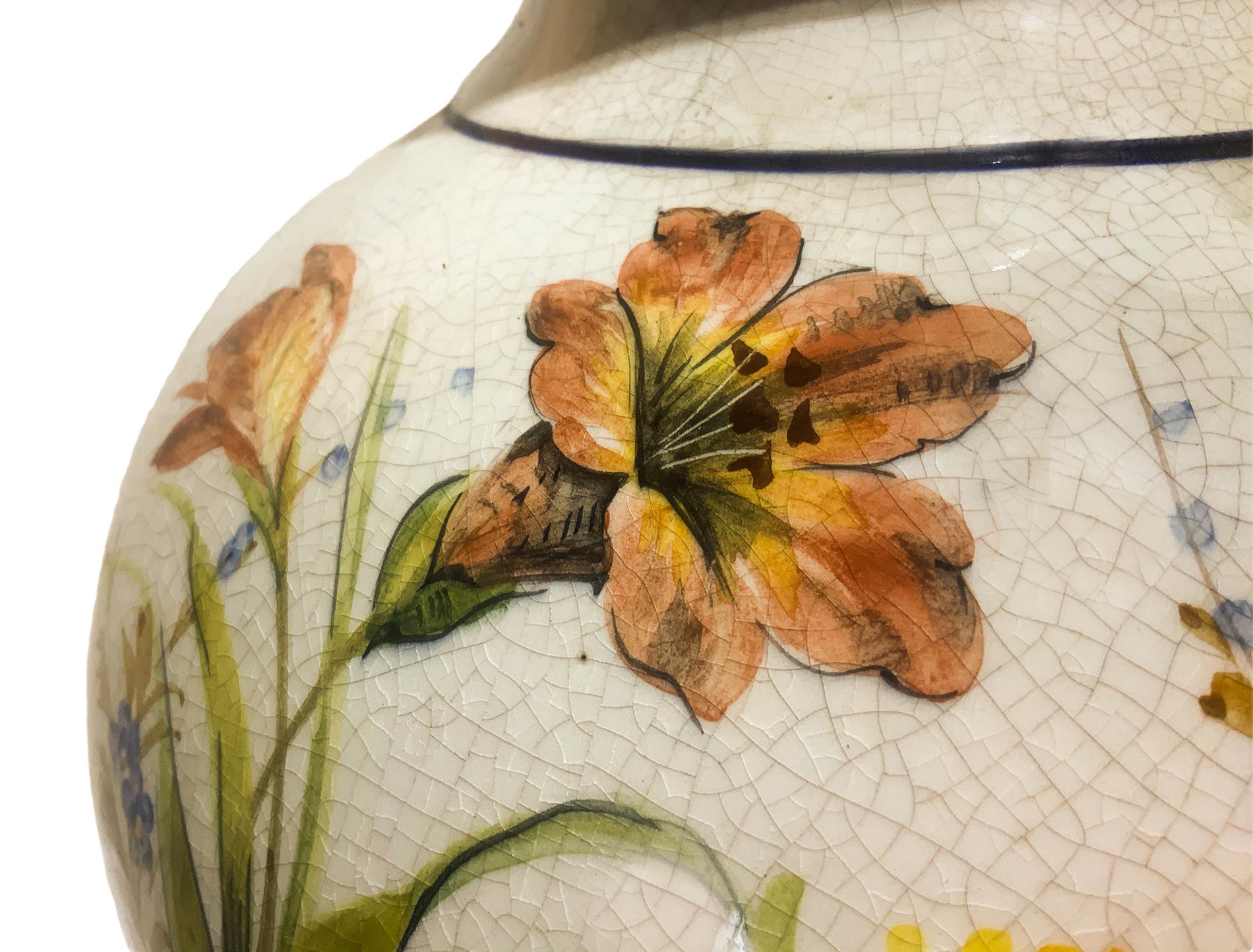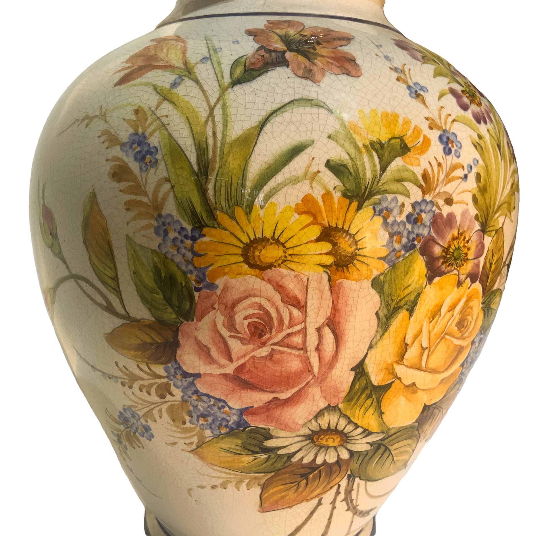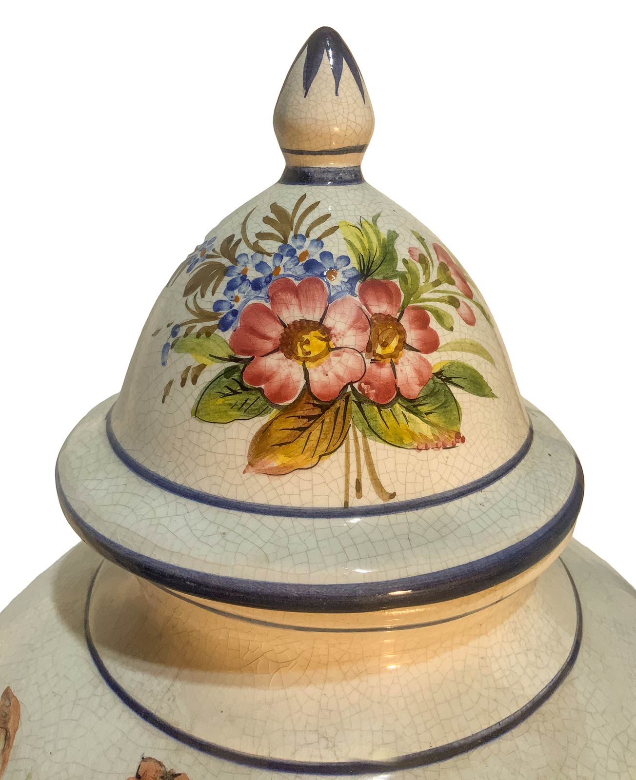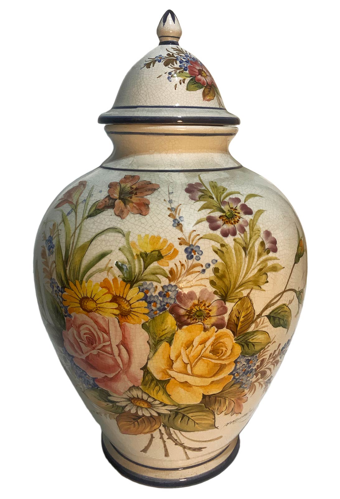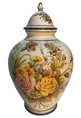 Potiche in maiolica di Bassano. Fondo bianco decorato a fiori. H cm 50